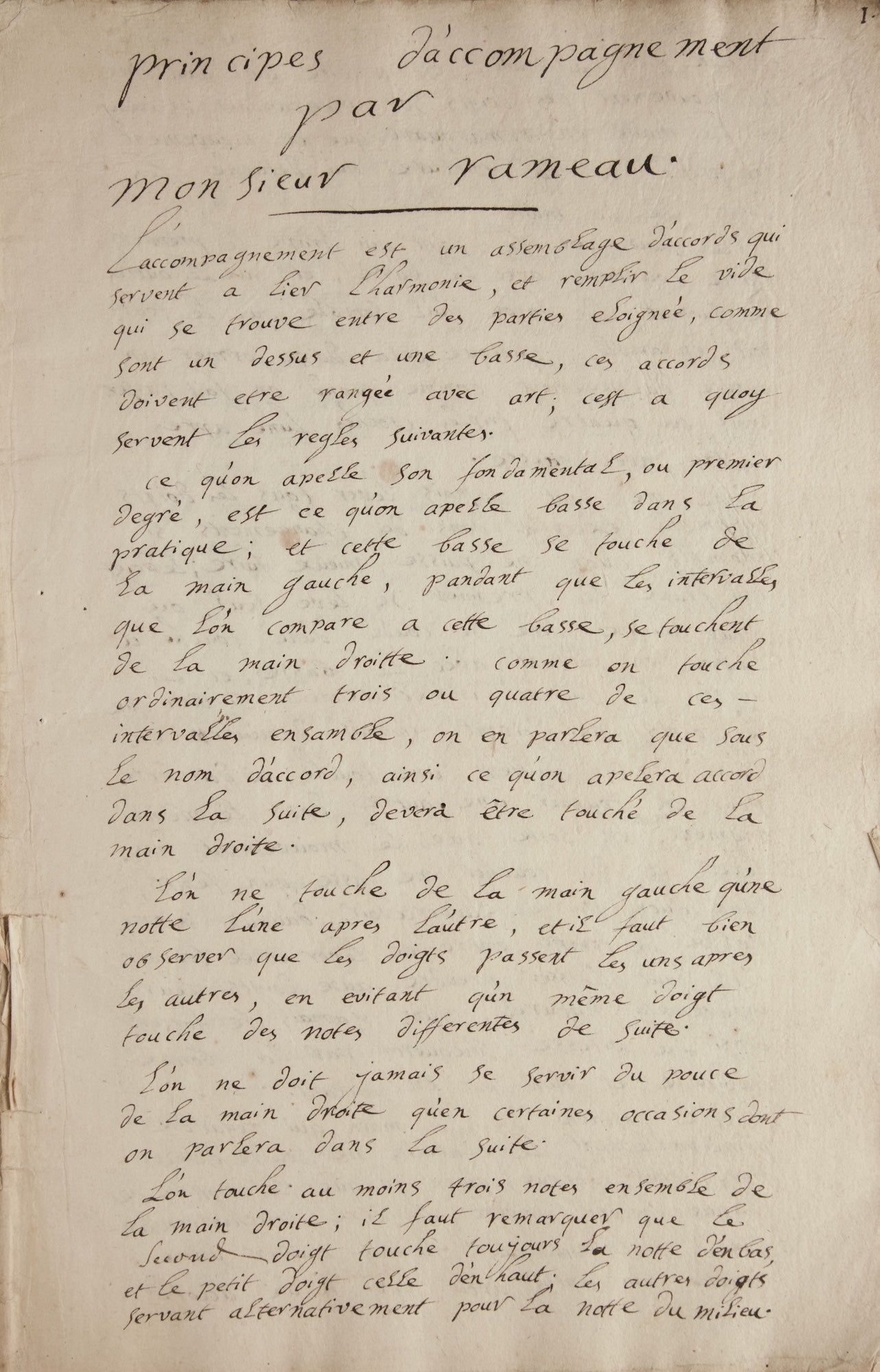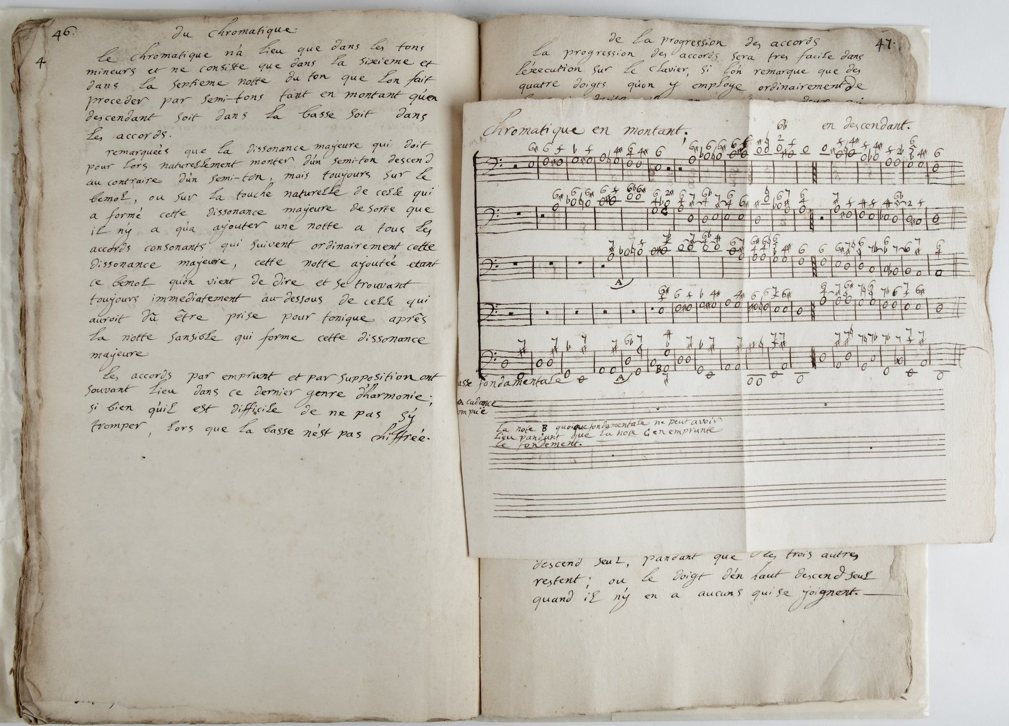 Principes d'accompagnement par Monsieur Rameau. Folio. 1-47, 48-49 (blank), 50 ("explication de quelques termes compris dans le present traite d'accompagnement"), [i] (blank), [i] (headed "Table des chapitres contenus dans le presant[!] traité d'accompagnement" but not completed) pp., 1f. (recto decorative, notational, and textual doodles, verso blank) + 1 folding plate "Chromatique en montant; en descendant" etc. secured with a pin between pp. 46 and 47. Musical example to p. 40. Occasional corrections. Light uniform browning; some edges soiled and slightly frayed; very occasional foxing and small stains; small sewing holes and occasional small tears to blank inner margins. Seems to follow Part IV of the Traité but with textual differences and original elements including tables and diagrams.