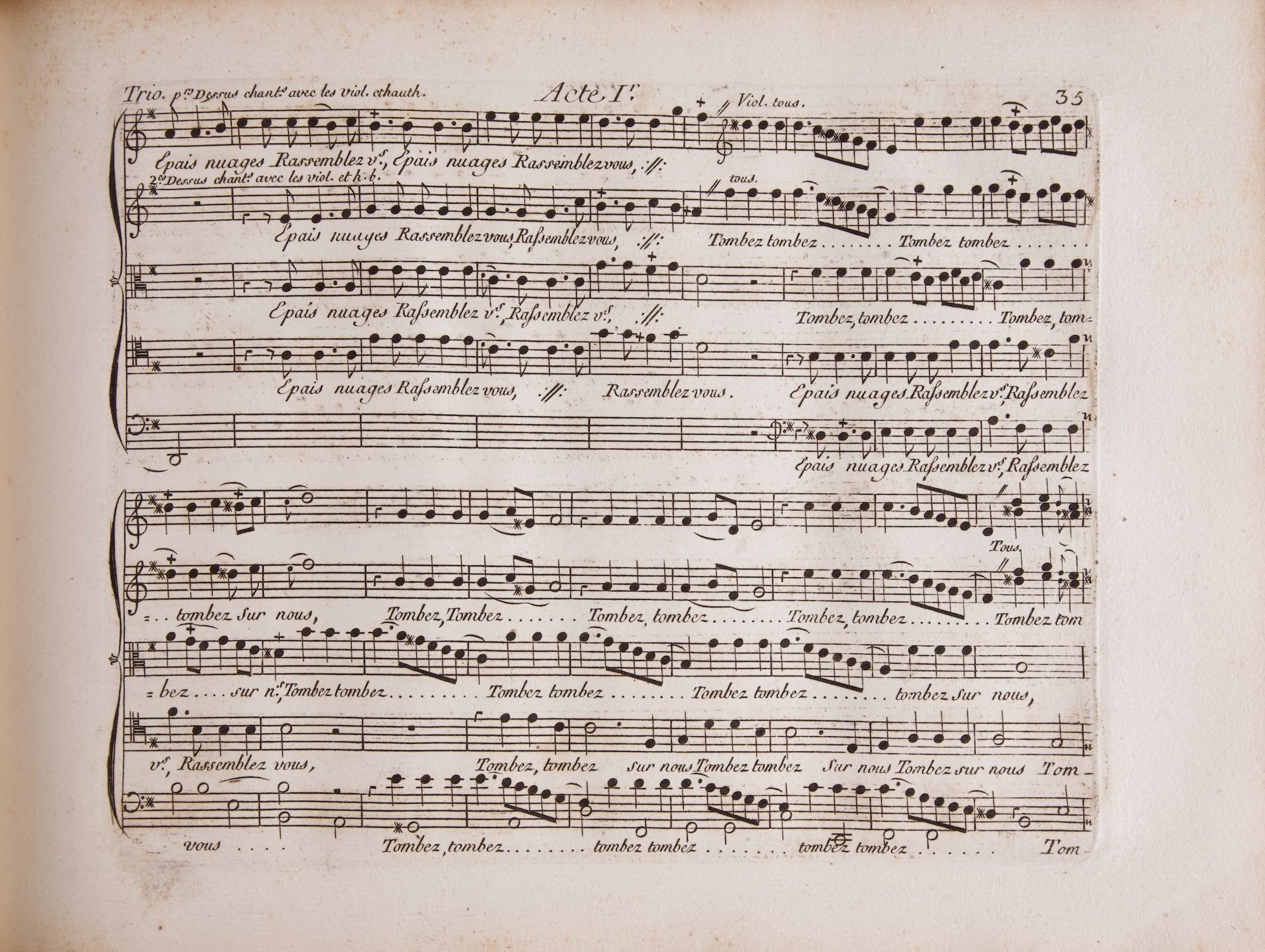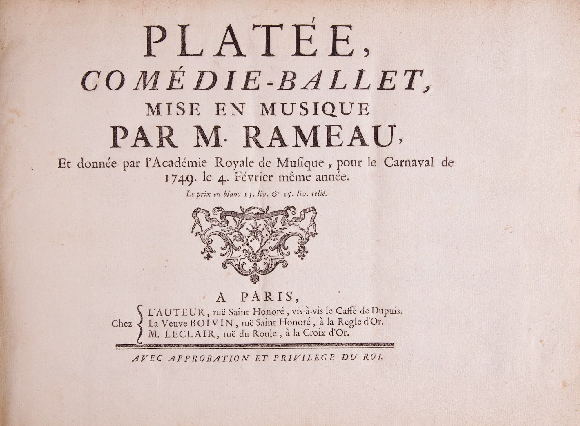 Paris: Chez l'Auteur, ruë Saint Honoré, vis-à-vis le Caffé de Dupuis. La Veuve Boivin, ruë Saint Honorè, à la Regle d'Or. M. Leclair, ruë du Roule à la Crois d'Or. Avec Approbation et Privilege du Roi, 1749. Oblong folio. Contemporary dark tan mottled calf with raised bands on spine in decorative compartments gilt, title gilt, marbled endpapers. 1f. (recto title, verso blank), 38 (prologue), 125 (acts i-iii), [i] (blank) pp. Title typeset, music engraved.