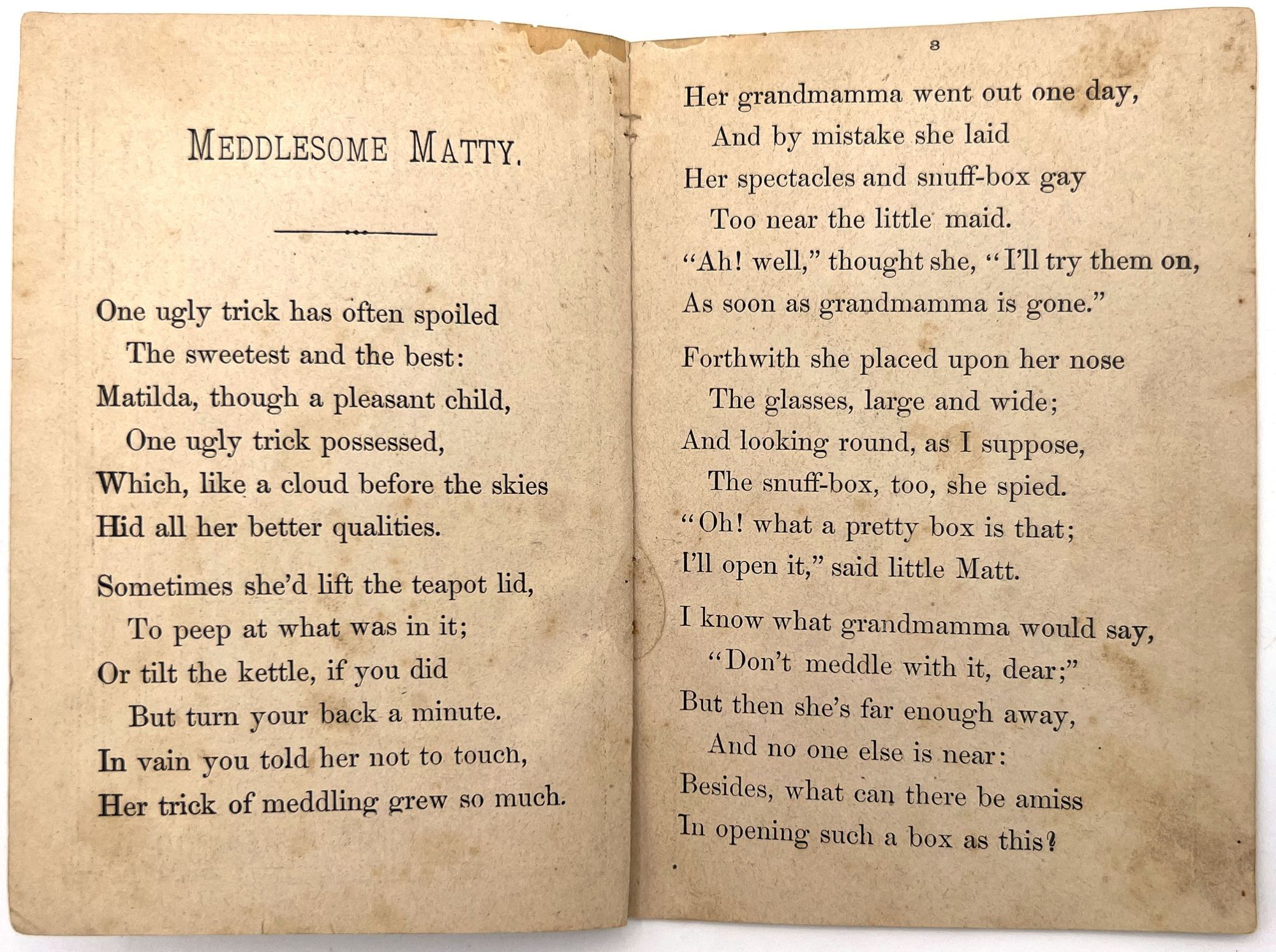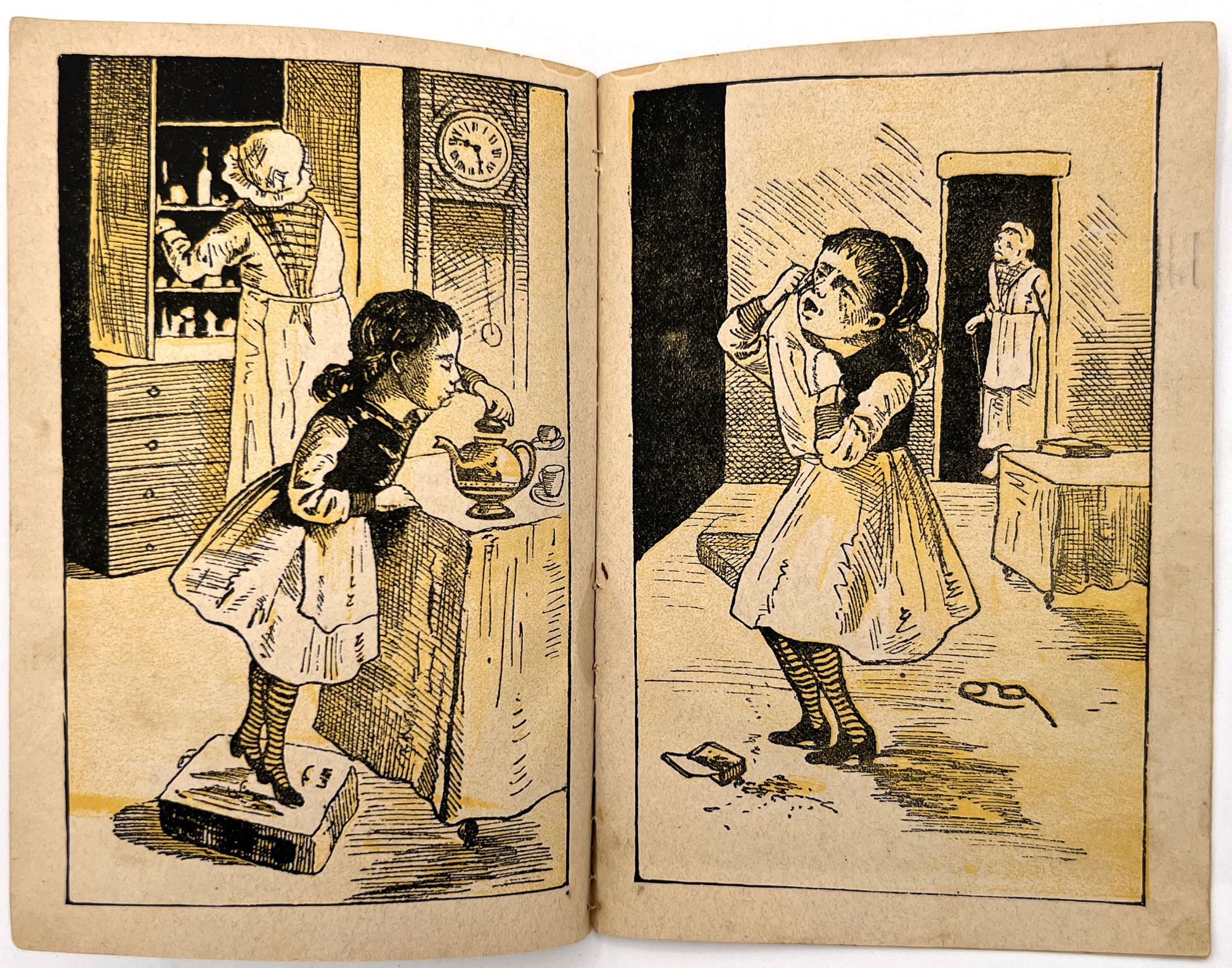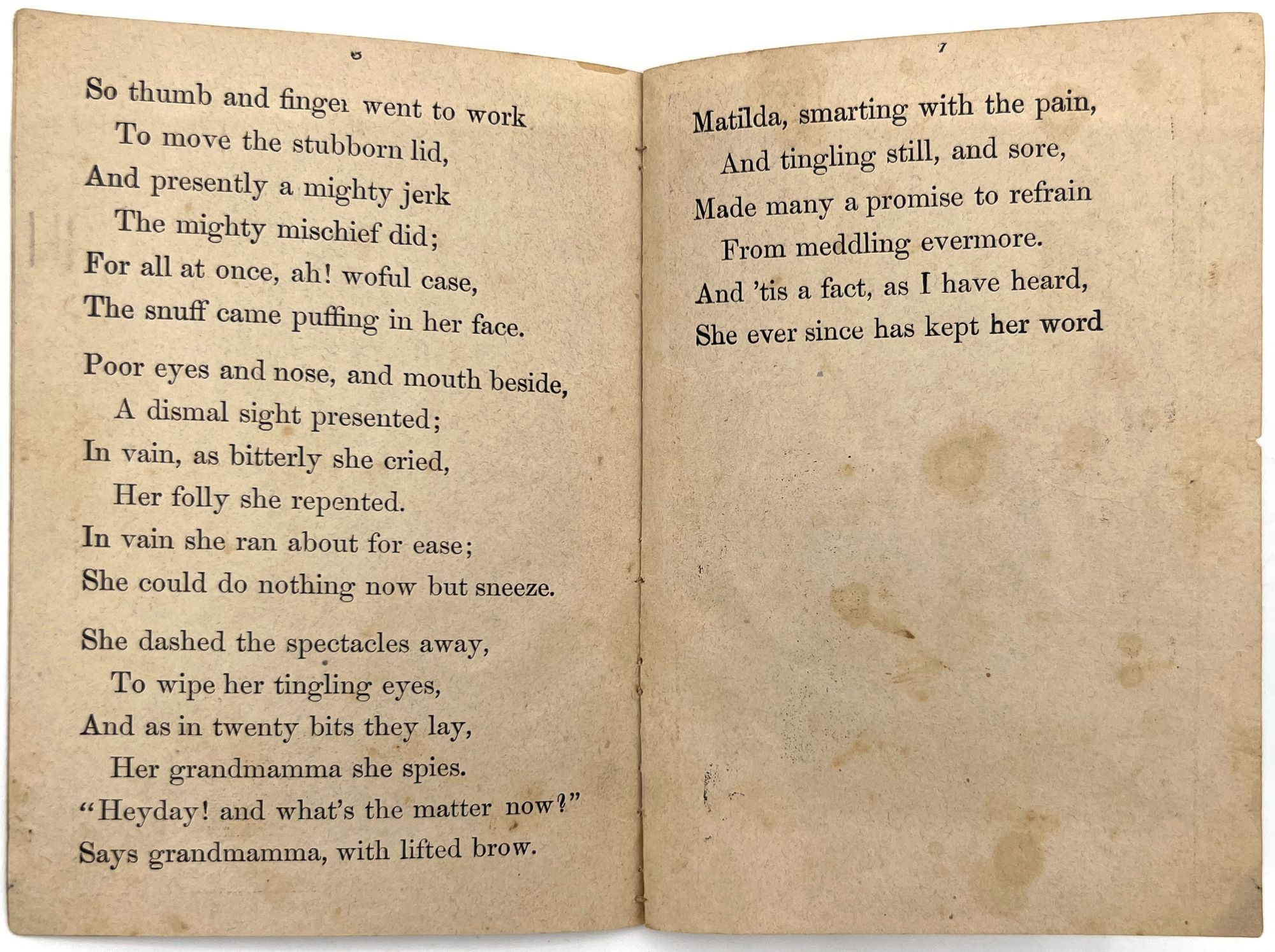 Cincinnati, Ohio: Peter G. Thompson Pub, 1885. Very good. Some toning, dust soiling.. A scarce chap book in original illustrated wrappers, part of "Aunt Mollie's Series", about a little girl who opens a snuff box against her grandmother's instructions. After smarting from the pain and embarrassment of inhaling a cloud of snuff, the little girl vows to always obey her elders. Features full-page illustrations depicting the story.