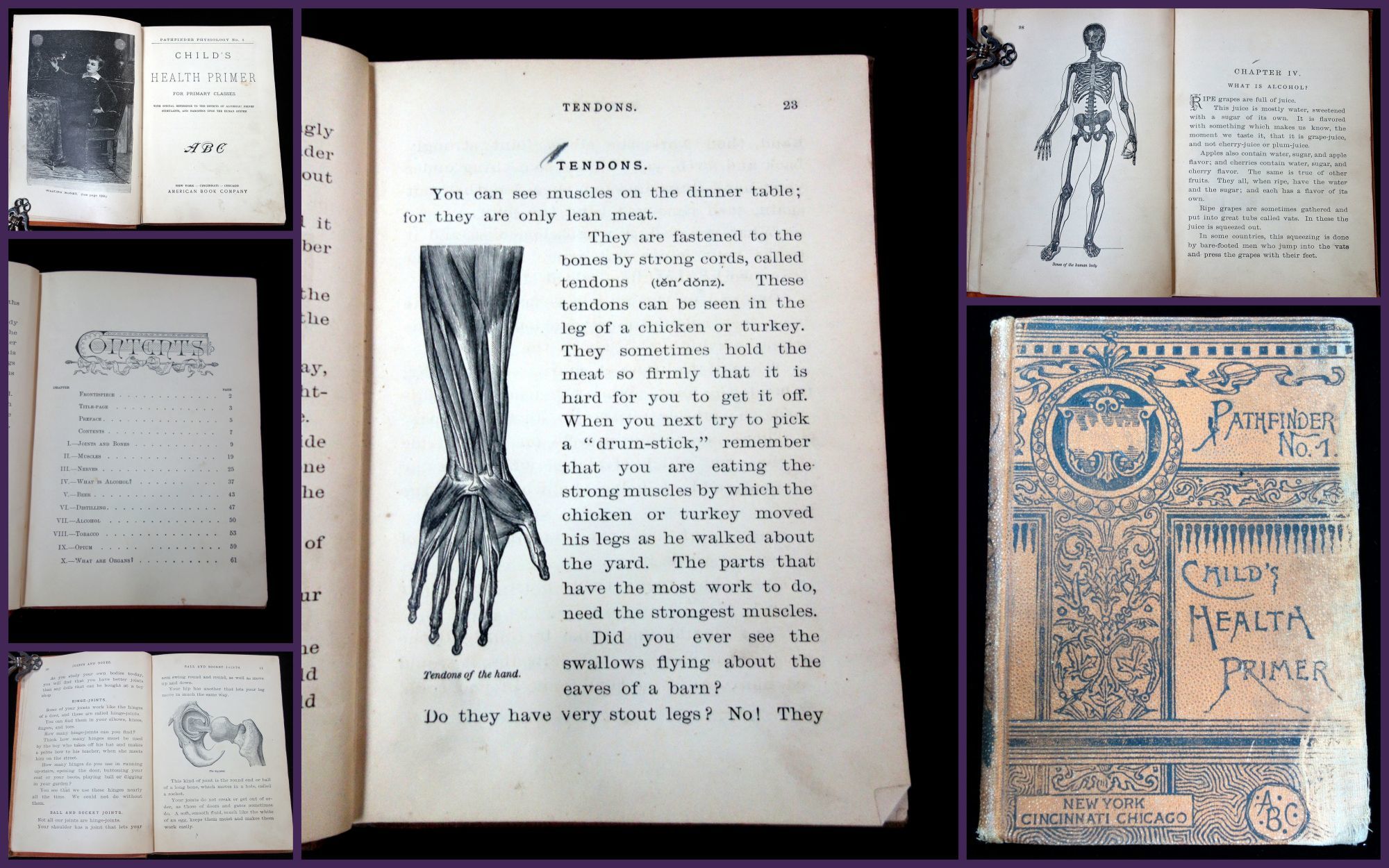 New York: American Book Company, 1885. 127 pp, hardcover, tan pebbled cloth over board with decorative stamping. The sole purpose of this book is to teach children the harmful effects alcohol and narcotics can have on the human body. The book first gives the reader a relatively basic anatomy lesson, before discussing alcohol and drugs effect each part of the human body. The book contains numerous black and white illustrations and diagrams of the human body. Measures 7 1/4" x 5 1/4" Cover wear, particularly in the right side of the front cover. Inscriptions by several different previous owners. The last page of the index has been cut and is missing the bottom half.