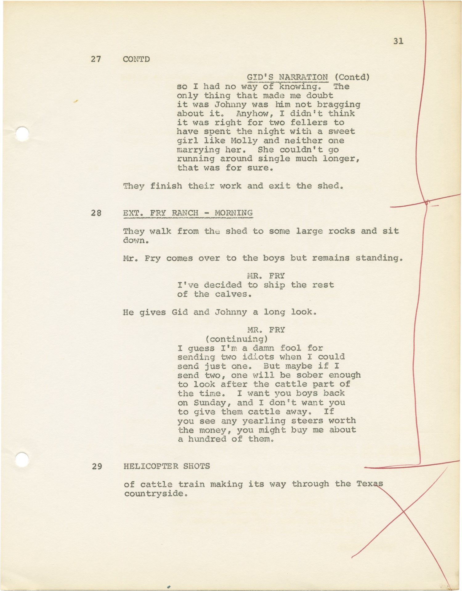 Mustard Studio Duplicating Service titled wrappers. Title page present, with credits for screenwriter Steve Friedman and author Larry McMurtry. 136 leaves, with last page of text numbered 135. Mimeograph duplication, rectos only. Pages Near Fine, wrapper Very Good plus, lightly edgeworn, bound with two gold screw brads.