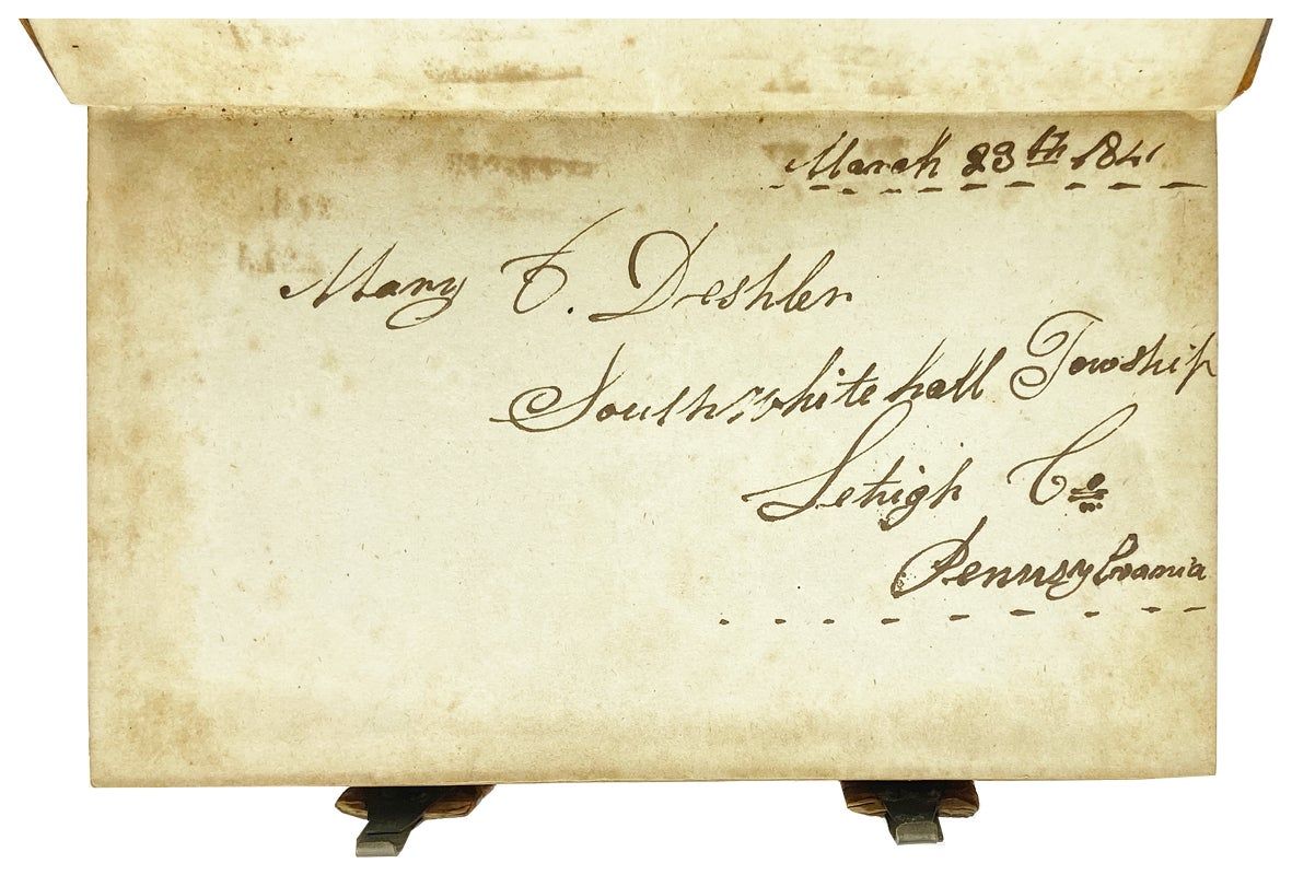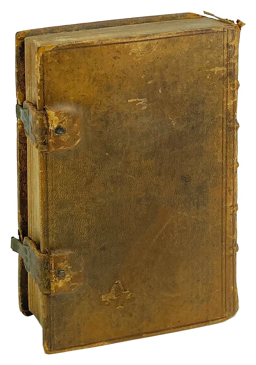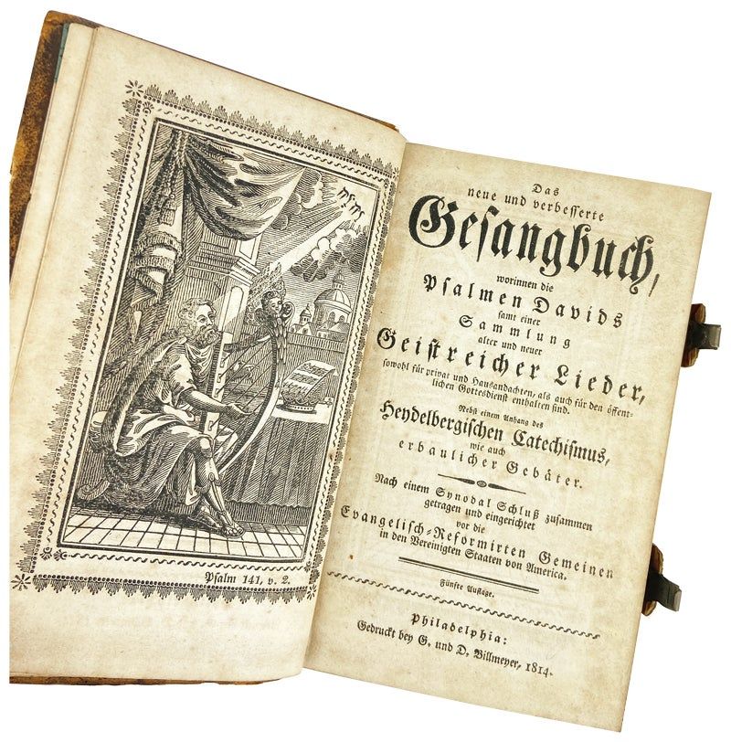 Philadelphia: G. und D. Billmeyer, 1814. Very Good. Philadelphia: G. und D. Billmeyer, 1814. Reprint. 12mo. [iv], [1], 2-148, [vii], [1], 2-585; [9] pp. register; [1], 2-26 pp. catechism. Contemporary sheep with two metal clasps; five raised bands. Light wear to edges; minor scuffing; chipped at spine ends. Binding sound. Allentown bookseller's ticket in German to front pastedown; ownership inscription of Mary Deshler of Lehigh, Pennsylvania dated 1841 to preliminaries; interior else tone but unmarked; Very Good.