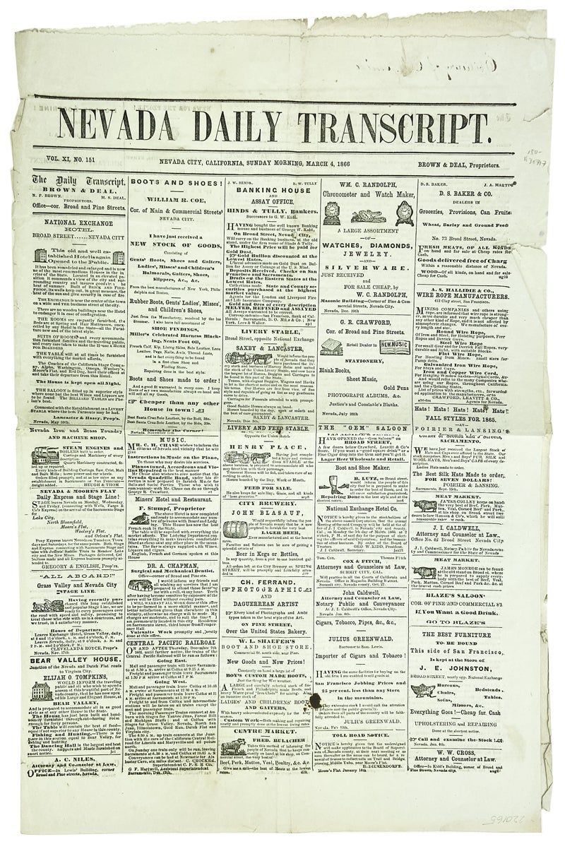 Nevada City, CA: Brown & Deal, Proprietors, 1866. Very Good. Nevada City, CA: Brown & Deal, Proprietors, 1866. Folio (45cm); 4pp. printed in five columns on newsprint. Chips and tears to edges; general staining; folds. Ink annotation to page 2, else unmarked and text legible throughout. Scarce newspaper from the California Gold Rush town; includes advertisements, local and national news, an obituary for E.W. Smith, a local judge, as well as a brief story on a gunfight between two "Chilenos." No copies in retail as of September 2024.