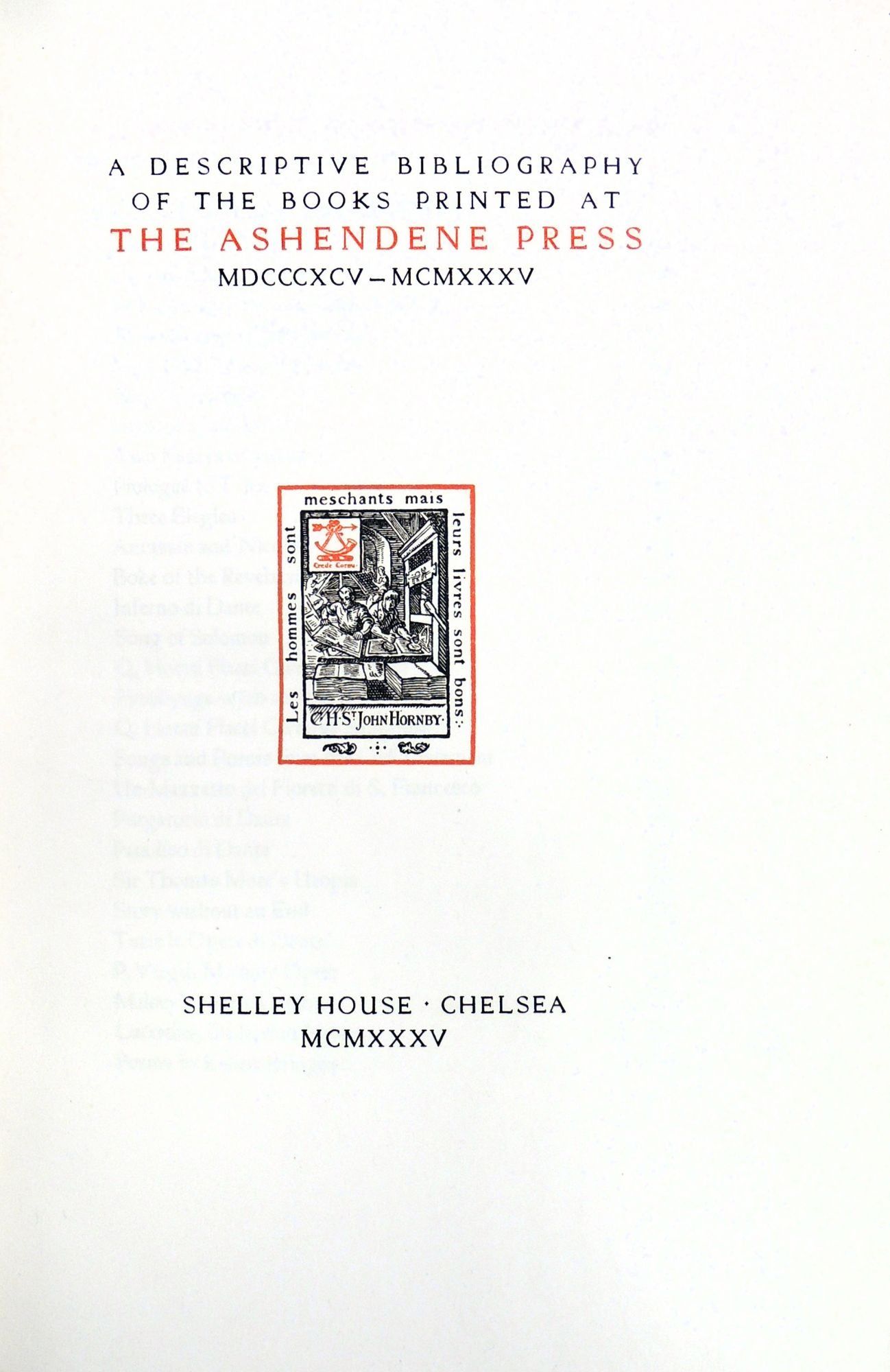 Shelley House, Chelsea: Ashendene Press, 1935. Hardcover. Fine in very good binding. Hardcover. Number 134 of 390 copies, numbered and signed by St J. Hornby. This magnificent bibliography of one of the greatest British private presses, along with Kelmscott and Doves, was the last book to be to be issued by the press. It was finished in February, 1935, forty years after the first book printed at the Press. This first title was The Journal of Joseph Hornby, published in February 1895. Joseph Hornby was the printer's grandfather. The printer and proprietor of the press, the businessman C.H. St John Hornby (1867 - 1946), wrote an interesting foreword to the bibliography. He describes the beginnings of his Press, noting that the Press was the hobby of his leisure hours, where he worked entirely alone for many years. This, he explains, is why the output of the Press was so small in comparison with the Kelmscott and Doves Presses. He notes that William Morris greatly influenced him, and that he treasured the memory of spending an afternoon with him at Hammersmith in 1895.
