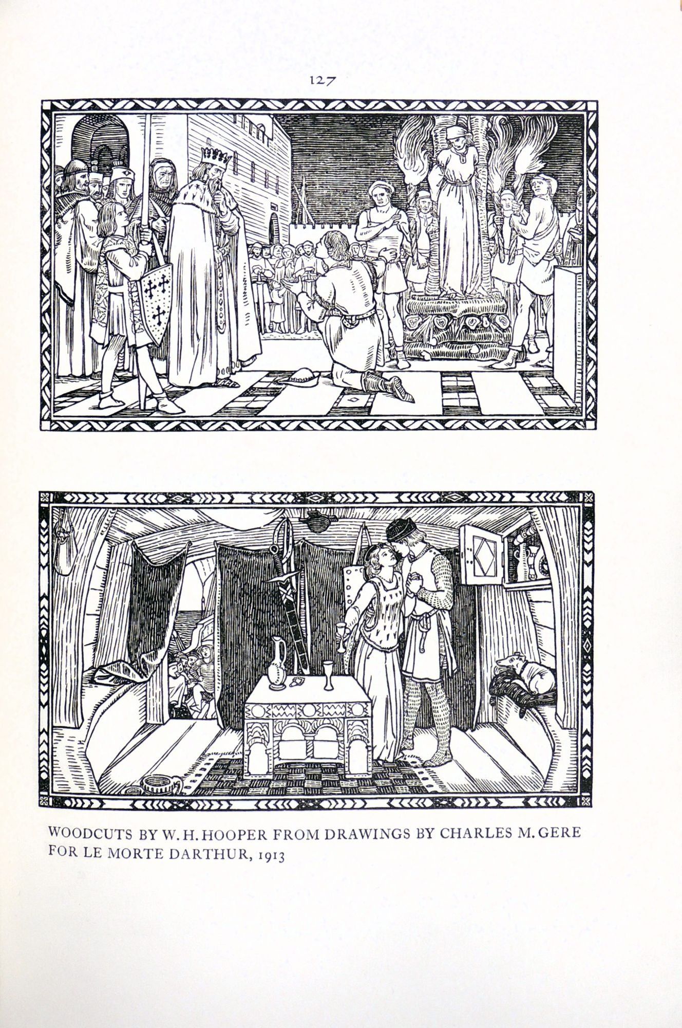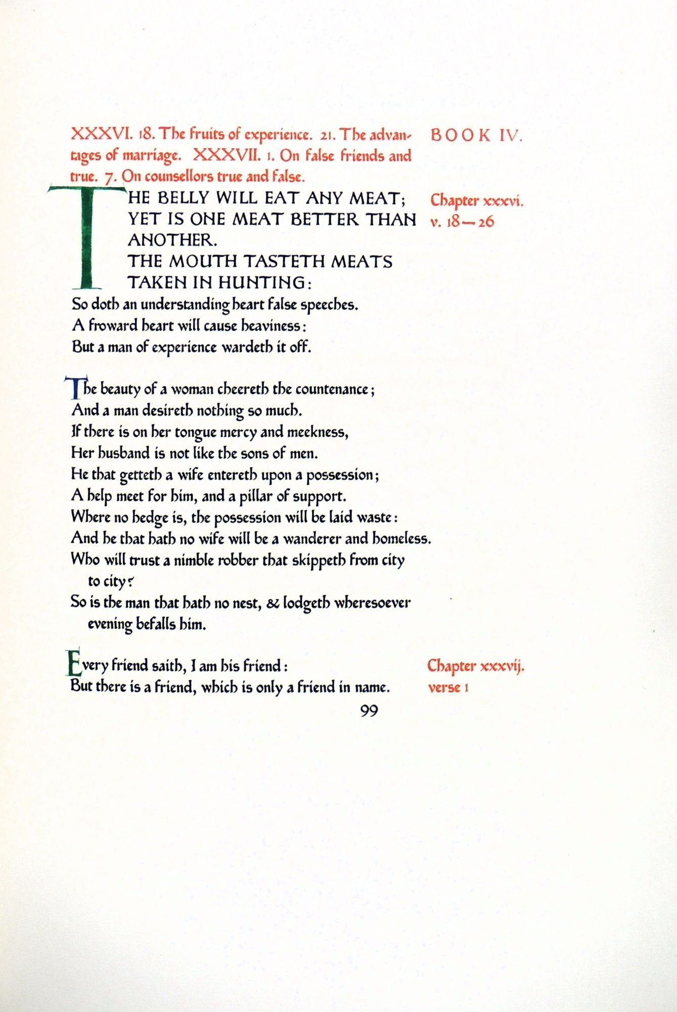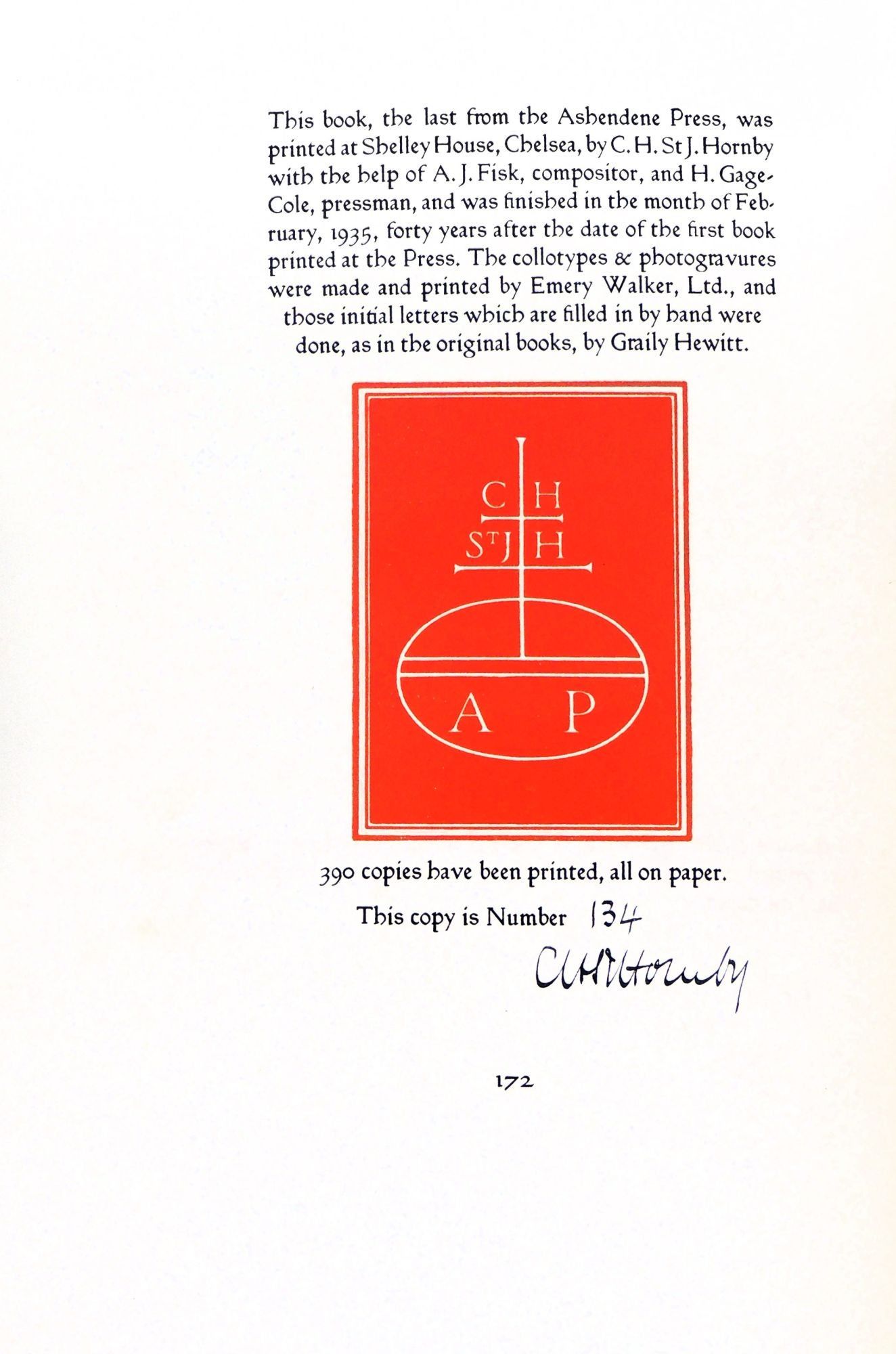 Hornby discusses in detail his efforts to use the finest papers, inks, and types. He finishes with a note saying that while he did not collate the volumes, he wrote all of the detailed descriptions. He also noted that the many specimen pages are not actual facsimiles, but accurate resettings of the originals. For each book in the bibliography there is a copy of the colophon, the collation, and the description giving the type of paper, the colors of ink, the presence of large initials designed by Graily Hewitt, and the number of copies printed and for what price they were for sale. Following the bibliographic listings of the books, there is a section with images of wood engravings done for the press from drawings by Charles M. Gere, Margaret Gere, R.Catterson Smith, Gwendolen Raverat and Noel Rooke. This section is followed by a section with specimens of initial letters designed for the press by Graily Hewitt, Eric Gill and Louise Powell, that includes printer's marks, water marks, and examples of title-pages. There is also a section with illustrations of some of the bindings of the press including both special bindings and the bindings of issue. Finally, there is a section showing specimens of the founts of type used by the press and a chronological list of the books printed at the press, the number of copies printed, and the prices of those offered for subscription. After the colophon, two sheets of errata are present, one bound in and one loosely inserted.