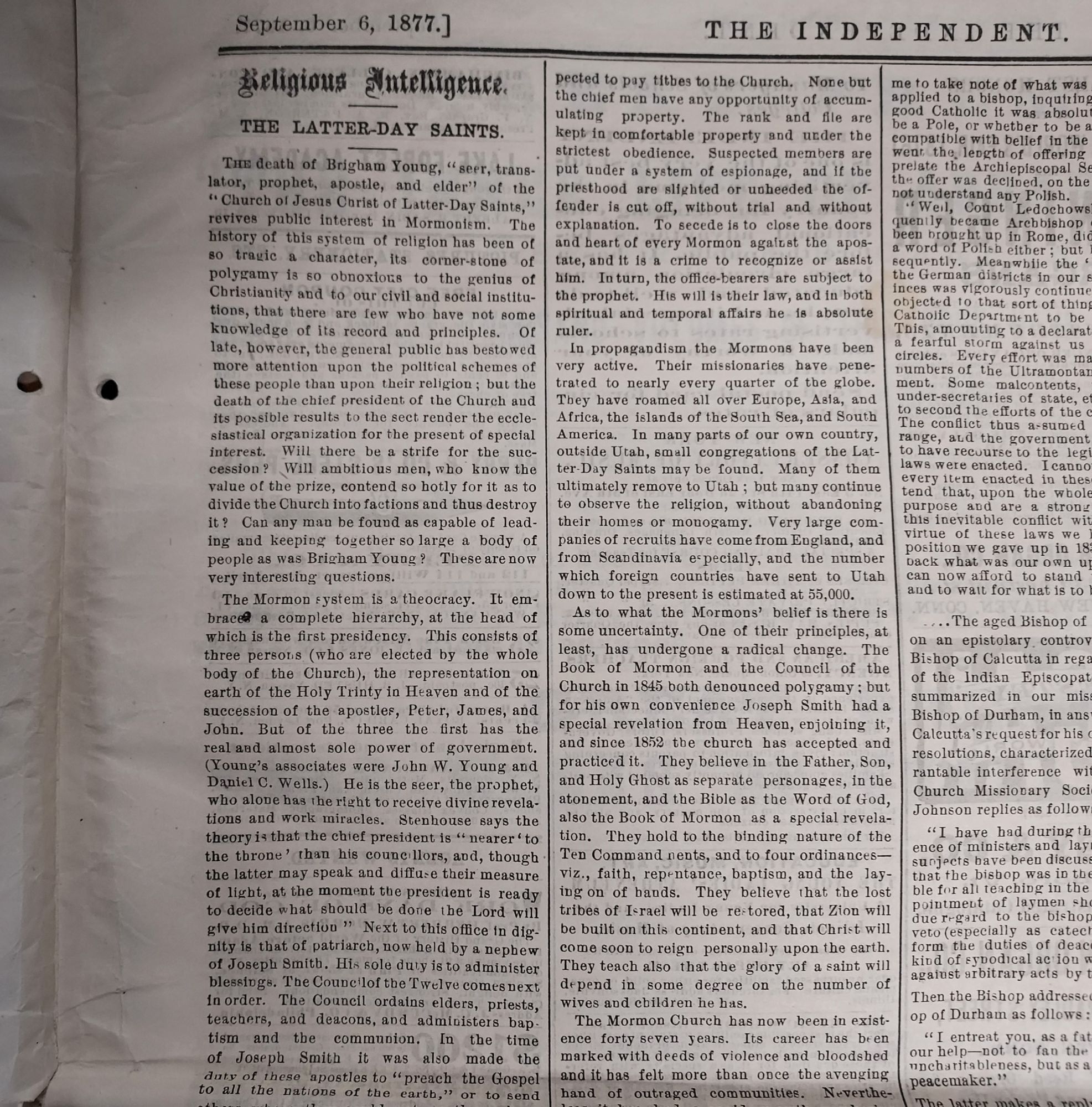 New York: Henry C. Bowen Publisher. Ephemera. Good. Side folding tabloid journal. Disbound from a larger work. 32pp. "The Independent" was a long running newspaper that promoted Congregationalism and advocated for abolition and women's suffrage, among other social issues. Of note in this issue are two somewhat lengthy pieces on Mormons, Mormonism, and Brigham Young. The first, titled "The Latter Day Saints," opens with the death of Brigham Young and focuses primarily on the religious practices and beliefs of the Mormon community, as well as its use of trials and other things to govern its adherents. The second article, "Brigham Young and Mormonism," rails against Brigham Young and urges the government to pass a law against polygamy. Binding holes along left edge. General toning, minor soiling, and foxing to the paper. Some spotting/staining to the front page. Paper a bit brittle. Haphazard fold crease present. Mormon content: P. 13 and P. 16.