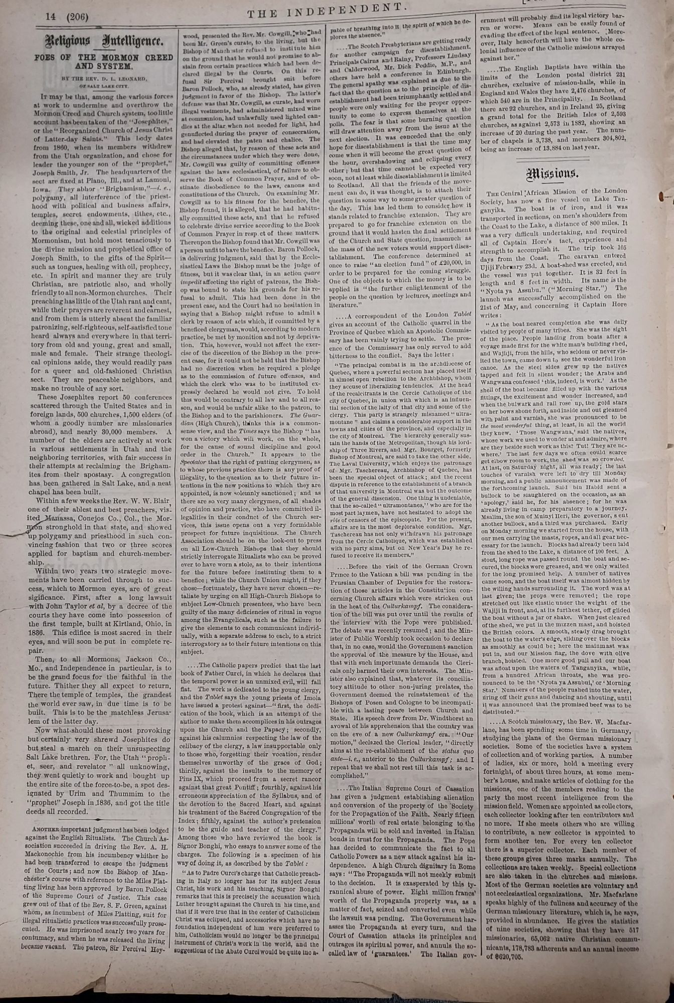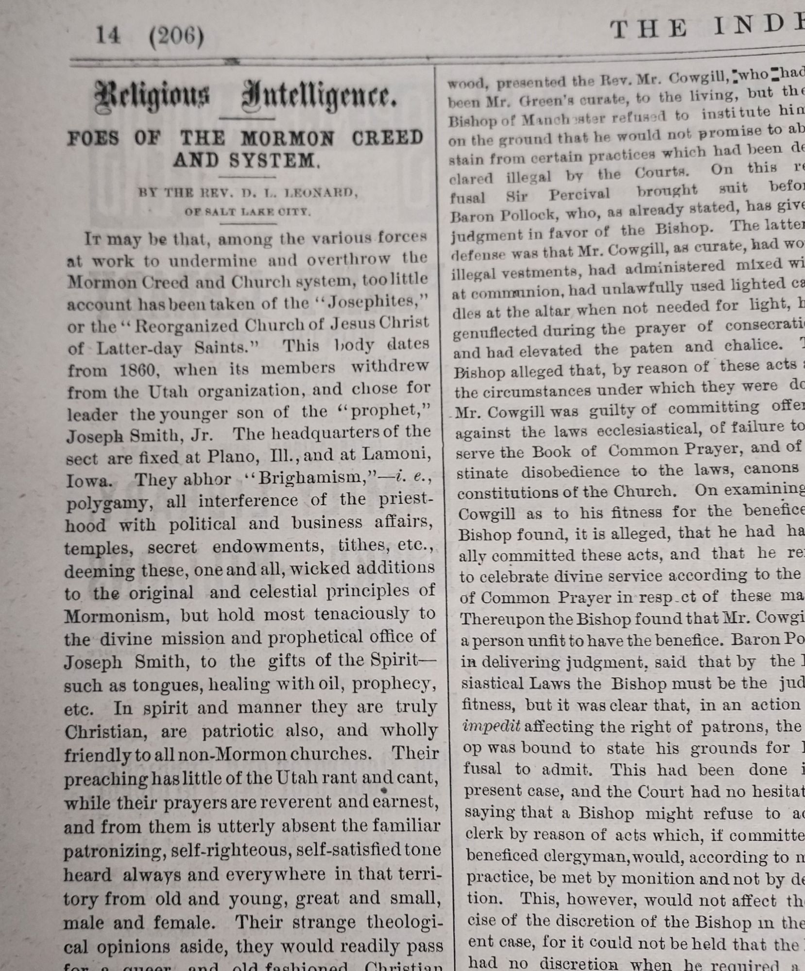 Ephemera. Very Good Minus. Periodical. 32pp. Slim folio [41 cm] With 3 holes punched through the pages at spine margin and occasional chips and closed tears to the edges. The first page is detached, but present. The paper is brittle. With an article on p. 14 titled "Religious Intelligence: Foes of the Mormon Creed and System" by Rev. D. L. Leonard, of Salt Lake City. An article in favor of the "Josephites," or the "Reorganized Church of Jesus Christ of Latter-Day Saints.
