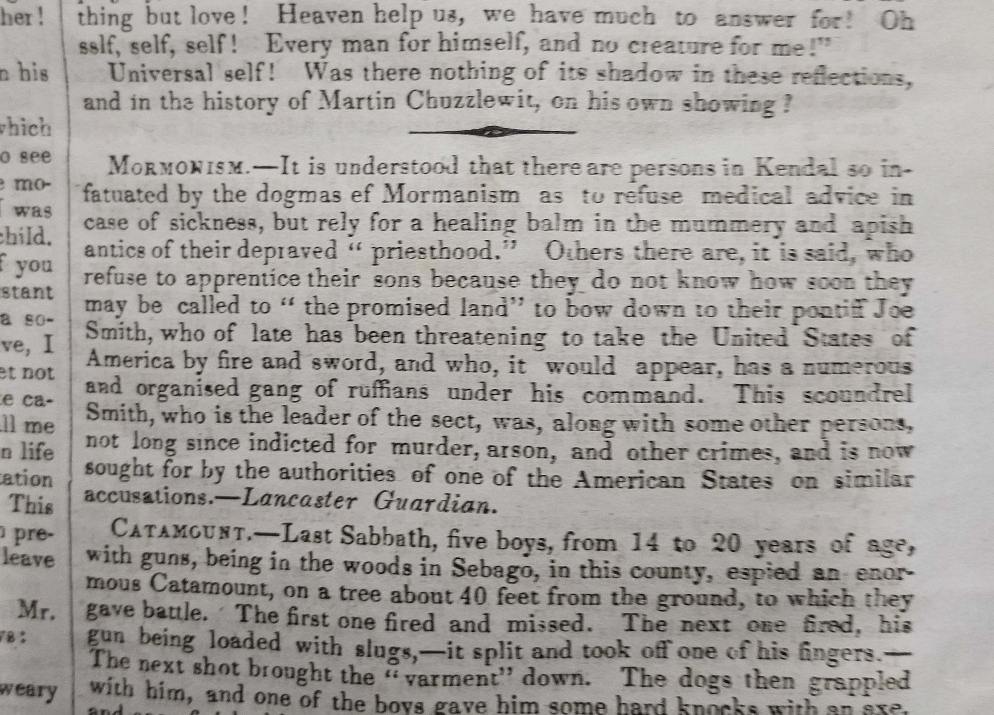 Philadelphia: Wilson and Company, Publishers, 1843. Ephemera. Very Good. Pagination runs 181 to 210. Single issue of this weekly publication devoted to the republication of English fiction (without paying royalties). As such, this features the first three chapters of "Martin Chuzzlewit" by Charles Dickens, as well as an editorial criticizing the recent work and wealth of Dickens. Of note is a brief article on Mormons and Mormonism asserting that there are people in Kendal [England] taken by the dogmas of Mormonism that they refuse medical advice, and claiming that Joseph Smith is threatening to take the US by fire and sword, mentioning he had been indicted for murder and arson. Moderate scattered foxing to the paper.