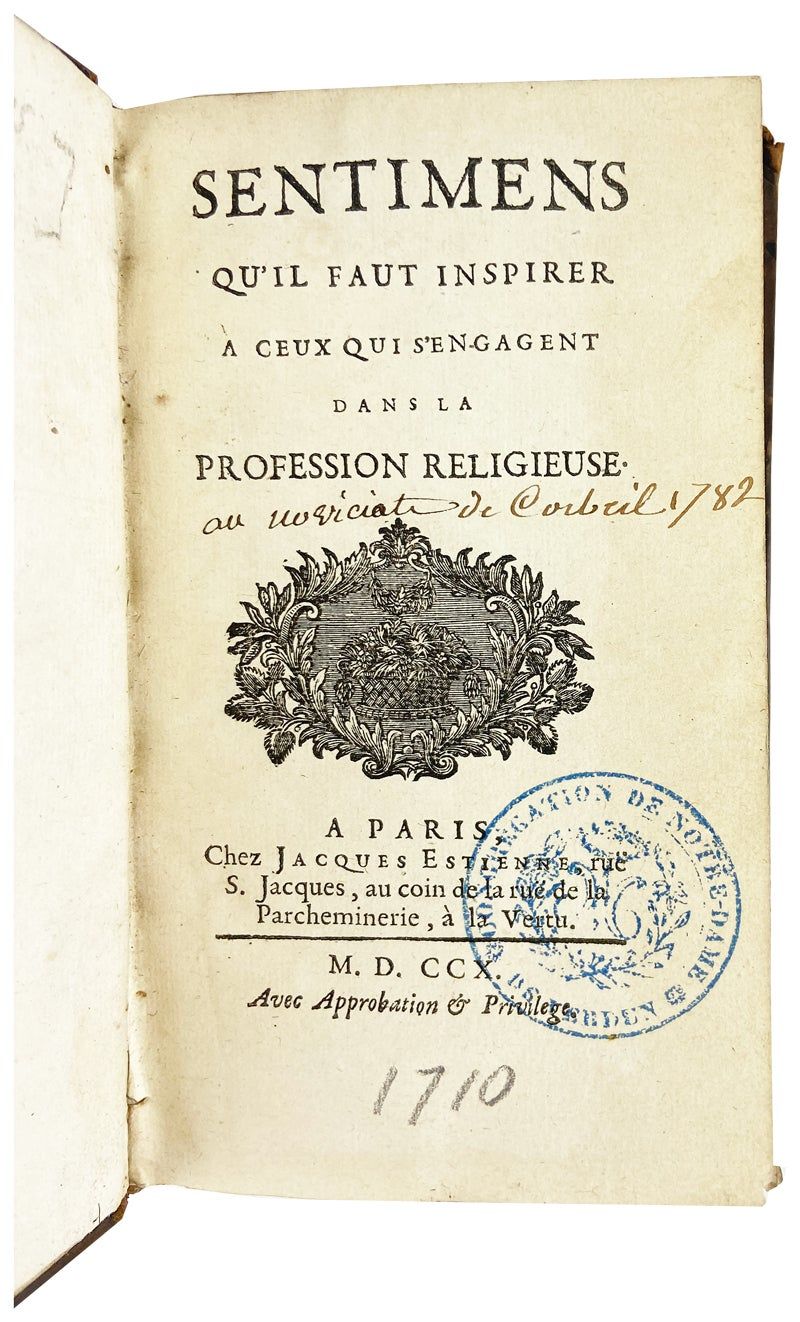 Paris: Chez Jacques Estienne, rue S. Jacques, au coin de la rue de la Parcheminiere, a la Vertu, 1710. Very Good. Paris: Chez Jacques Estienne, rue S. Jacques, au coin de la rue de la Parcheminiere, a la Vertu, 1710. First Edition. 12mo. [xii], 250 pp., bound in alternating 8s and 4s, collated complete. Bound in full contemporary calf; five raised bands, gilt decorating, and red leather label to spine; edges sprayed red. Boards chipped at spine ends; brief exposure to extremities; general scuffing. Binding sound. A few 18th-century notes and inscriptions to preliminaries and title page; stamp of Congregation of Notre Dame in Verdun to same; interior else unmarked. A Very Good copy of a scarce text.