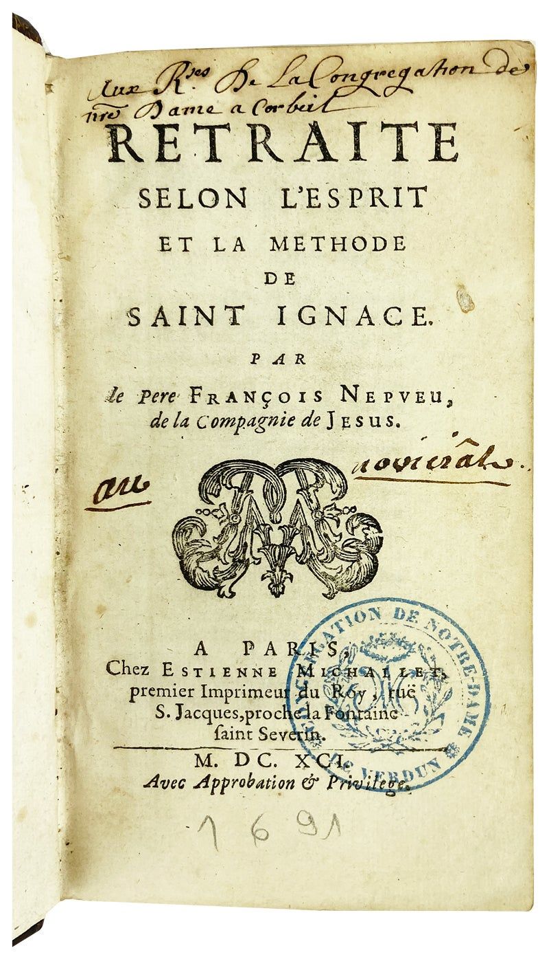 Paris: Chez Estienne Michaelet premier Imprimeur du Roy, tue S. Jacques, proche la Fontaine saint Severin, 1691. Very Good. Paris: Chez Estienne Michaelet premier Imprimeur du Roy, tue S. Jacques, proche la Fontaine saint Severin, 1691. Later Edition. 12mo. [24], 514, [2], 515-542pp. Full contemporary calf; five raised bands, gilt decoration, and leather title label to spine; edges sprayed red. Spine ends chipped; wear with exposure to edges; general scuffing. Binding sound. Stamp and inscriptions from the Congregation of Notre Dame of Verdun to preliminaries and title, interior else unmarked. Overall a worn but still Very Good copy of an early reprint from the prolific Jesuit writer. Nepveu's works were often translated and reprinted, though copies published in his lifetime fairly scarce in retail.