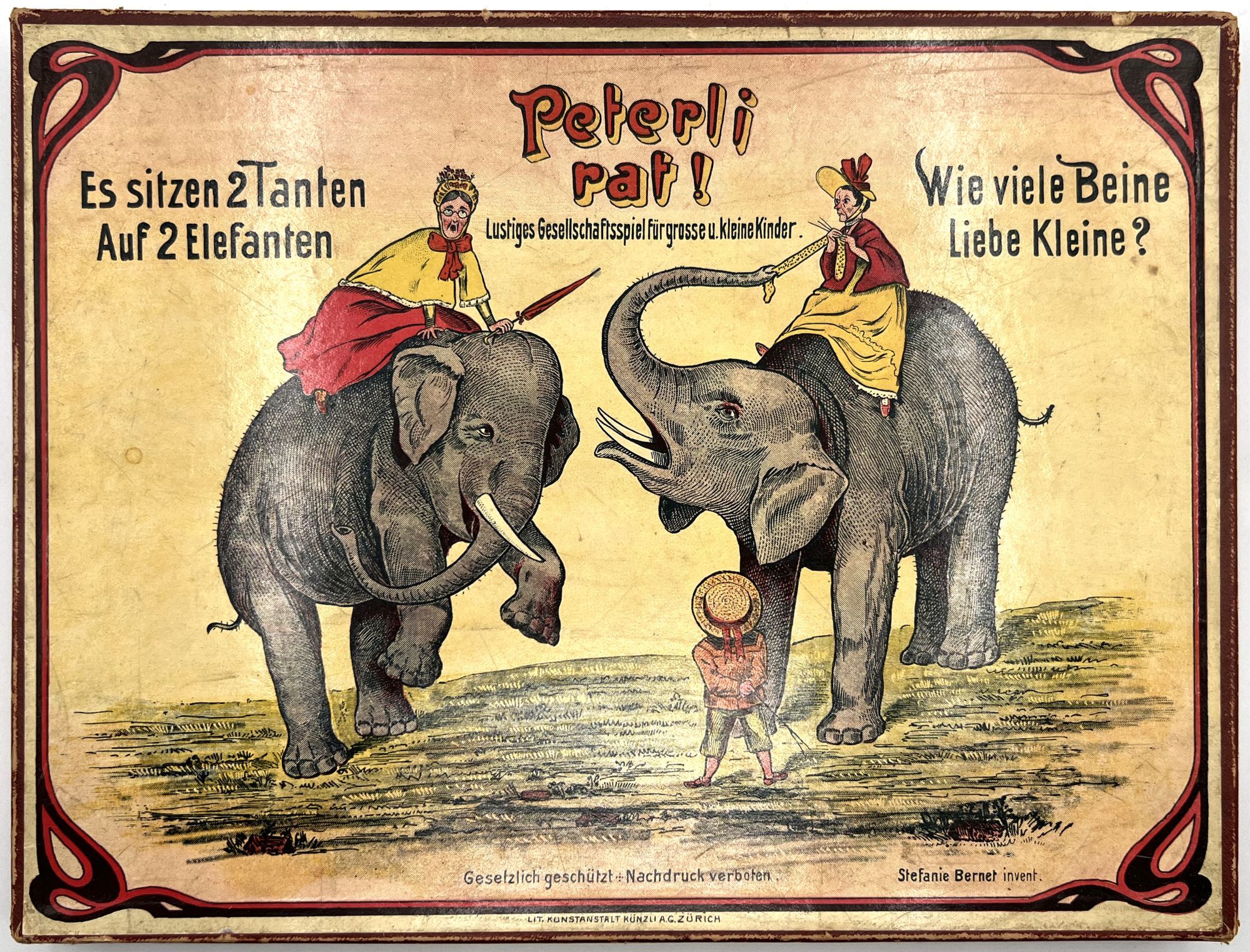 A 10" x 13" boxed game with applied litho label. It is Peterli rat! - Lustiges Gesellschaftsspiel fur grosse u. kleine Kinder (social game for children young and old). Cover illustration depicts two aunts on two elephants.The game consists of lotto style cards with numbers and small cards with questions and numbers to use to complete the lotto cards.