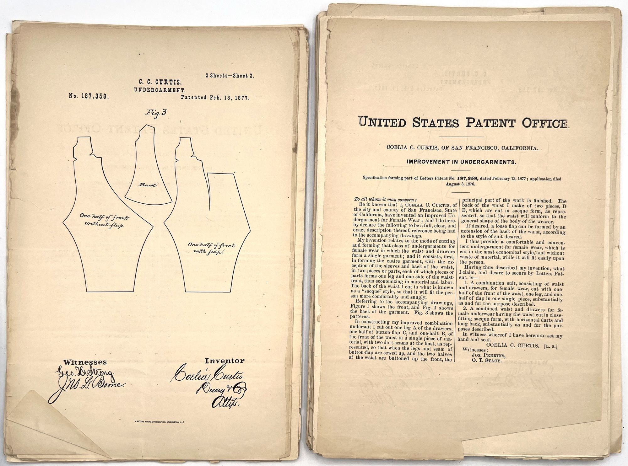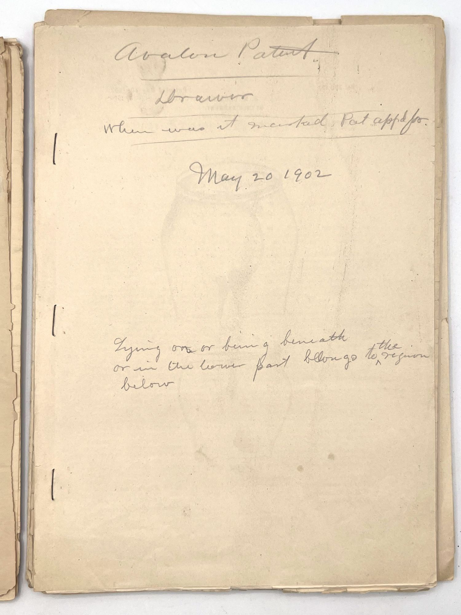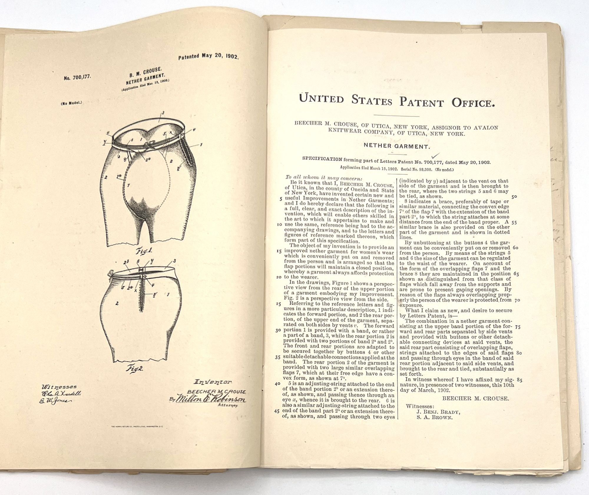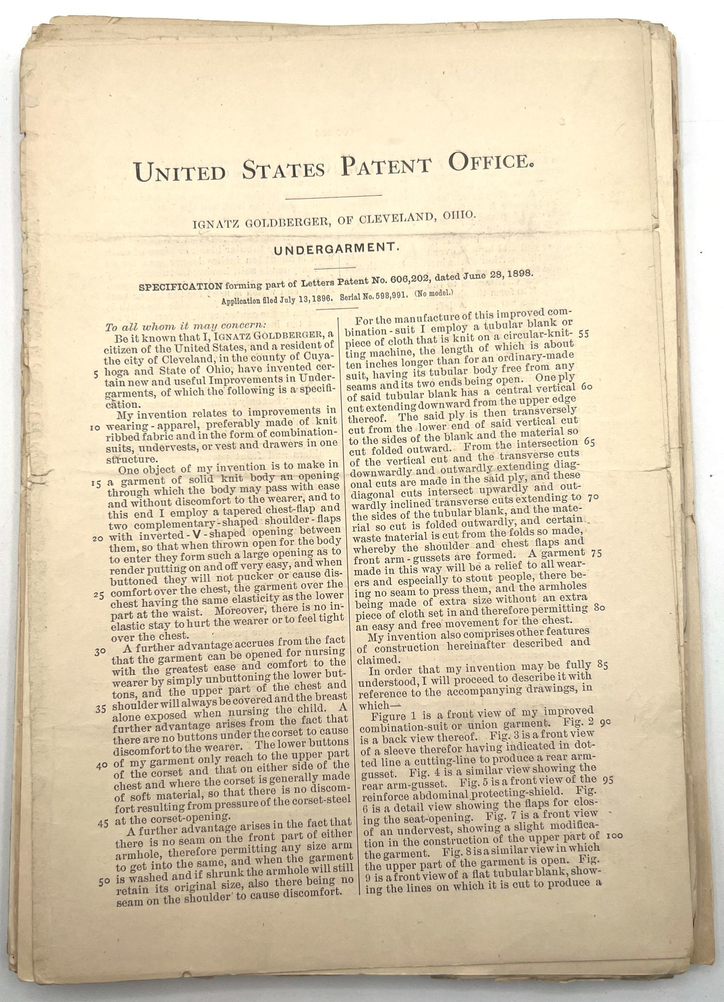 This lot consists of United States Patent Office documents (they are not the Patents themselves), all pertaining to men's undergarments, notably union suits. They are dated from about 1885-1910 and essentially contain the specific description of the invention, by the inventor (all names, home towns, given), along with diagrams of the item patented. A typical document would note that the item formed part of Patent Number ______, dated ______. There are over 30 of these descriptions, most with illustrations. Some have lawyer's stamps and comments written on blank cover pages. Included are Undergarments, Union Garments, Improvement in Undergarments, Combination Undergarment, Apparel Shirt, Shirt, Underwear, Nether Garment, Under-Garment, Union Undergarment, Garment, Overalls, Combined Shirt and Drawers, Combined Blouse and Pantaloon-Overalls, etc. Many of the illustration/diagrams are amusing, as the garments are unusual (see our photos). Condition: many have tears, some are age toned' some minor soiling; fold separations in spots; minor creasing, edge rubs. Overall condition is very good. Each measures about 8" X 11.