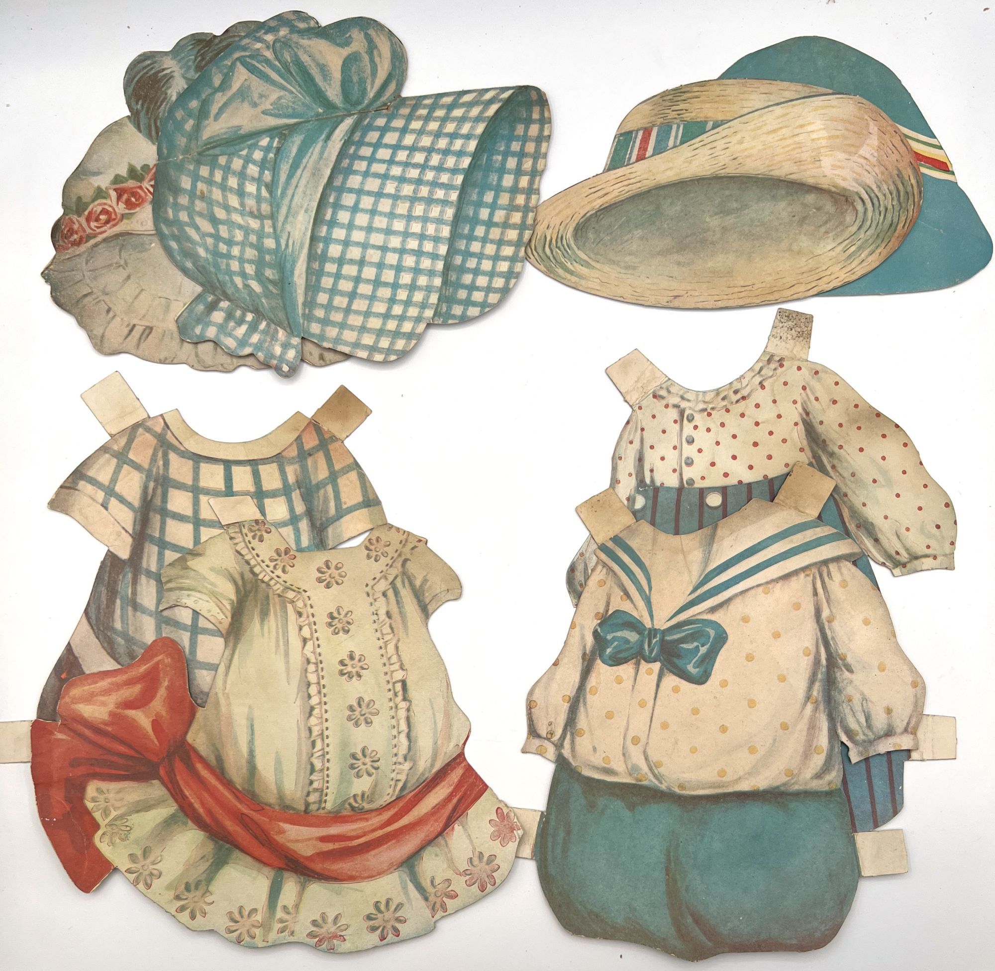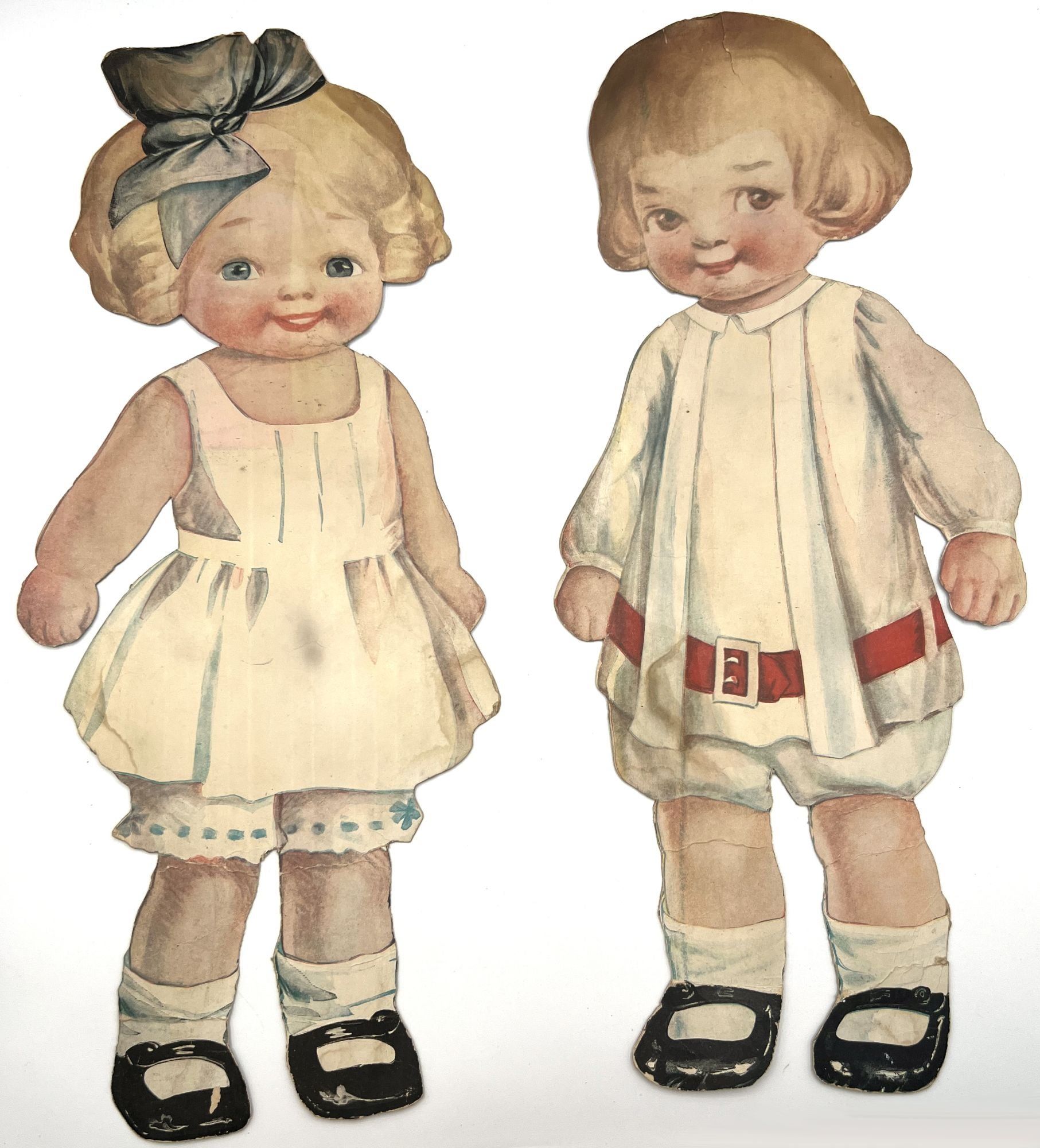Toddler boy and girl approx. 18 1/2" tall heavy card stock paper doll, each with two (2) costumes and two (2) hats. Believe they are Dearie Dolls, published by M.T. Shehan in 1915 or perhaps Tippy Toes or Curly Locks produced by Charles E. Graham -- all were the same dolls, produced by one of two publishers. They are similar to "Woolworth" paper dolls in size and style. Condition: neck and knee bends; generalized light/moderate wear. Soiling on reverse.