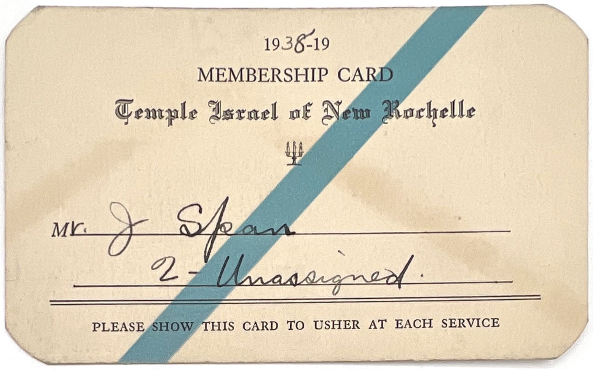 Printed membership card finished in ink manuscript of Mr. J. Span(?) of the Temple Israel of New Rochelle, for the year 1938. Measures approx. 2.5" by 4", verso blank.