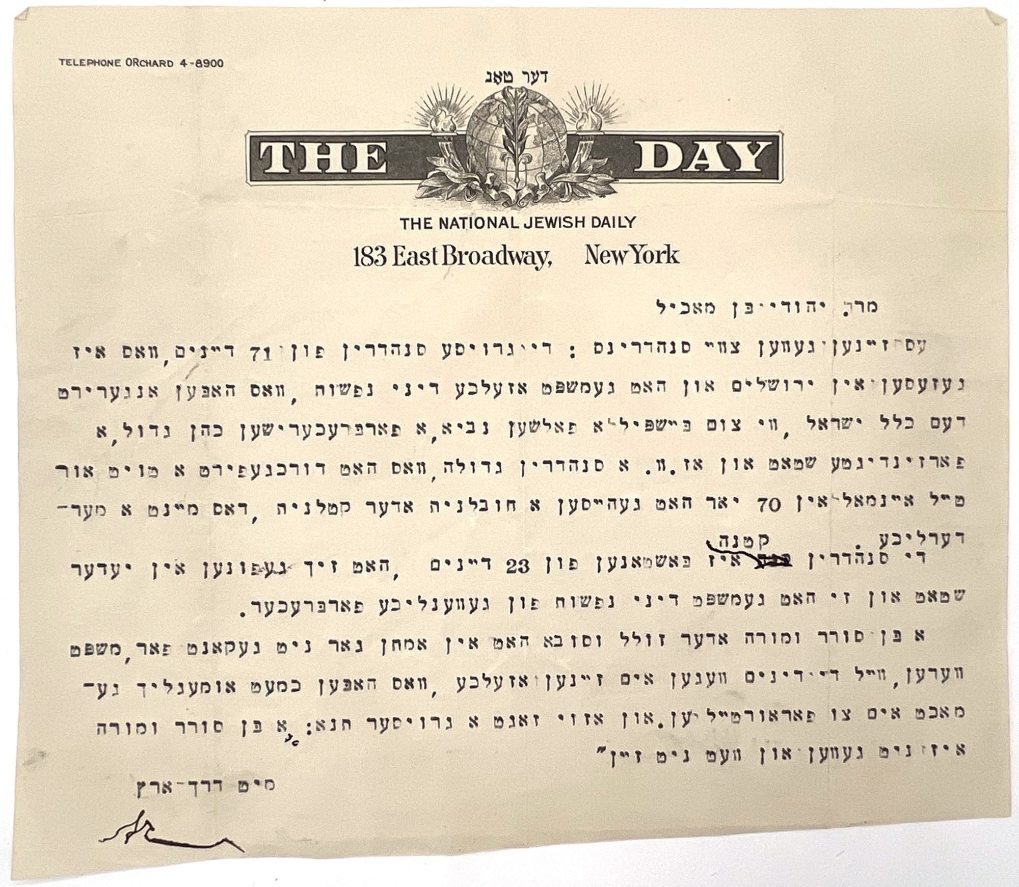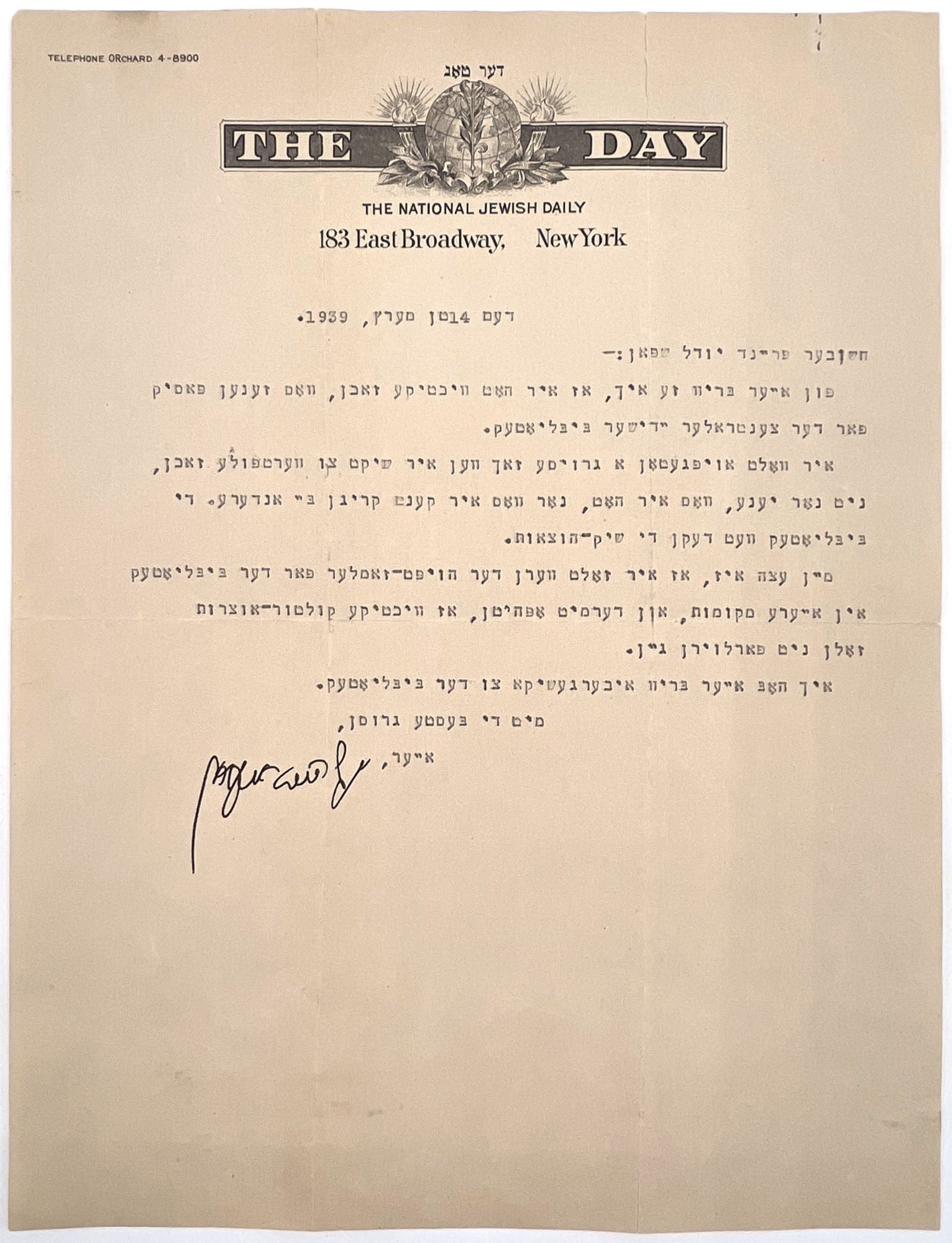 Typewritten letter dated 1939 from the National Jewish Daily of New York, New York measuring 11" by 8.5".