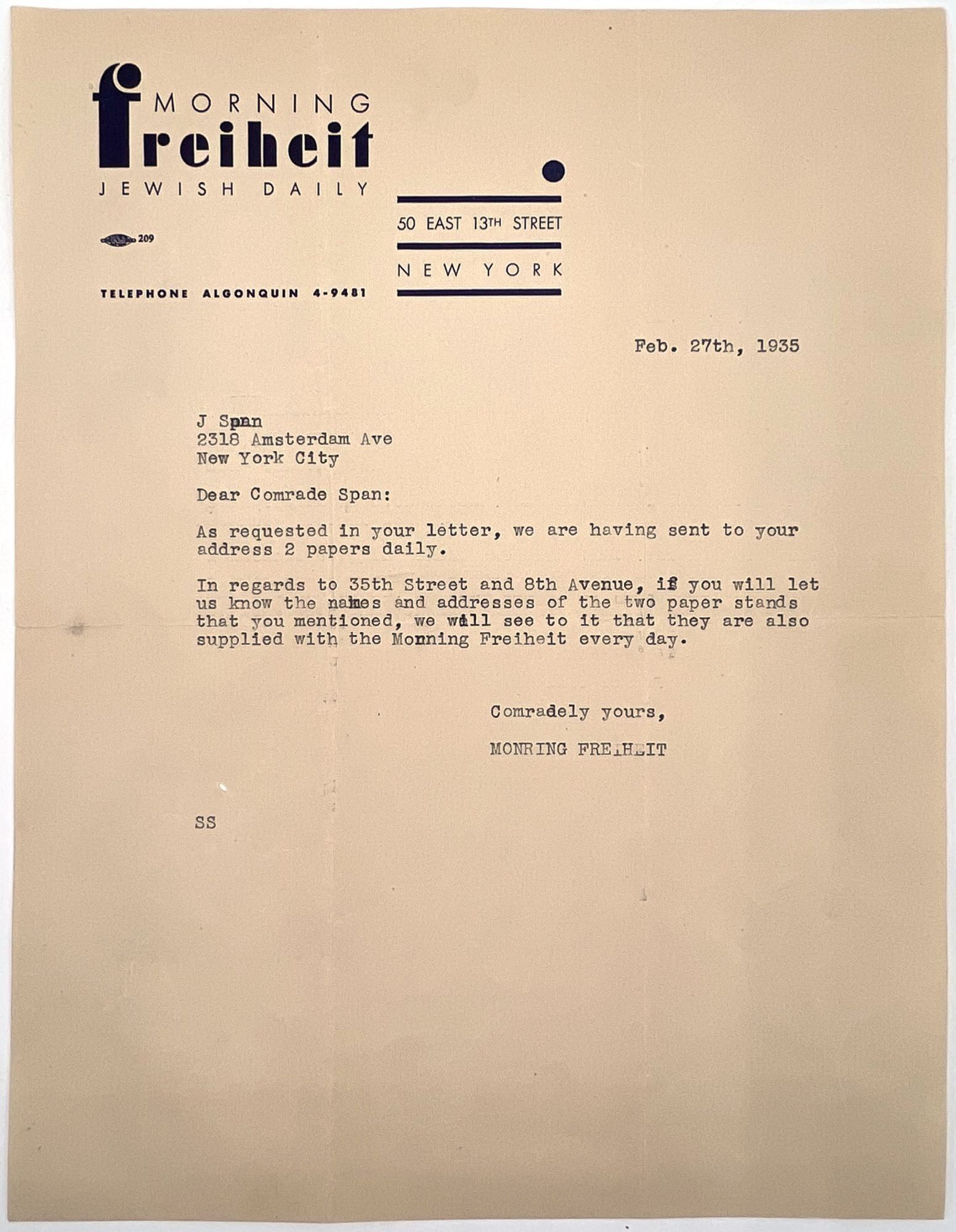 Typewritten letter dated Feb. 27th, 1935 from the Morning Freiheit Jewish Daily of New York City, measuring 11" by 8.5".