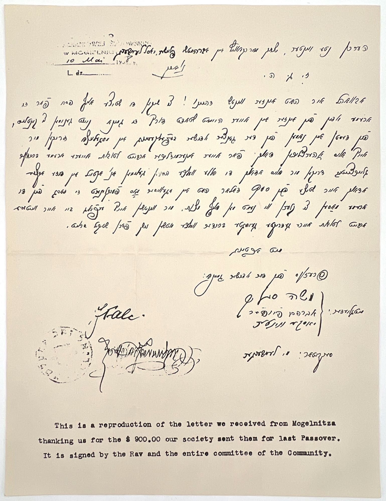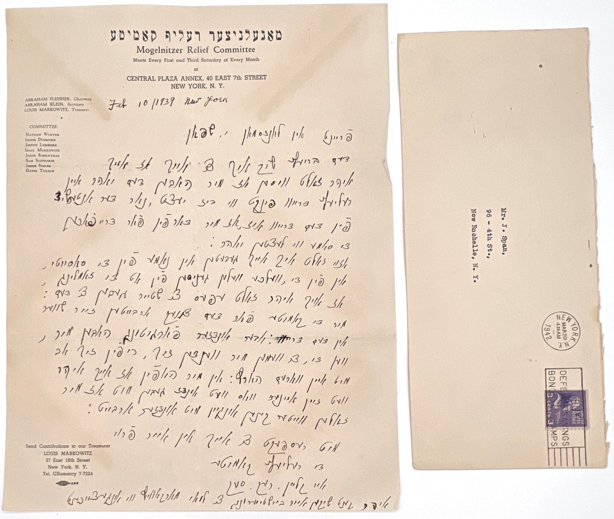 Handwritten letter from Mogelnitzer Relief Committee dated Feb. 10, 1939. Measures 11" by 8.5". With original addressed and postmarked envelope.