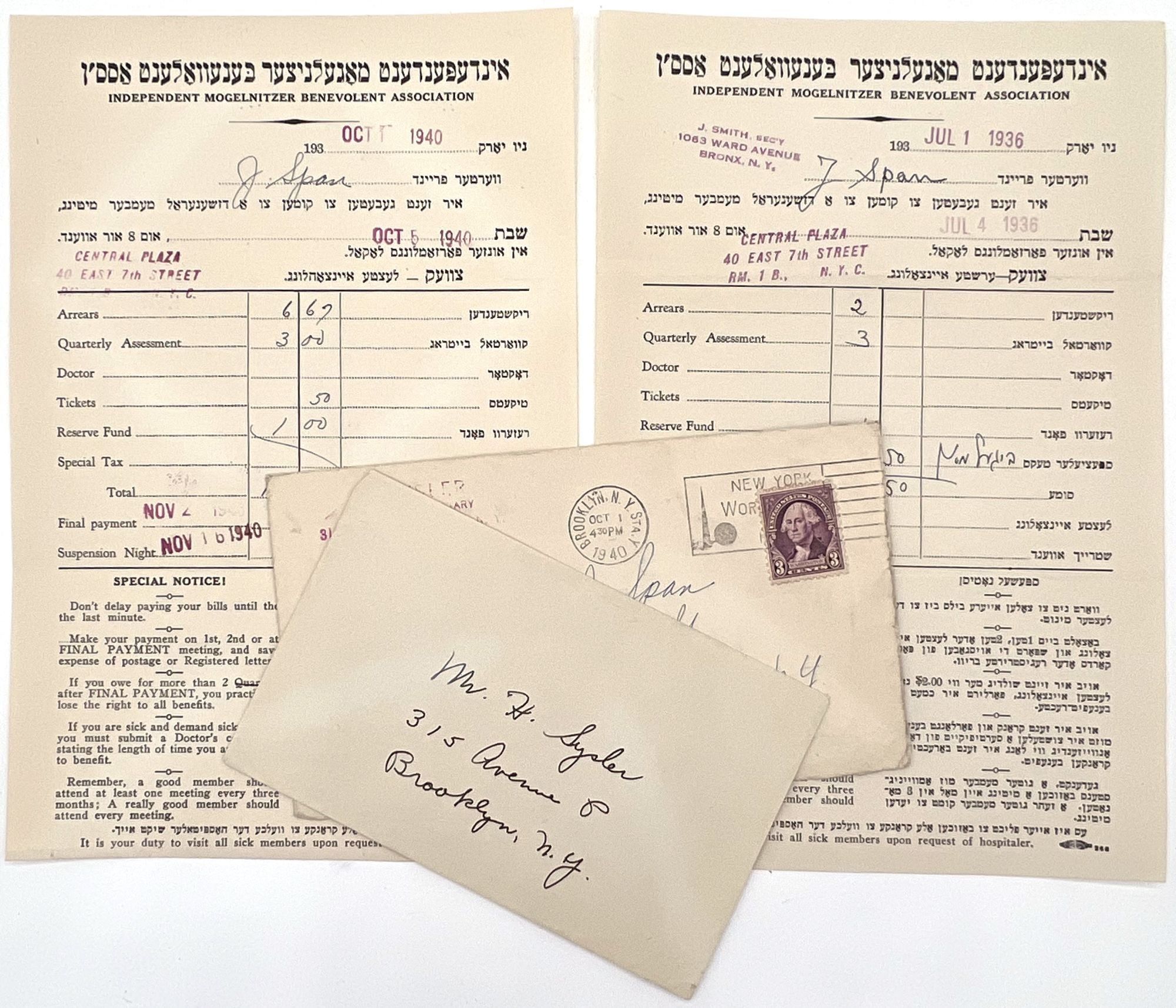 Two (2) receipts for donations to the Independent Mogelnitzer Benevolent Assocation dated 1936 and 1940, accompanied by two original envelopes. Measure 9" by 6".