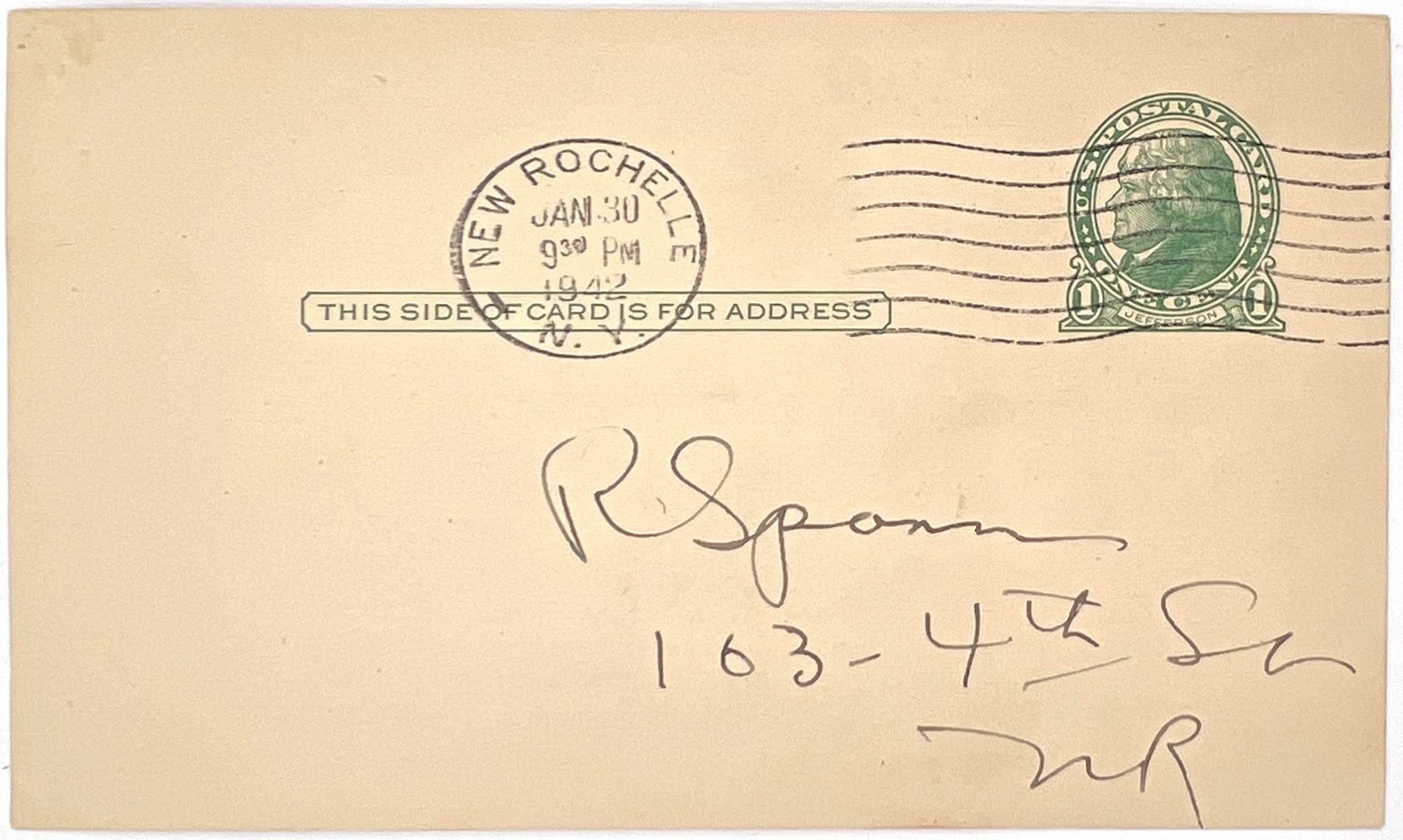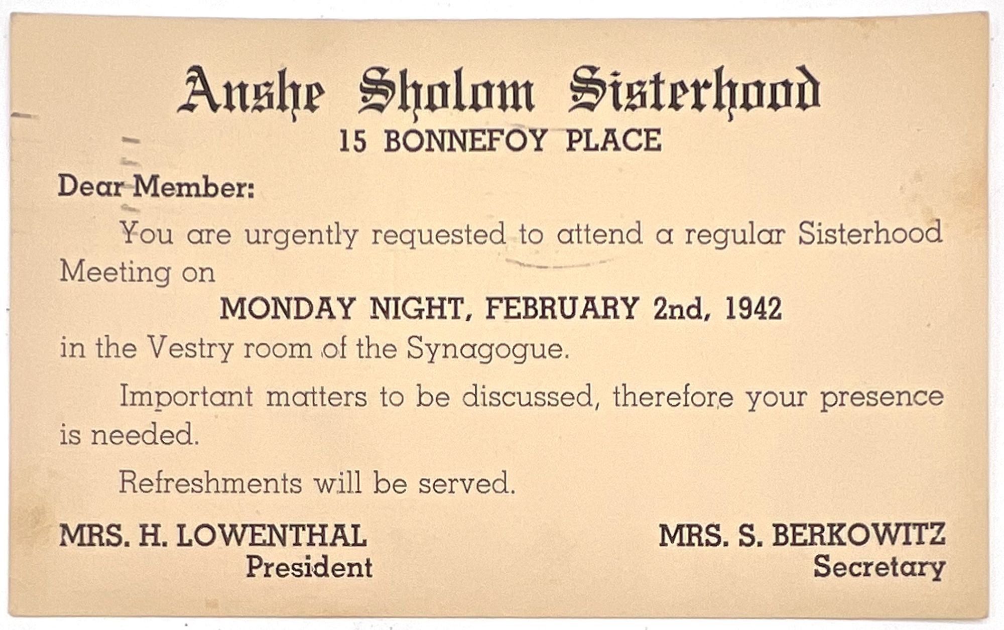 Printed invitation inviting recipient to a meeting of the Anshe Sholom Sisterhood in New Rochelle on February 2nd, 1942. Addressed/postmarked on verso. Measures approx. 3.25" by 5.5".