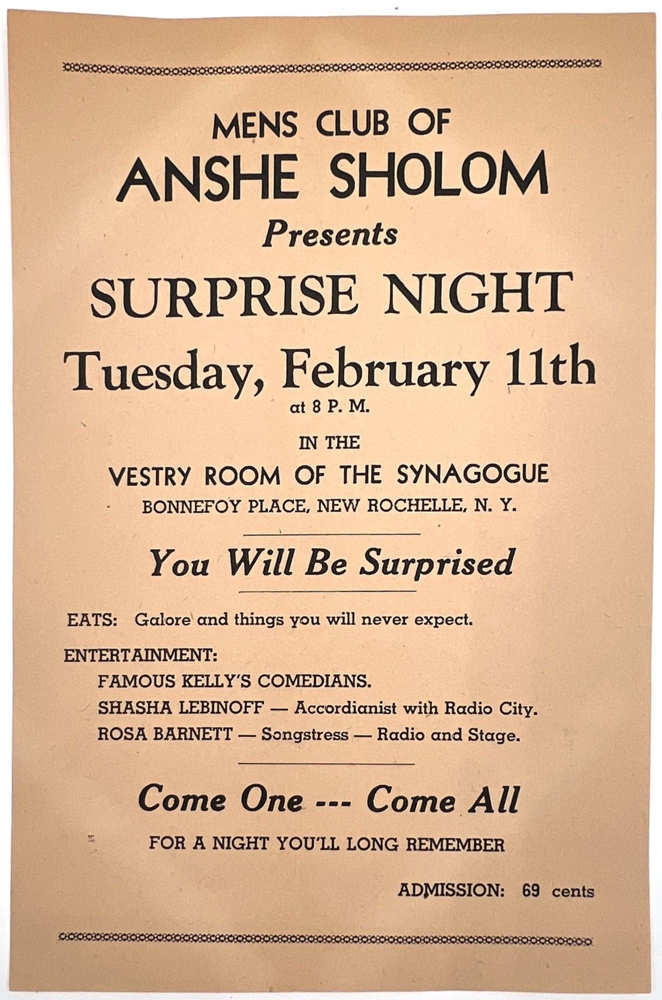 Printed handbill inviting attendees to Mens Club of Anshe Sholom "Surprise Night" on Tuesday, Feb. 11th, 1941 in Vestry Rom of synagogue in New Rochelle, New York. All invited, measuring 9" by 6".