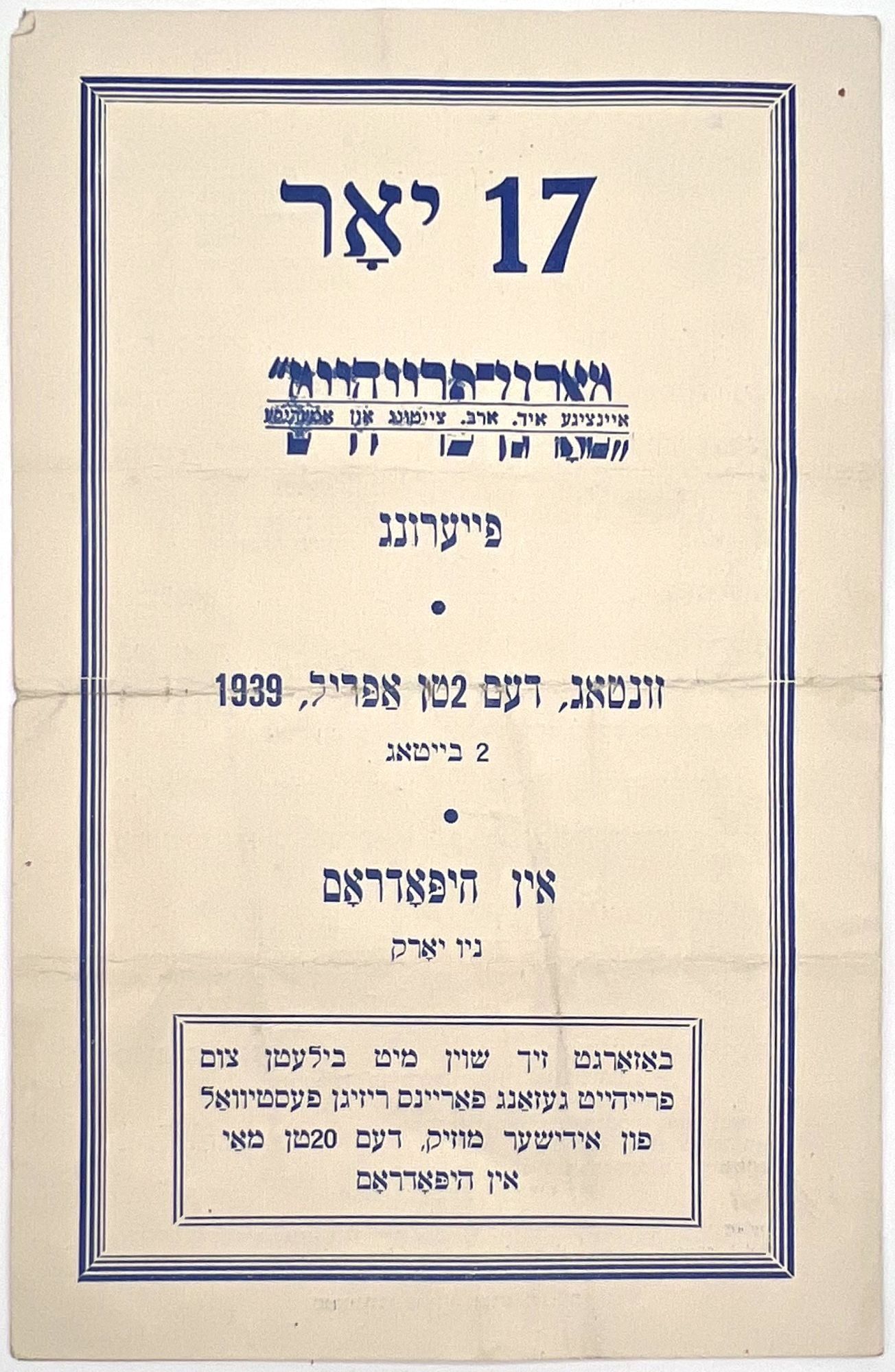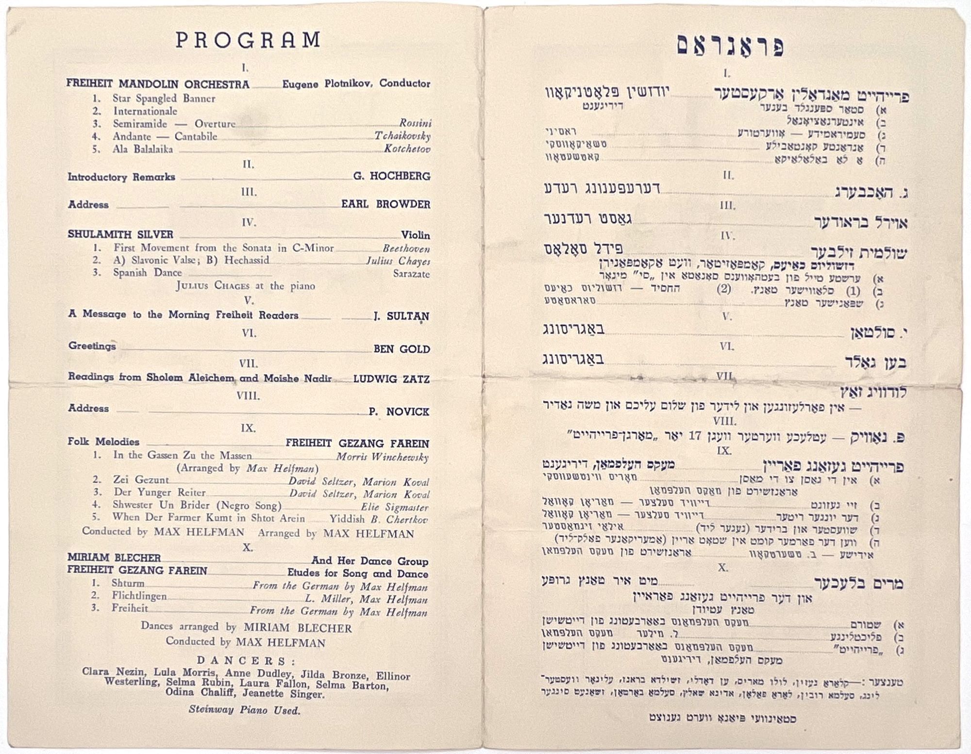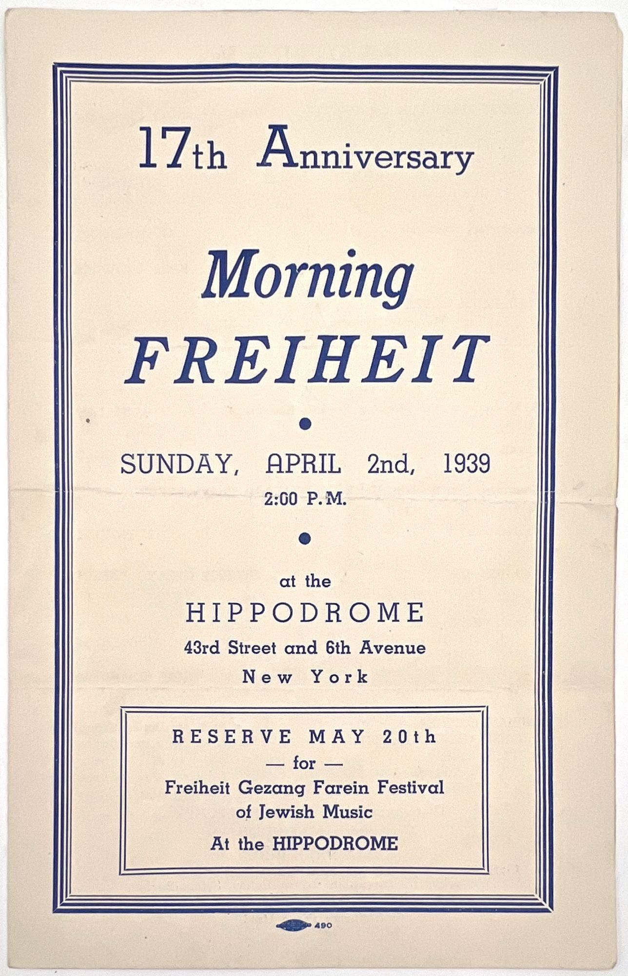 Printed program for April 2nd, 1939 "Morning Freiheit" at Hippodrome in New York City. Bifolium (8.5" by 5.5").