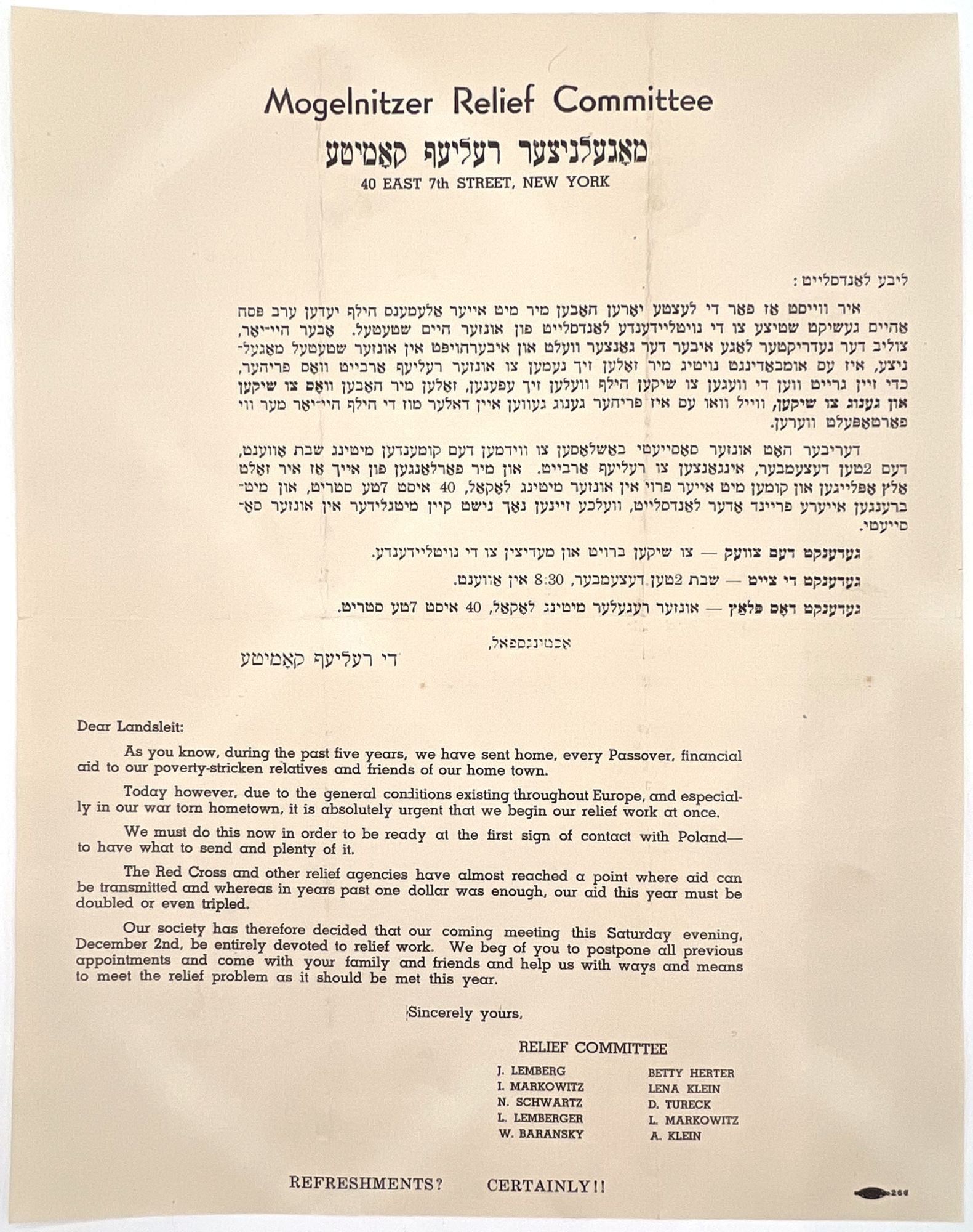 Printed letter [1943?] inviting attendees to a Mogelnitzer Relief Committee event in New York City to support relatives and friends in war-torn Europe. Measures 11" by 8.5".