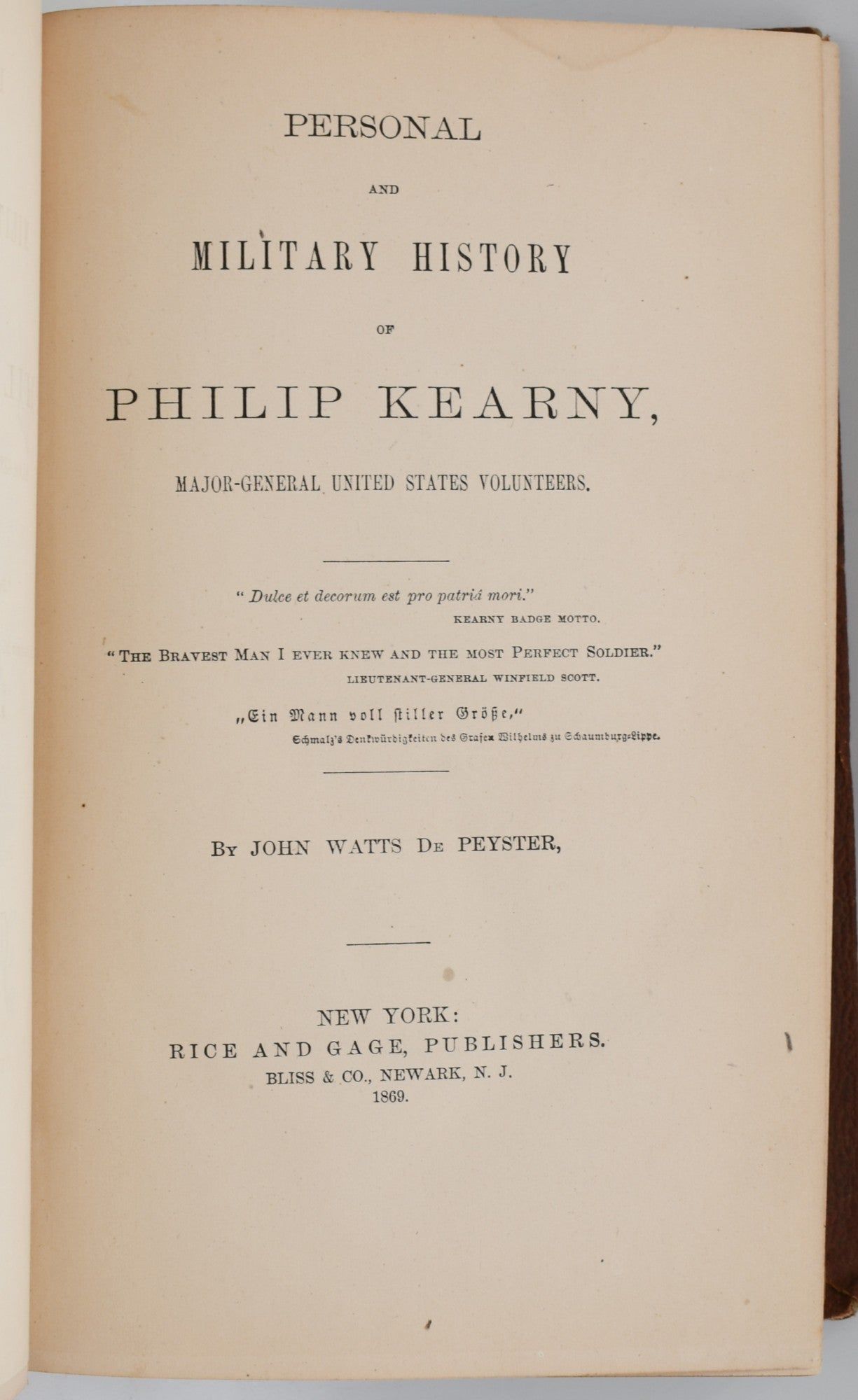 New York | Newark, N. J.: Rice and Gage, Publishers | Bliss & Co, 1869. First Edition. Very Good binding. Large 8vo; in terra-cotta pebbled cloth, with a gilt vignette of General Kearny in the center of the upper board; xii, 512 pages, with plates, portraits and an intext map; with an additional illustrated title page; two leaves have minor corner loss, not affecting text.~~On the front pastedown is the signature of one "John J. Heigh" dated December of 1869.~~The account is given mixed comments in the Nevins bibliography: on the one hand it is considered there to an "uncritical ‘memorial'"; on the other and it is noted that it "contains many excerpts from pertinent documents". ~~ (Nevins II, 52). Very Good binding.