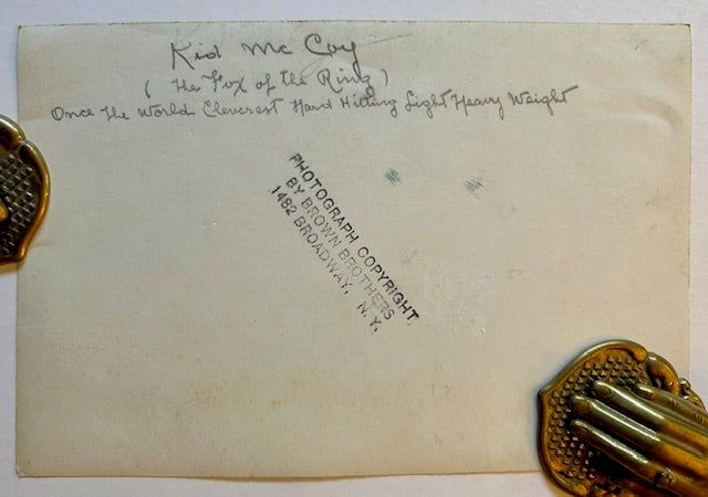 New York. Photograph. Very Good +. Very sharp vintage photograph in his boxing stance of Kid McCoy (1872-1940), the enigmatic American middleweight and light heavyweight champion. The crisp black-and-white photo measures 5" wide x 7 3/4" tall and shows the stamp "Photograph Copyright by Brown Brothers 1482 Broadway, N.Y." at the rear. It also has at the rear vintage handwriting that reads: "Kid McCoy (the Fox of the Ring) Once the World's Cleverest Hard-Hitting Light Heavy Weight". McCoy, whose real name was Norman Selby, also had an acting career on the big screen, was married 10 times and served time at Sing Sing for allegedly shooting a mistress of his. A nice piece of boxing ephemera.