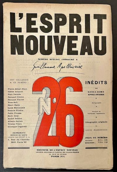 Paris: Editions de L'Esprit Nouveau, 1924. Original wraps. Very Good +. In its original decorative wrappers, unpaginated, with 1 lithograph by Louis Marcoussis and 16 black-and-white illustrations. French text (exclusively), with some facsimiles of letters by Apollinaire. This, the special Apollinaire issue, with contributions by Paul Dermee, Fernand Divoire, Fernand Fleuret, Yvan Goll, Louis Marcoussis, Francis Picabia, Pablo Picasso, Roch Grey, Tristan Tzara and others. Founded in 1920 by Amedee Ozenfant and Charles Edouard Jeanneret (better known to the world as Le Corbusier), the magazine "L'Esprit Nouveau" promoted the art movement "Purism", with a new emphasis on clean geometrical lines and new technologies and materials. Purism reached its peak with Le Corbusier's design for the Pavillion de l'Esprit Nouveau (Pavillion of the New Spirit), built for the 1925 International Exposition of Decorative and Industrial Arts in Paris. A sharp copy, clean, bright and VG+, with small, neat tape and light wear at the foot of the spine. Signature of Churchill Lathrop (1900-1996), renowned art historian at Dartmouth, on the front free endpaper.