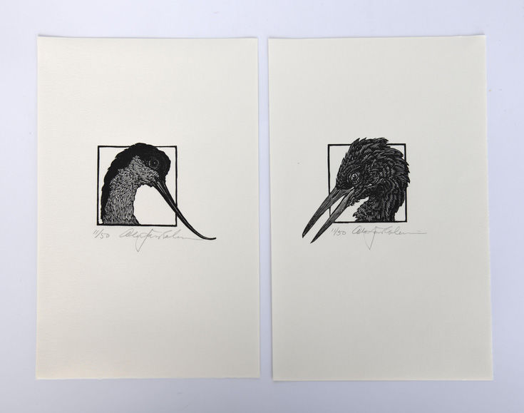 (Easthampton, MA): Cheloniidae Press, 1986. First Edition. Hardcover. Fine in clamshell box. Octavo (5-1/2" x 8-1/2") bound by Gray Parrot in quarter vellum and marbled paper, laid in a custom cloth clamshell box. The text was culled from ANIMATE CREATION by Rev. J. G. Wood, 1885. The illustrations consist of 26 wood engravings by Alan James Robinson with the names of the birds hand-lettered by Suzanne Moore. Copy #11 of 50 the Deluxe Edition (of a total edition of 231) printed by Harold Patrick McGrath and SIGNED by Robinson. This edition has an extra portfolio containing a suite of the 26 engravings, each SIGNED and numbered by Robinson. Prospectus laid in.