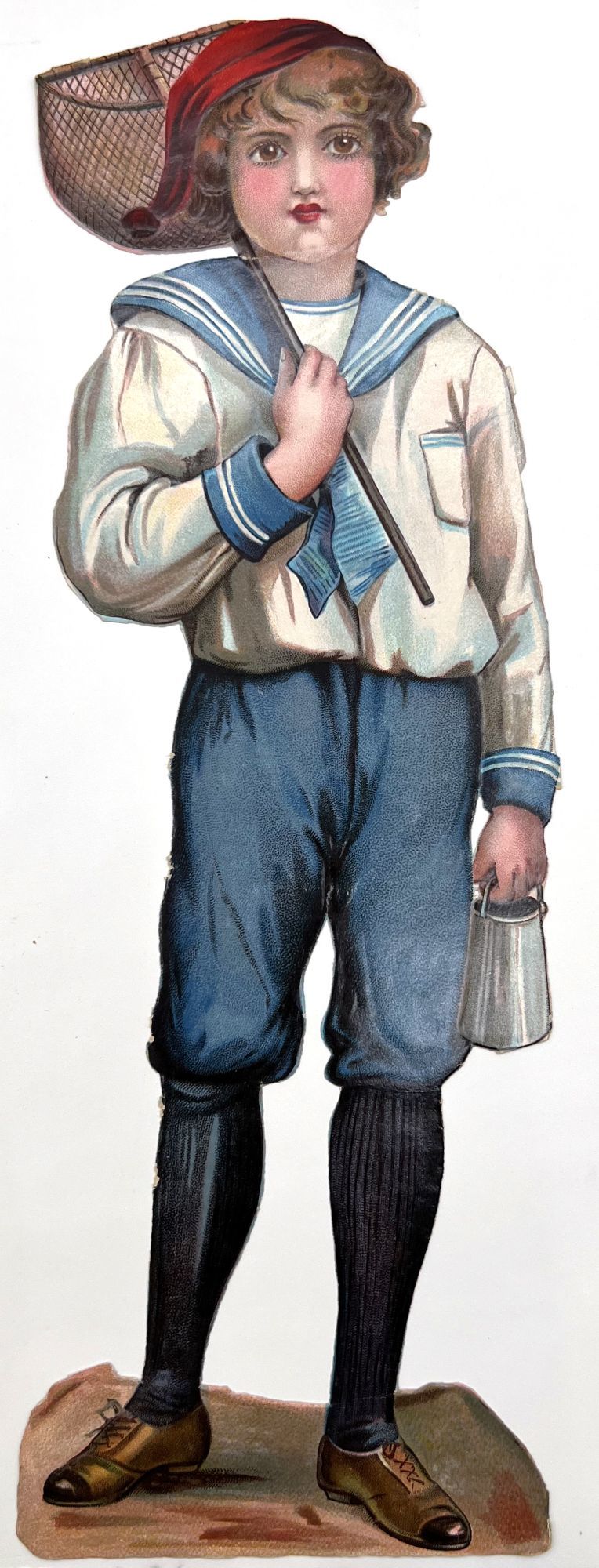 A 13 1/4" embossed die-cut Victorian scrap depicting a young boy in sailor suit and red cap with fishing net. Holds a small tin in his hand. Not marked but most likely Raphael Tuck & Sons. Condition: very light neck bend and light edge wear along left leg. Overall fine.