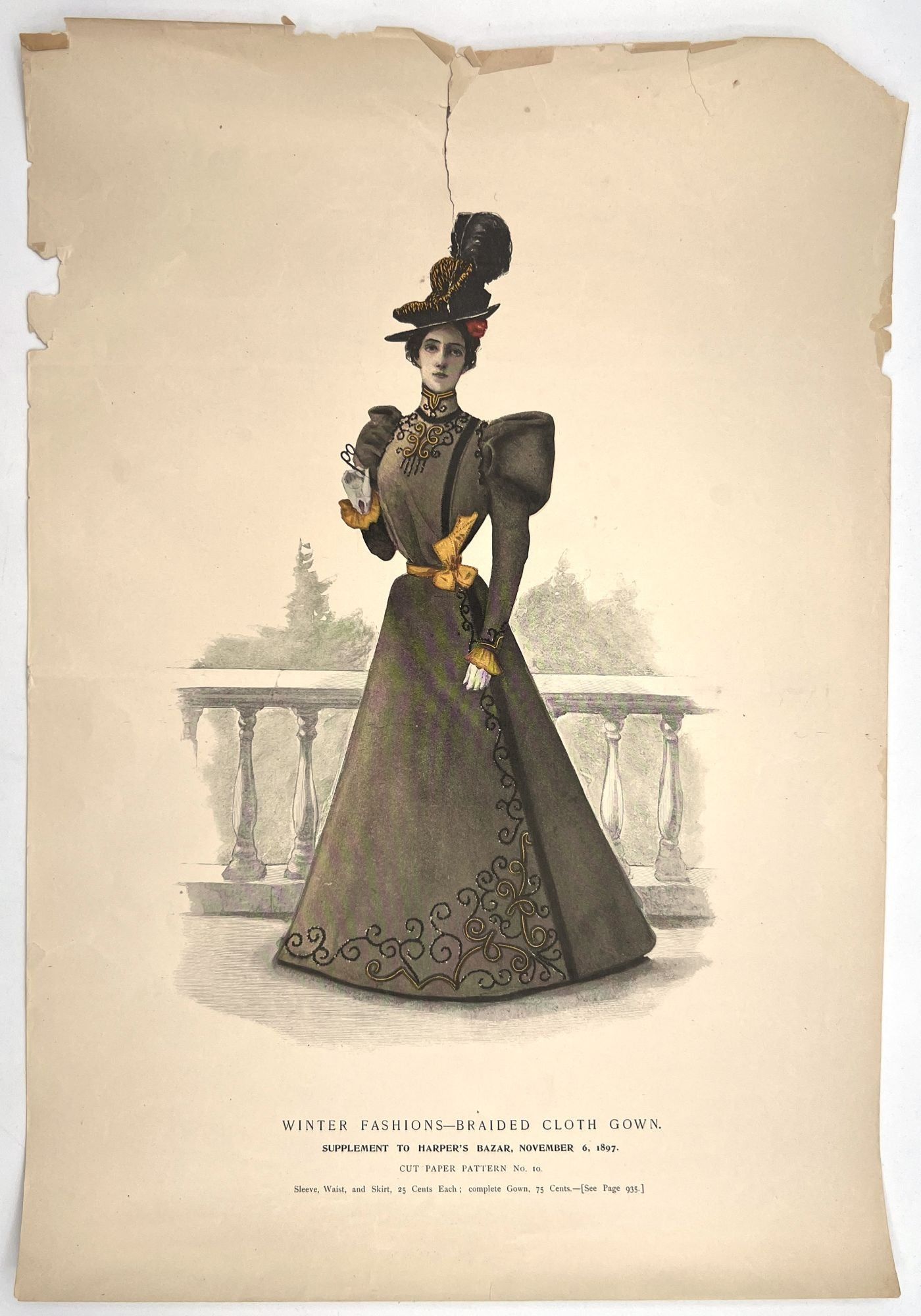 A 16" x 11" lithograph supplement to Harper's Bazar, November 6, 1897, titled Winter Fashions-Braided Cloth Gown . Depiction of fashion for the upcoming season. The supplement was previously rolled. Some curling at ends. Edge wear, some intact tears.