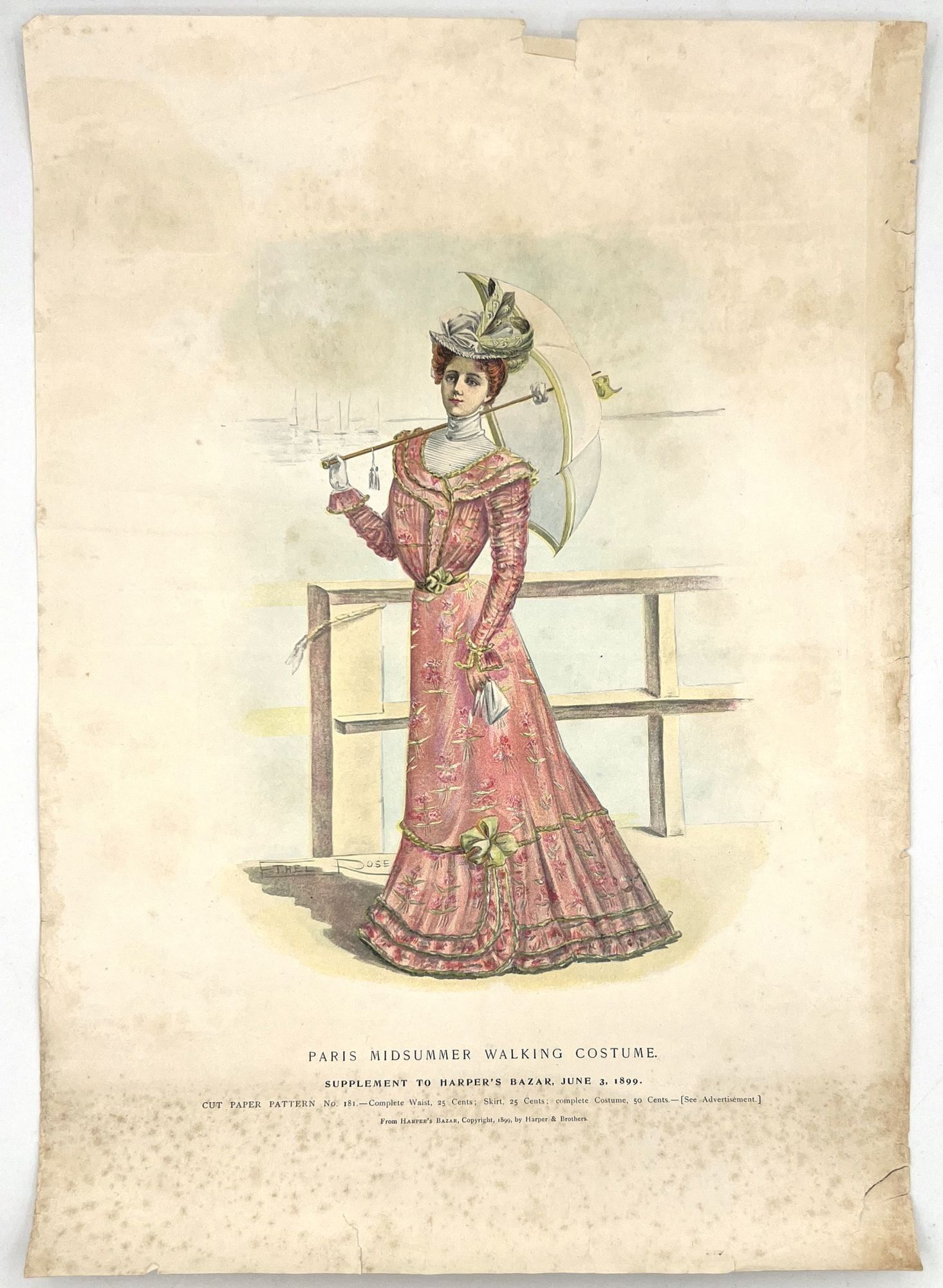 A 16" x 11" lithograph supplement to Harper's Bazar, June 3, 1899, titled Paris Midsummer Walking Dress. Illustrated by Ethel Rose. Depiction of fashion for the upcoming season. The supplement was previously rolled. Some curling at ends. Edge wear, some intact tears, foxing at base.