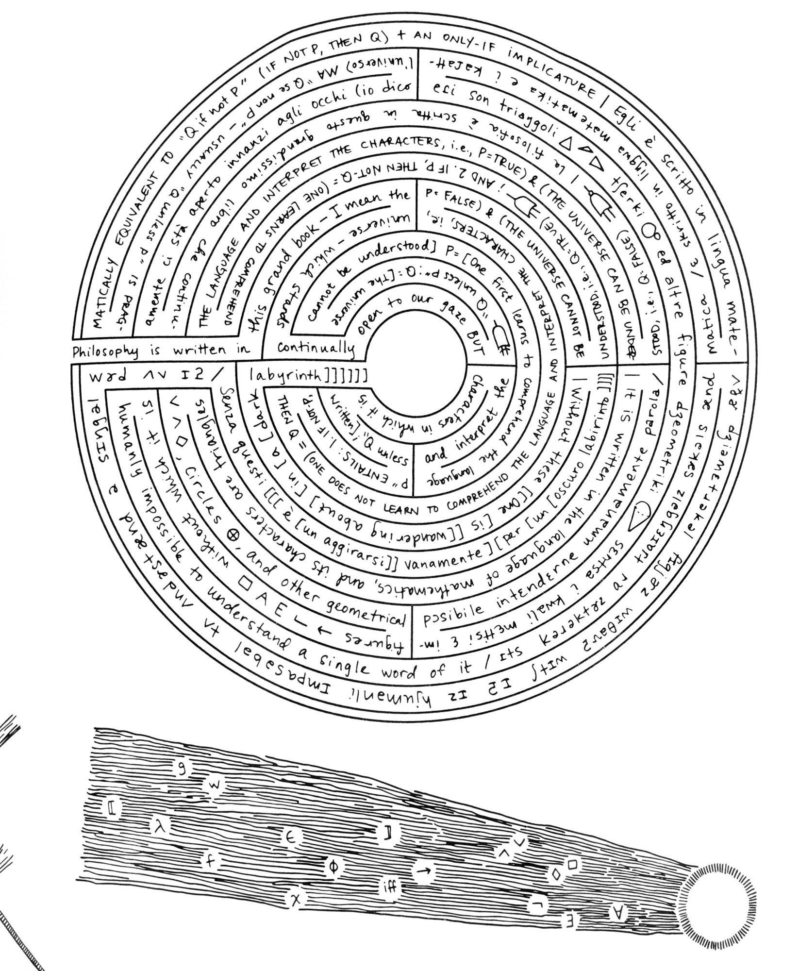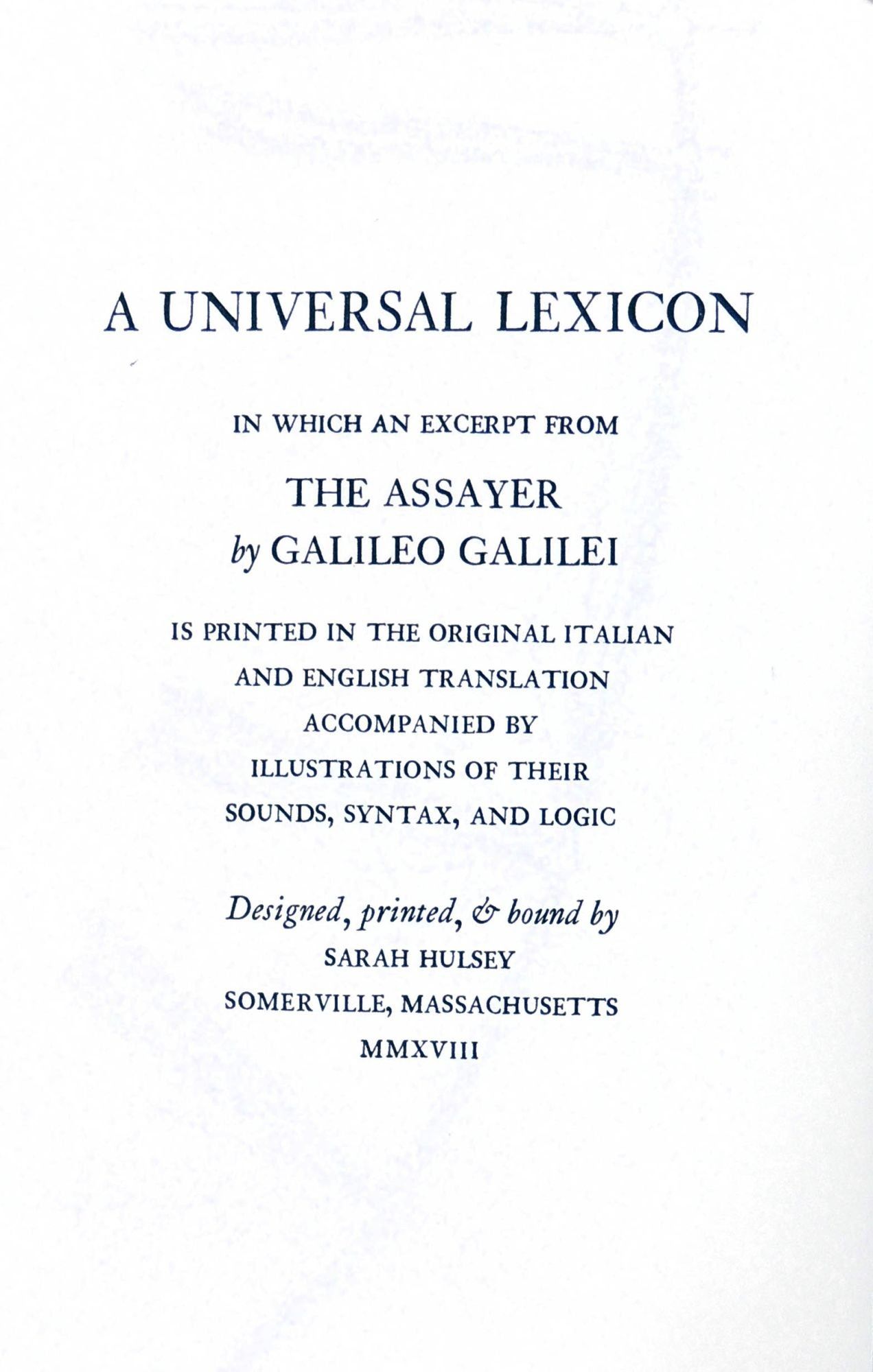 Somerville, MA: Sarah Hulsey, 2018. Hardcover. Fine. Hardcover. Number 19 of 30 copies. Includes an excerpt from "The Assayer" by Galileo in the original Italian with an English translation, accompanied with illustrations of their sounds, syntax, and logic. "In one of the most important scientific treatises of his era, Galileo compared the act of understanding the universe to reading a book in the language of mathematics. By comprehending the symbols and figures of this 'grand book,' one could avoid wandering about in a dark labyrinth of confusion. This artist's book uses the vehicle of translation - between languages, of text to image, and across domains of language - to illuminate the mathematics and science of linguistics underlying Galileo's text. Illustrations representing the sounds, syntax, and logic alternate between Italian and English, providing a route through the arguments of text" (artist's statement).