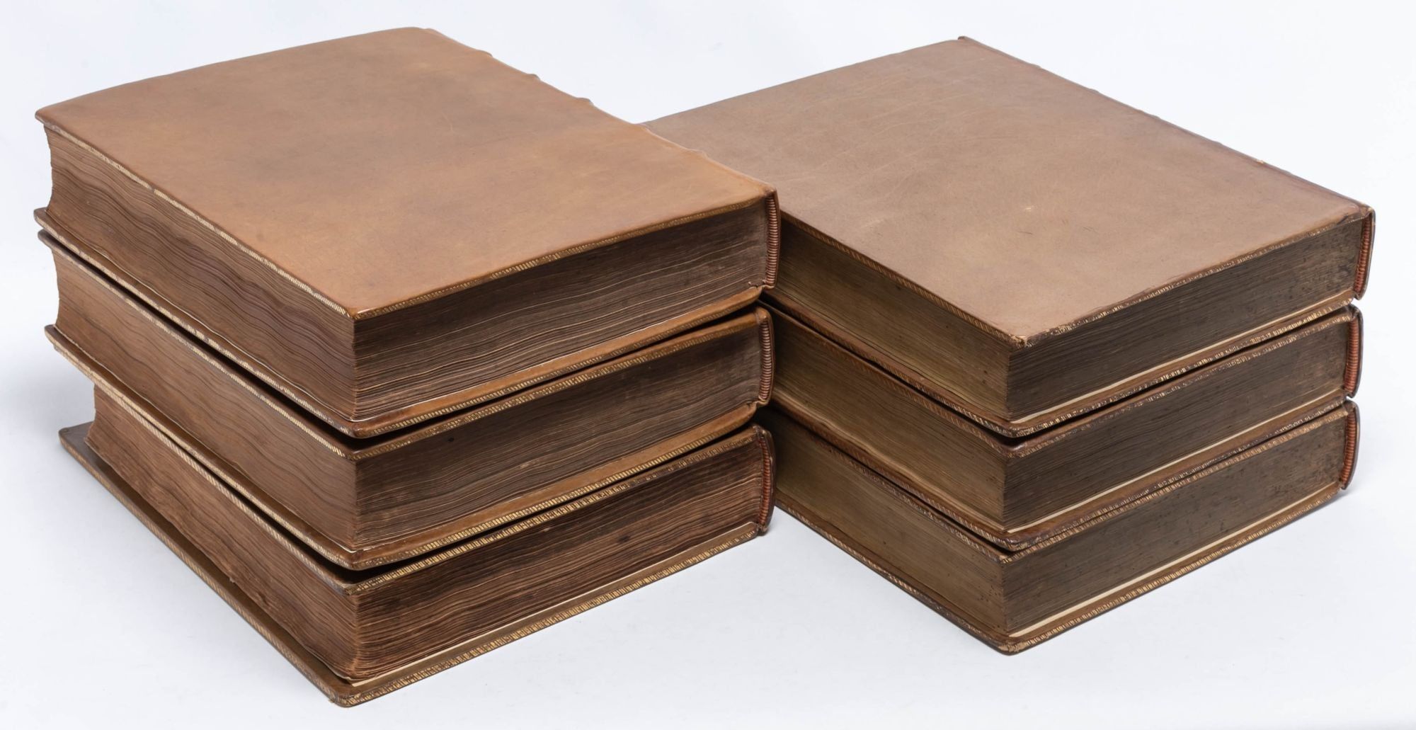 With the cancel leaves and uncorrected errata as called for by Norton: volume one with cancels X4 and a4 (so signed), errata leaf uncorrected and bound at the beginning (leaves a and a2 bound out of order in the Notes), with the two leaves of advertisements at the end; volume two with cancels G1 and Ll1, errata leaf; volume three with p. 177 correctly numbered, p. 179 line 18 with uncorrected spelling of “Honorious,” errata leaf; volume four with cancels H3 and L2; volume six with errata for volumes four to six on 4Uv.