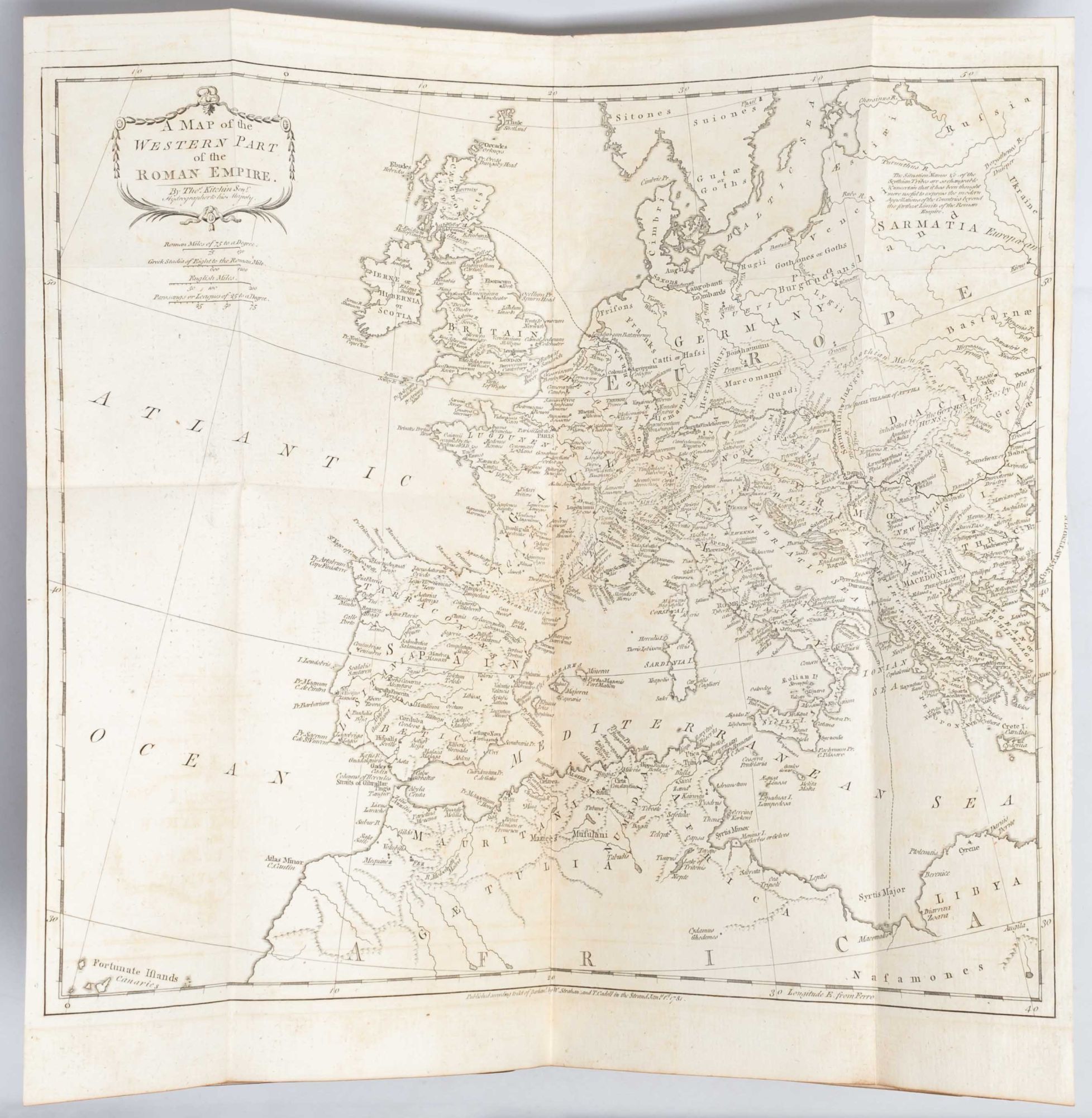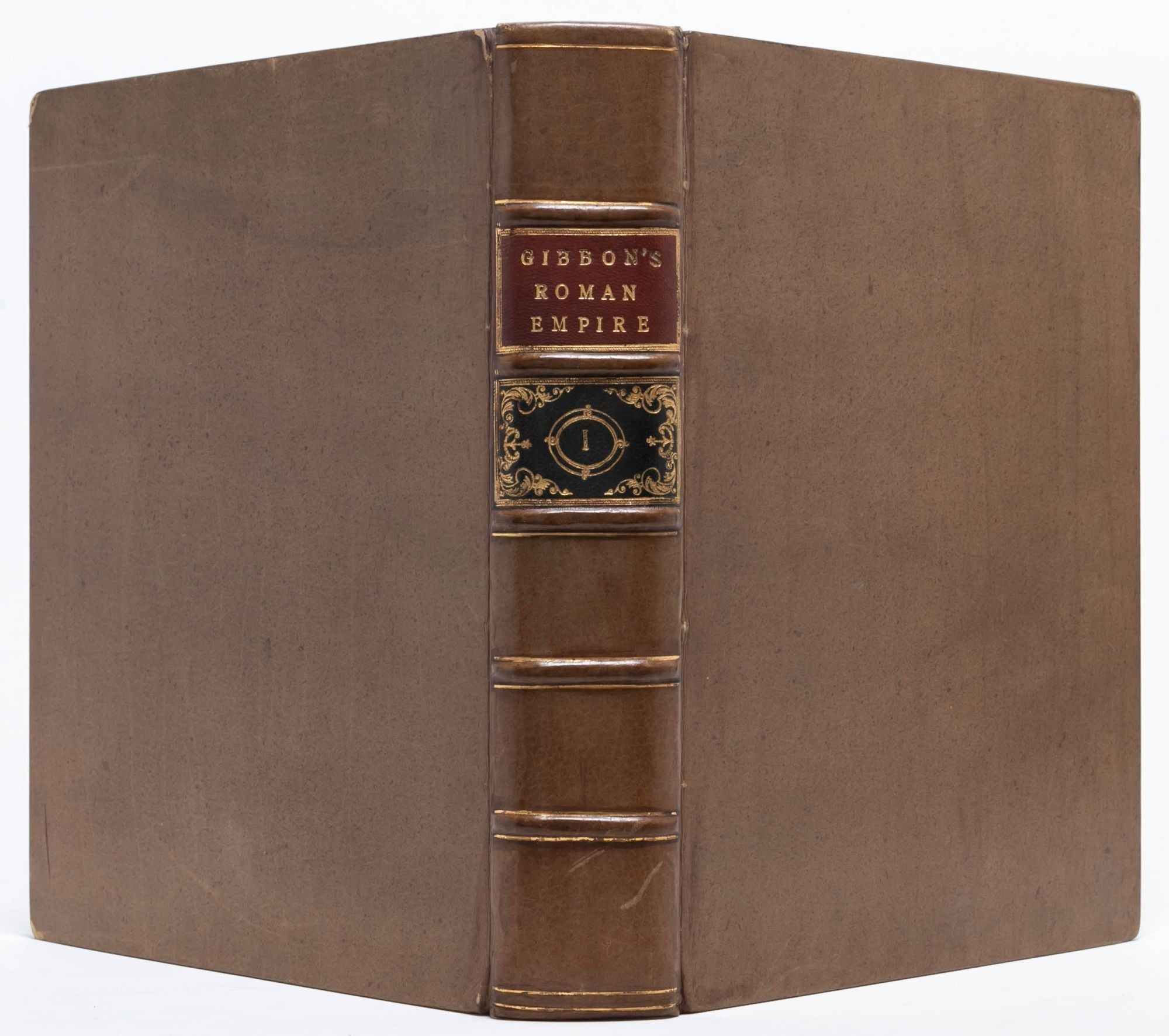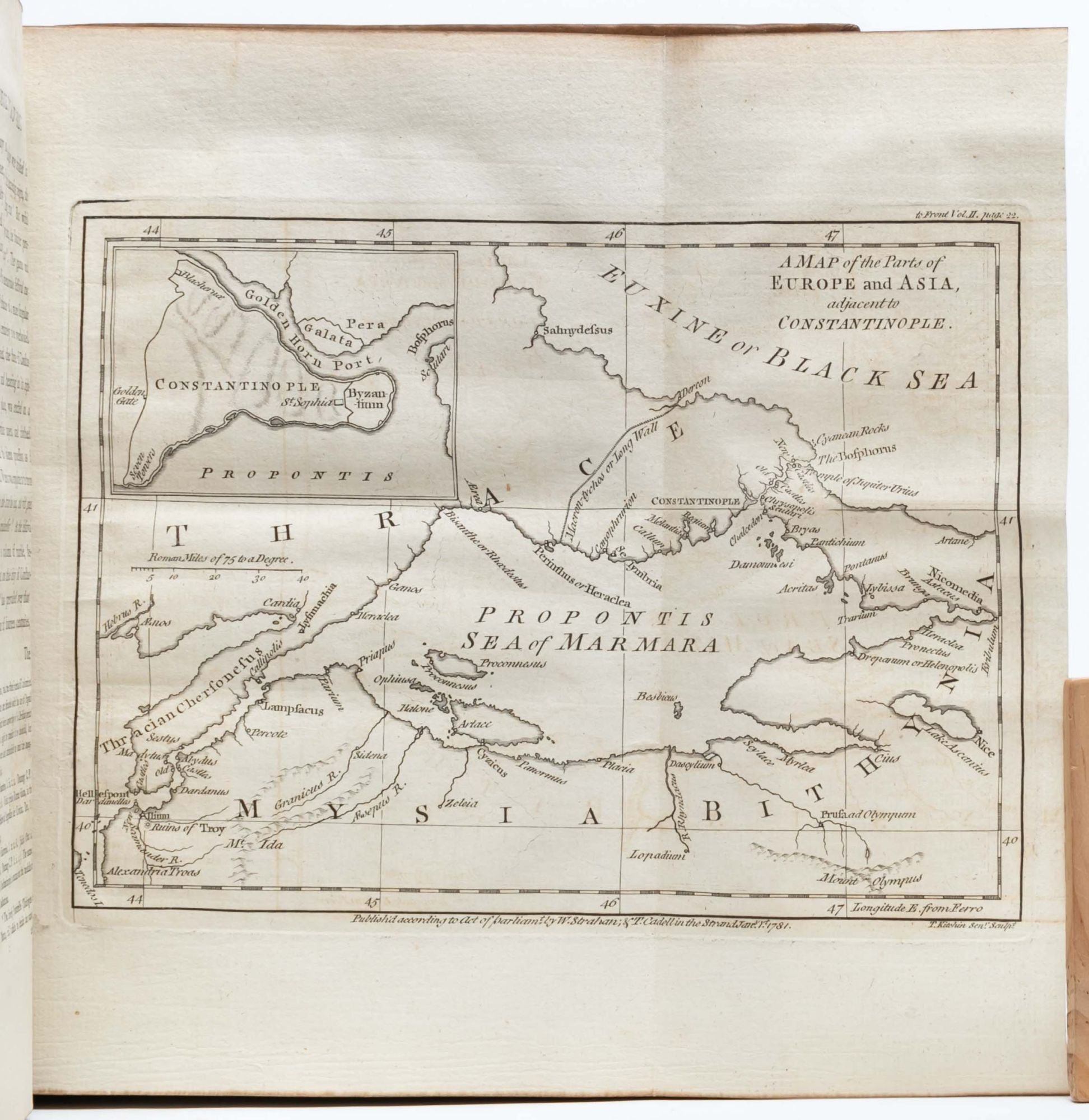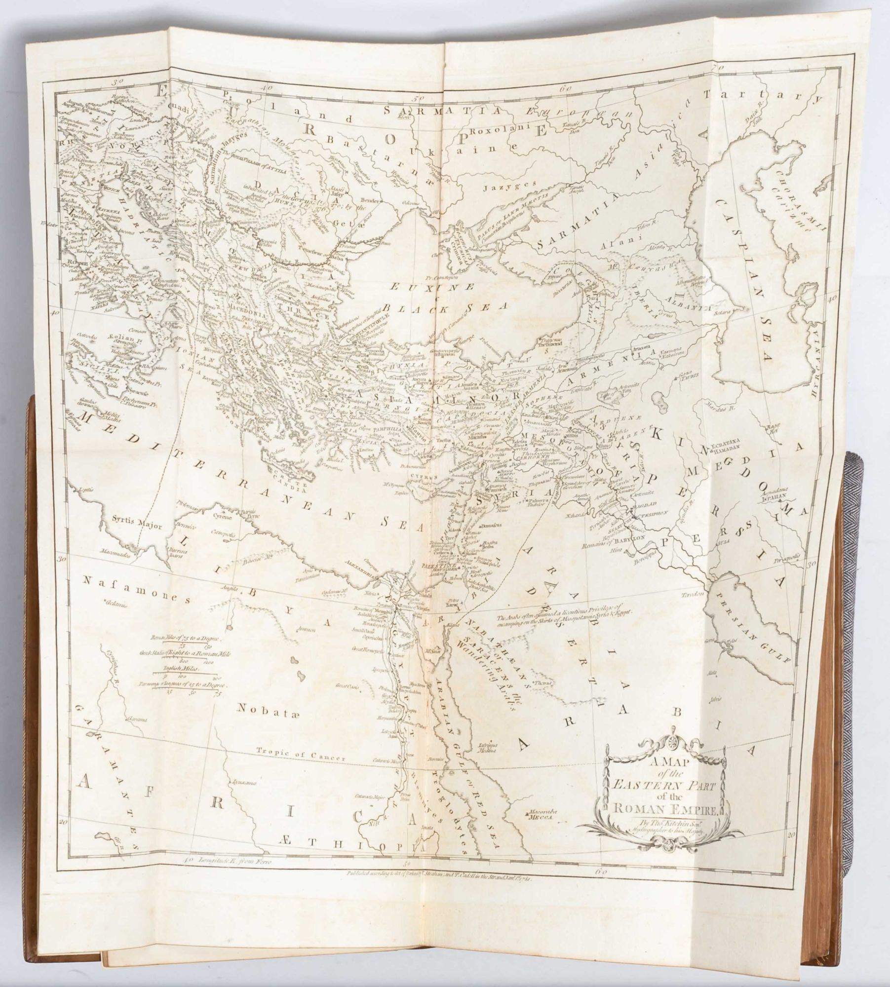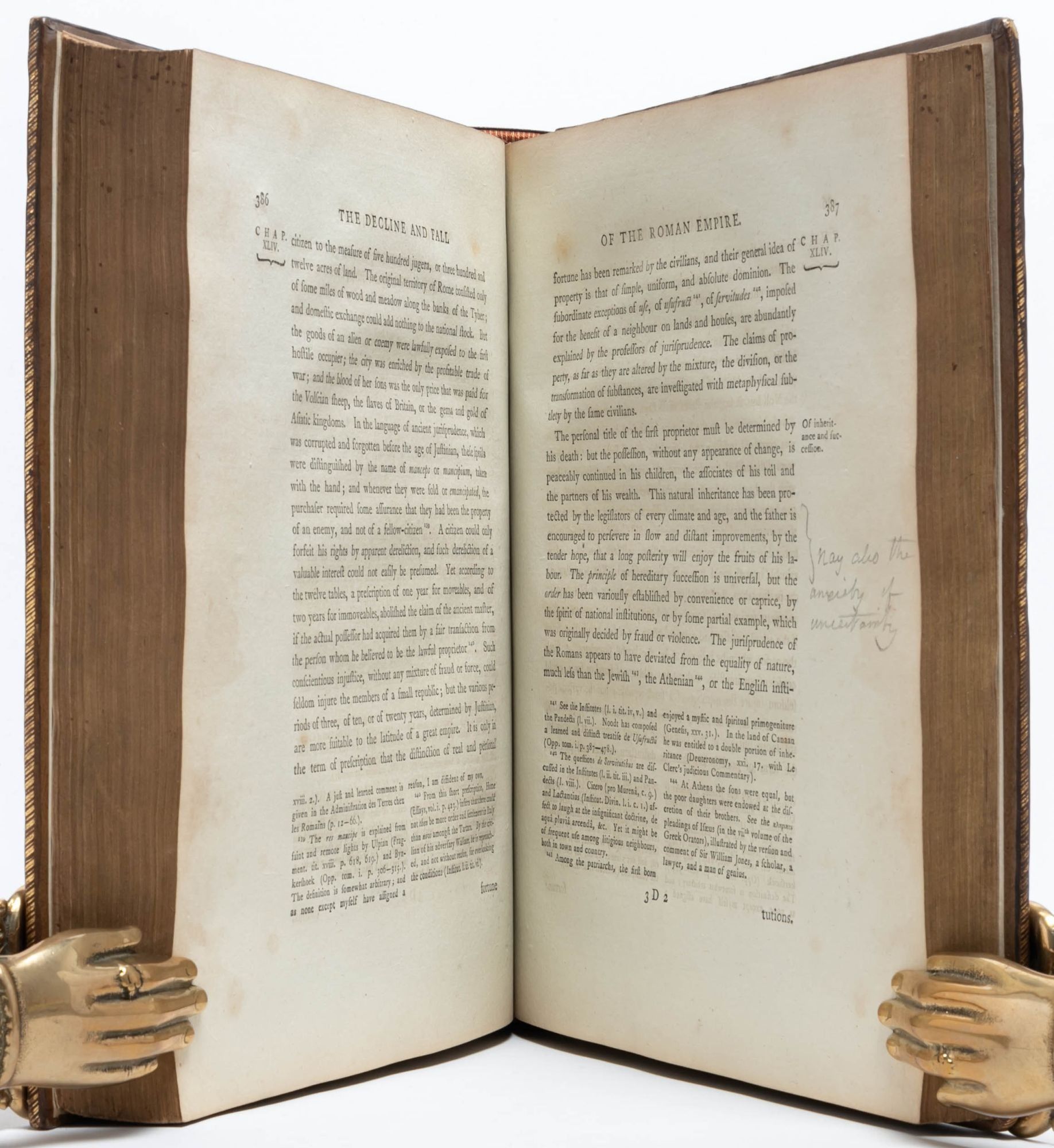 London: W. Strahan and T. Cadell in the Strand, 1788. First editions. First state of volume one (with all errata uncorrected and cancels as called for). Six volumes, quarto (volume one 264 x 213 mm., others 271 x 216 mm.) Modern full speckled calf to style. One volume with the book label of Dr. Sydney Ross (1915 - 2013), professor at Rensselaer Polytechnic Institute. Engraved portrait frontispiece by Hall after Joshua Reynolds (dated February 1, 1780) bound into volume two, as issued; two engraved maps in volume two; one engraved map in volume three (Western map bound into volume two and Eastern map bound into volume three). Complete with all half titles. Bindings in excellent condition overall. Various levels of foxing throughout, generally light to moderate, some leaves heavier. Early owner’s name on the title page to volume one, Robert Nicholson. A modern reader (possibly Dr. Ross) has made extensive marginal notations in pencil in volumes four through six as he engaged with the text. All bindings uniform in size, but the text block to volume one a bit shorter than the other volumes. Clearly a set that was made up at the time of rebinding. Each volume housed in a full speckled calf clamshell box. Very Good.