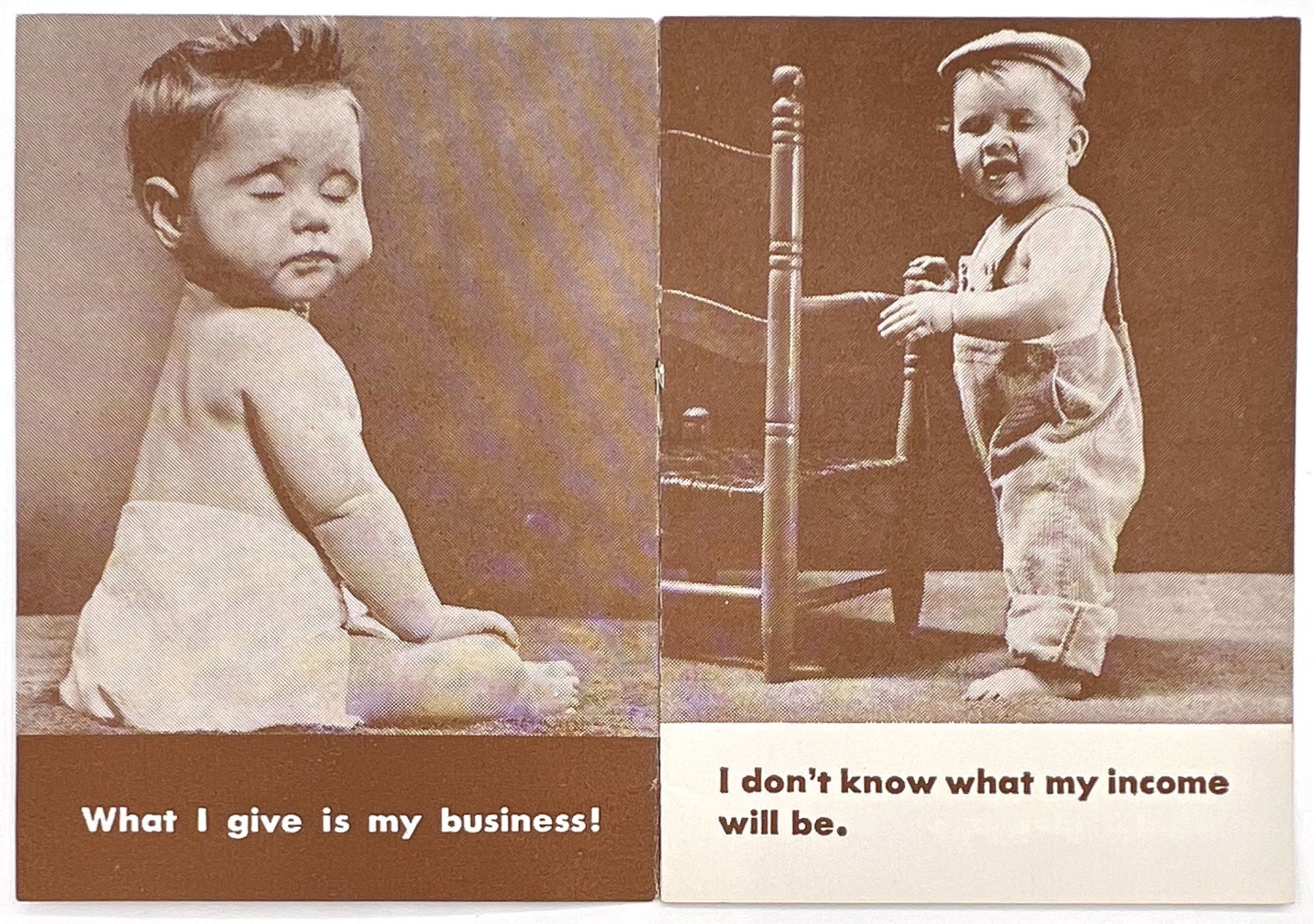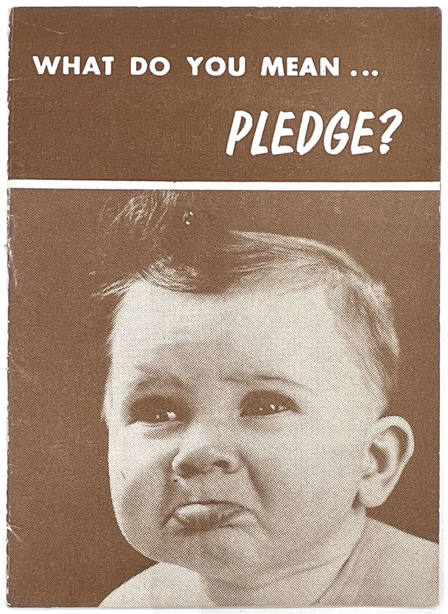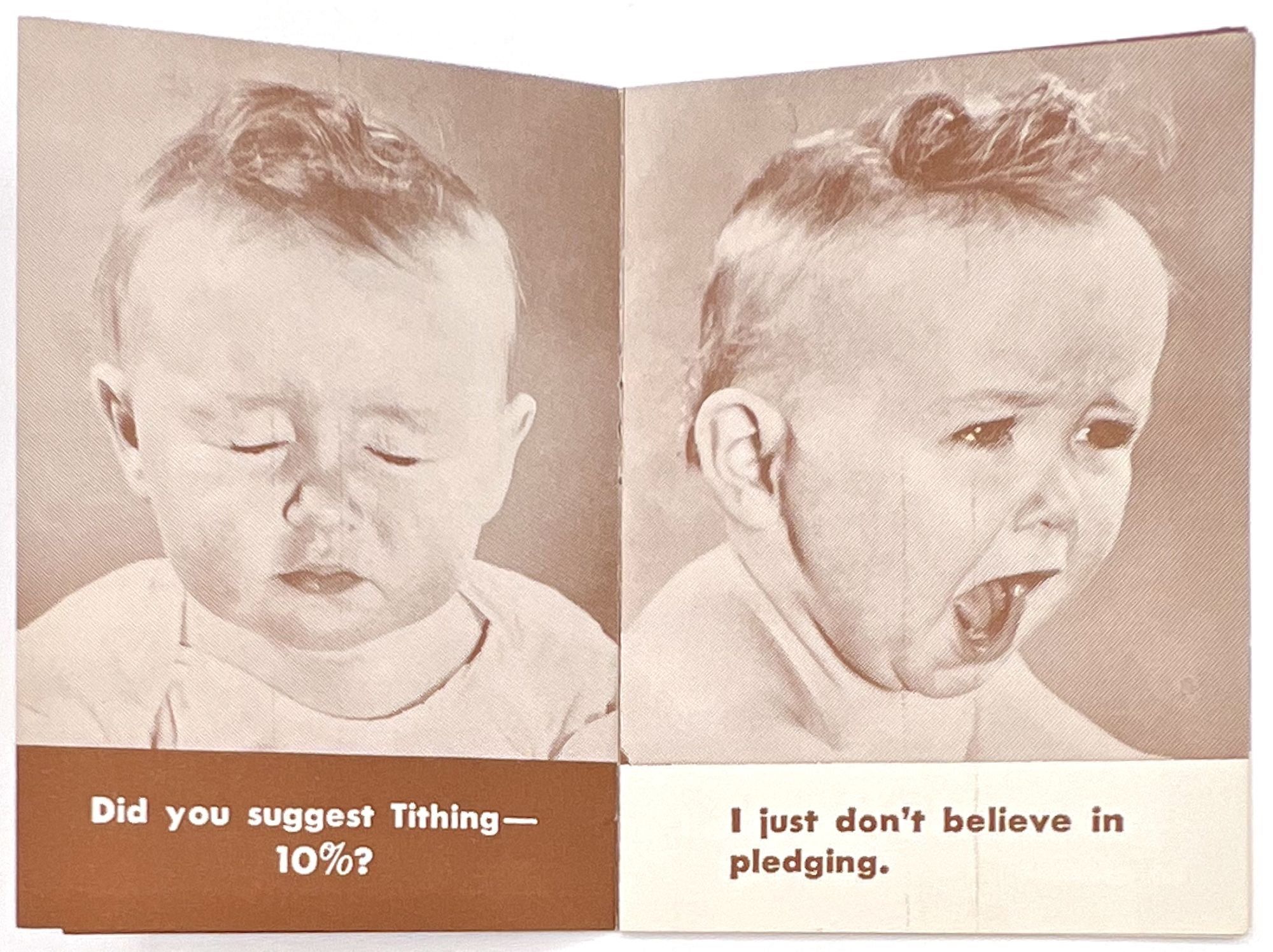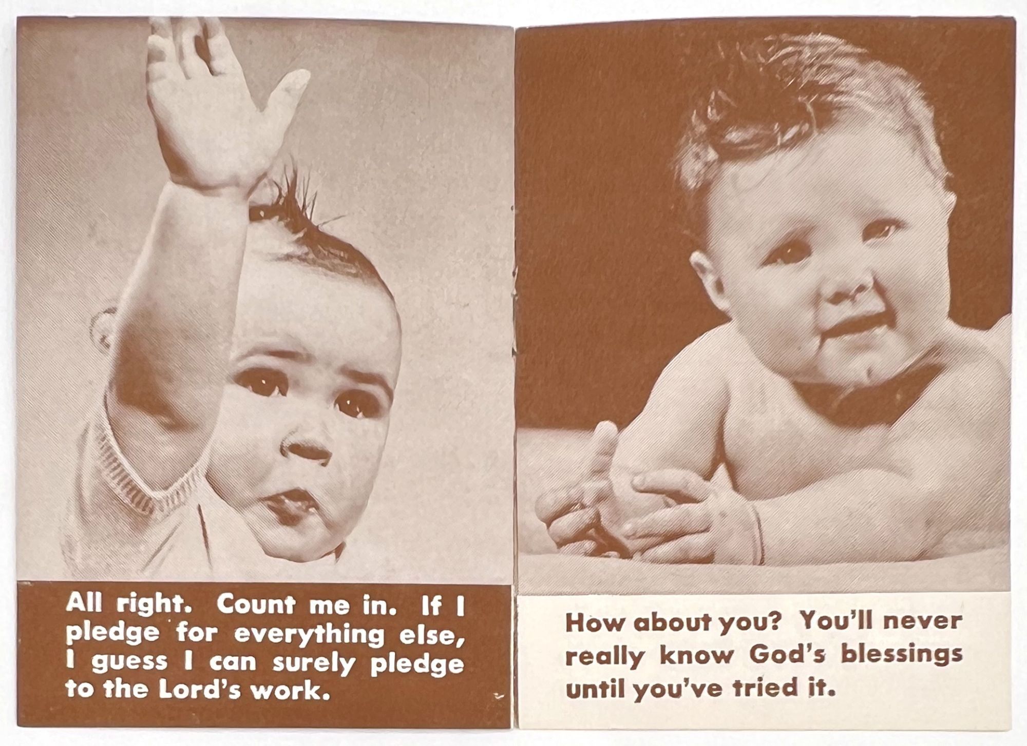Richmond, Virginia: Duplex Envelope Co, 1955. A humorous photo-illustrated booklet published for congregations to pass out to their flocks, encouraging them to pledge donations. Each page has a different smiling, confused, or silly looking baby, skeptical about the idea of pledging to the church. It ends, "All right. Count me in. If I pledge for everything else, I guess I can surely pledge to the Lord's work. How about you? You'll never really know God's blessing until you've tried it". We can imagine families giving a chuckle and emptying their pockets after reading. The Duplex Envelope Co. of Richmond made its mark in publishing with a novel new way for churches to collect donations: in envelopes with two different pockets, allowing parishioners to donate to different missions or causes (hence the name, "Duplex"). It became the largest publisher of church and benevolent envelopes. Single vol. (4" by 3"), pp. [12], photo illustrated.