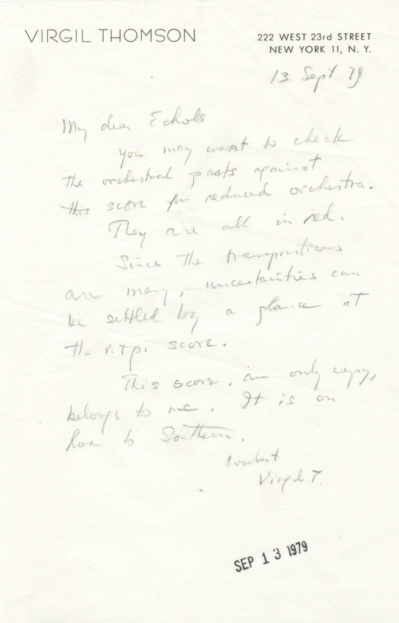 Thomson asks Echols to "check the orchestral parts against this score for reduced orchestra," saying that because of the numerous transpositions "uncertainties can be settled by a glance at the v. + p. score," and signing off with "Ever best Virgil T." An American composer and critic, "[Thomson] produced a sizeable catalog of stylistically diverse compositions characterized by expressive directness and textural transparency, written in a language that drew from hymnbook harmony, popular song, and dance idioms of the late 19th century, and utilizing plain-spoken tonal procedures but also diatonic dissonance and polytonal elements. In his many vocal works, and his two path-breaking operatic collaborations with Gertrude Stein, Thomson demonstrated a mastery of prosody. His settings of English convey American speech patterns with naturalness and clarity. He brought strong predilections for living composers and American music to his criticism. The wit, vitality, and descriptive precision of his writing, which demystified the complexities of music for lay readers, made him among the most influential and lasting critics of the 20th century." Anthony Tommasini and Richard Jackson in Grove Music Online.