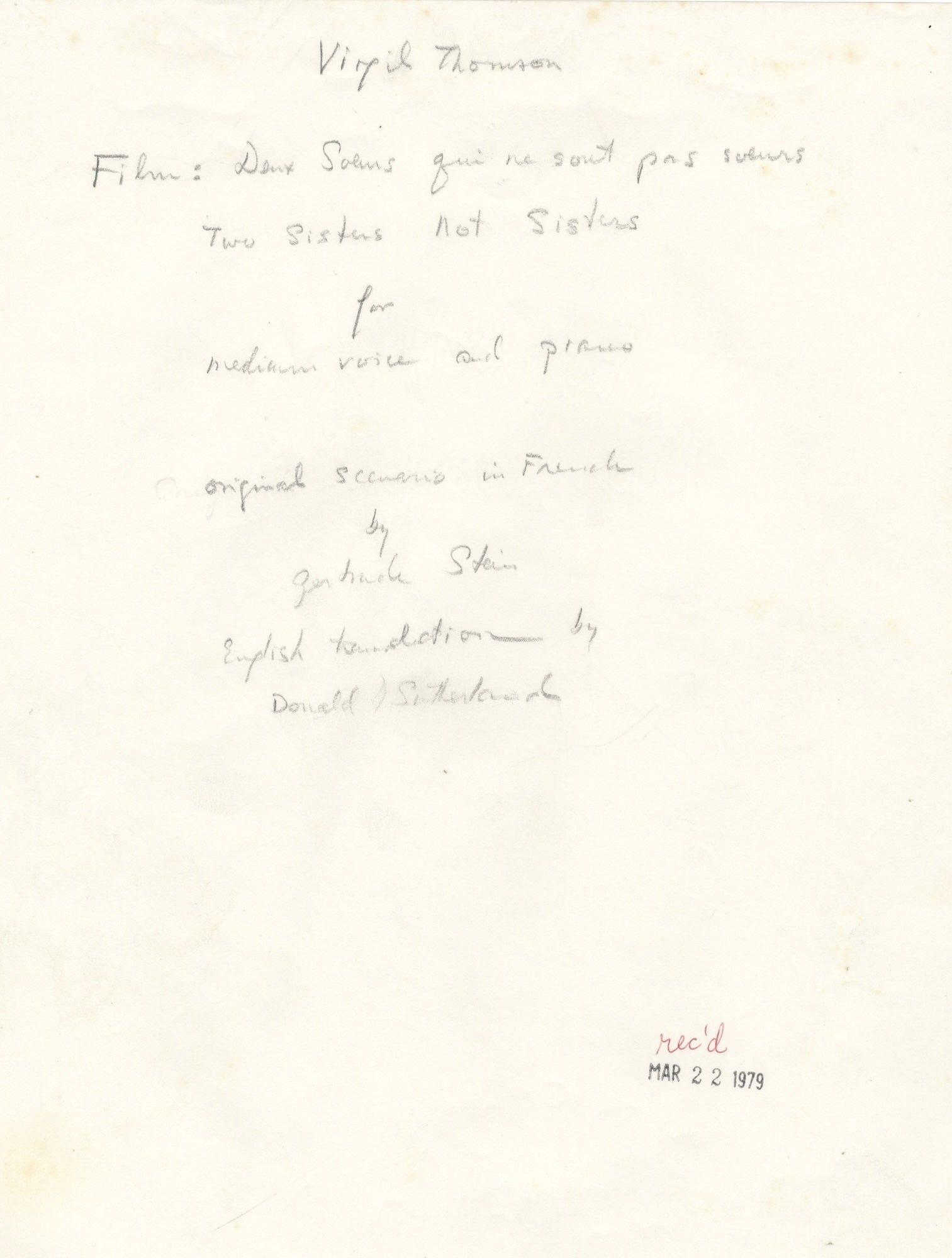 "Virgil Thomson. Film: Deux Soeurs qui ne sont pas soeurs. Two Sisters Not Sisters for medium voice and piano. Original scenario in French by Gertrude Stein. English translation by Donald Sutherland."