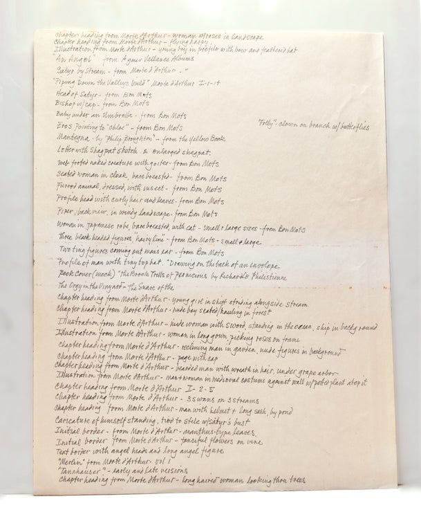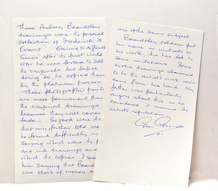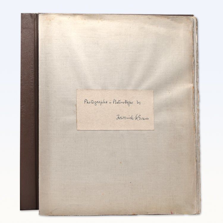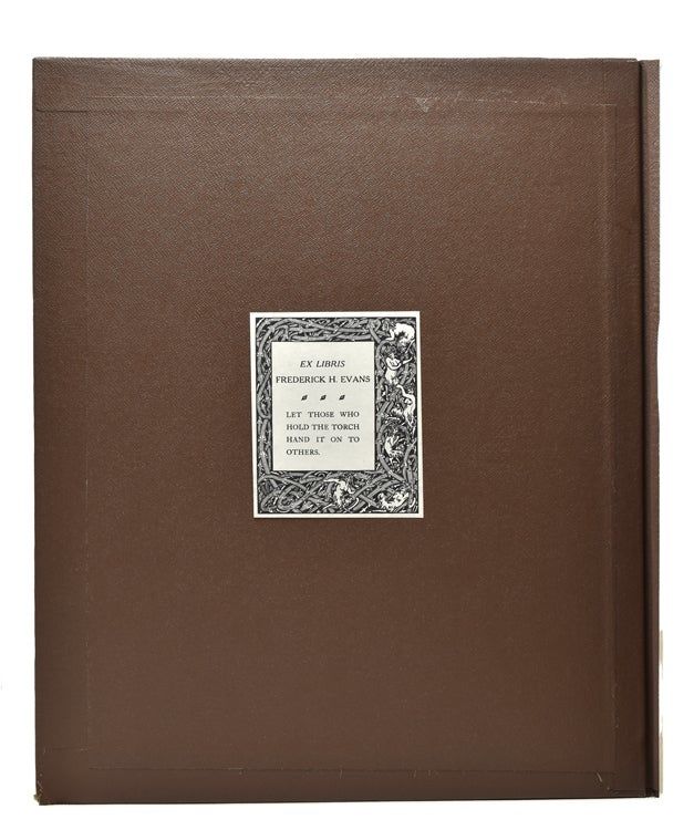 Each image captioned by Evans and mounted on grey card with E. vans' blind stamp monogram. Large 4to. Cloth, with the booplate of Frederick Evans designed by Beardsley. Each image captioned by Evans and mounted on grey card with E. vans' blind stamp monogram. Large 4to. With a long autograph note signed by Evan Evans, Frederick Evans' son about the provenance of these platinotypes. Reading in part: "Owing to difficult times after the first World War he was forced to sell the originals but before doing so, he copied them in the platinum process. These photographic prints are more permanent than the original drawings because they will never fade....My father asked Beardsley to design a bookplate for his considerable library. The one chosen is on the inside cover of the portfolio...