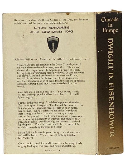 Garden City, New York: Doubleday & Company, Inc, 1948. First Trade Edition. Hard Cover. Near Fine/Very Good. 8x5x1. First trade edition, following the scarce limited edition. Near fine in very good jacket. Jacket edges lightly rubbed with an 1/8 inch chip from rear edge, jacket price clipped. 1948 Hard Cover. xiv, 559 pp. 8vo. Map illustrated endpapers. Photographs and maps throughout. Maps by Rafael Palacios. Five-star General Dwight D. Eisenhower was arguably the single most important military figure of World War II. For many historians, his memoirs of this eventful period of U.S. history have become the single most important record of the war. Crusade in Europe tells the complete story of the war as Eisenhower planned and lived it. Through his eyes, the enormous scope and drama of the war - strategy, battles, moments of fateful decision - become fully illuminated in all their fateful glory. Yet this is also a warm and richly human account. Ike recalls the long months of waiting, planning, and working toward victory in Europe. His personal record of the tense first hours after he had issued the order to attack - and there was no turning back - leaves no doubt of Eisenhower's travail and reveals this great man in ways that no biographer has ever surpassed.