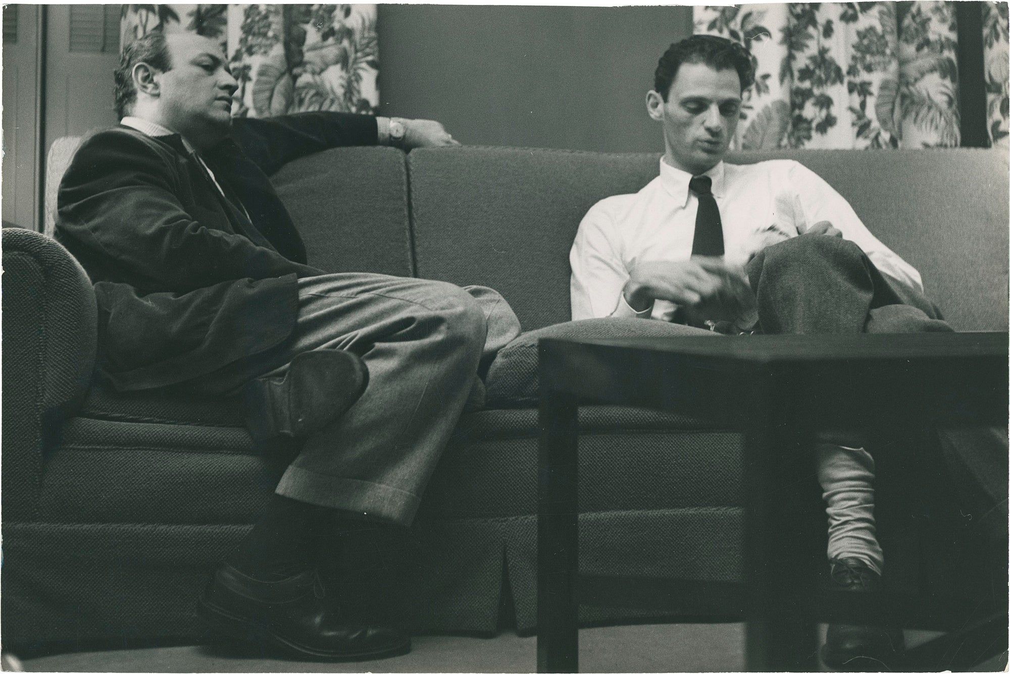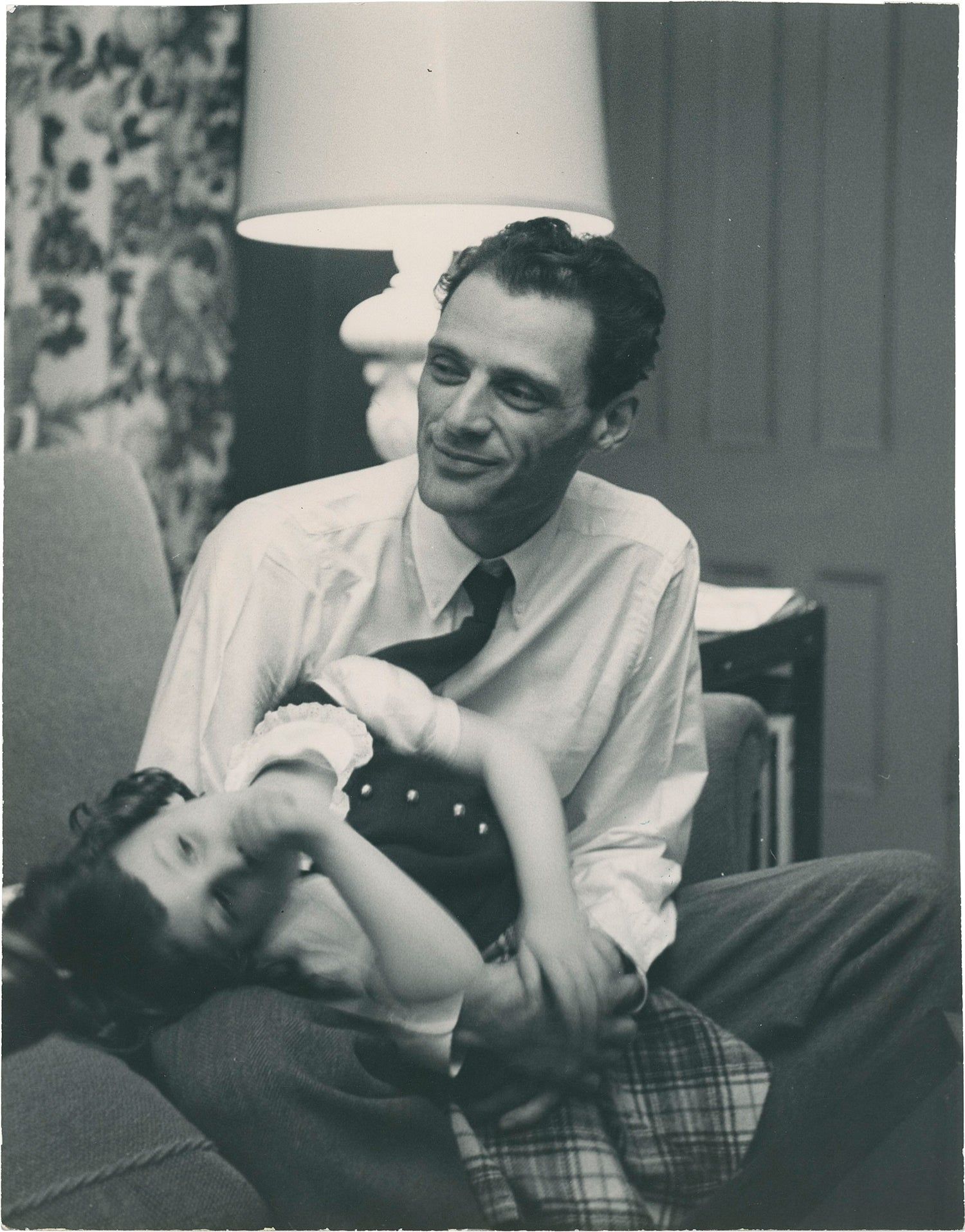 N.p.: N.p., 1940. Two vintage borderless double weight photographs of Arthur Miller at home, one showing Miller with his daughter Jane Ellen, the other showing him with theatrical producer Kermit Bloomgarden, circa late 1940s. Both photographs with PIX agency stamps crediting photographer Martin Harris on the verso.