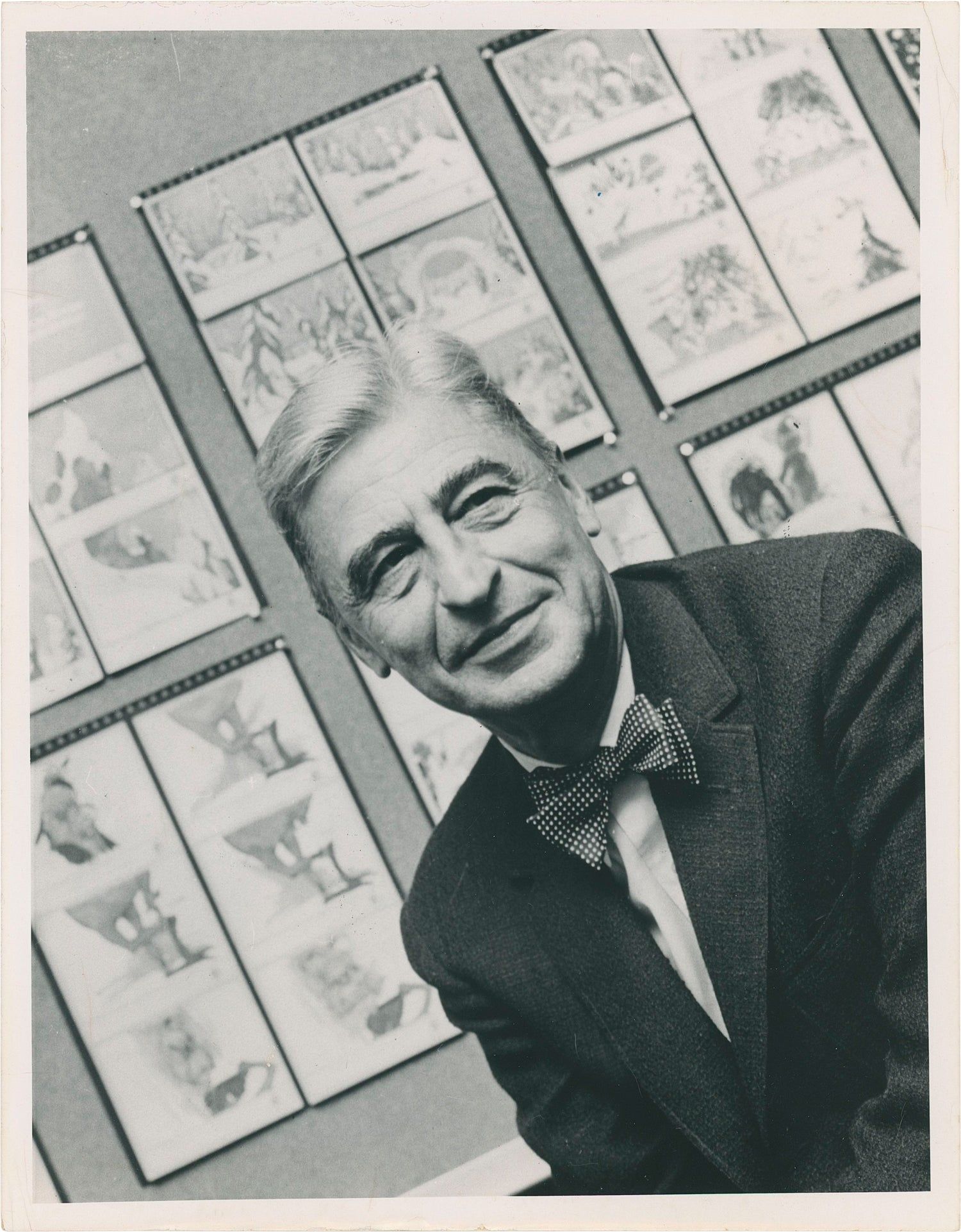 N.p.: N.p., 1968. Vintage photograph of Theodor Seuss Geisel, better known as Dr. Seuss, circa 1968, posed in front of several storyboards for the 1966 animated adaptation of the 1957 children's book "How the Grinch Stole Christmas." Date stamp on the verso reading December 18, 1968.