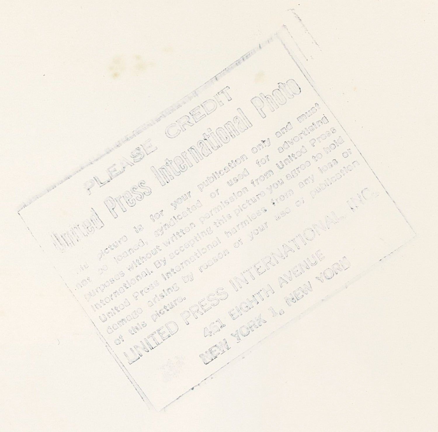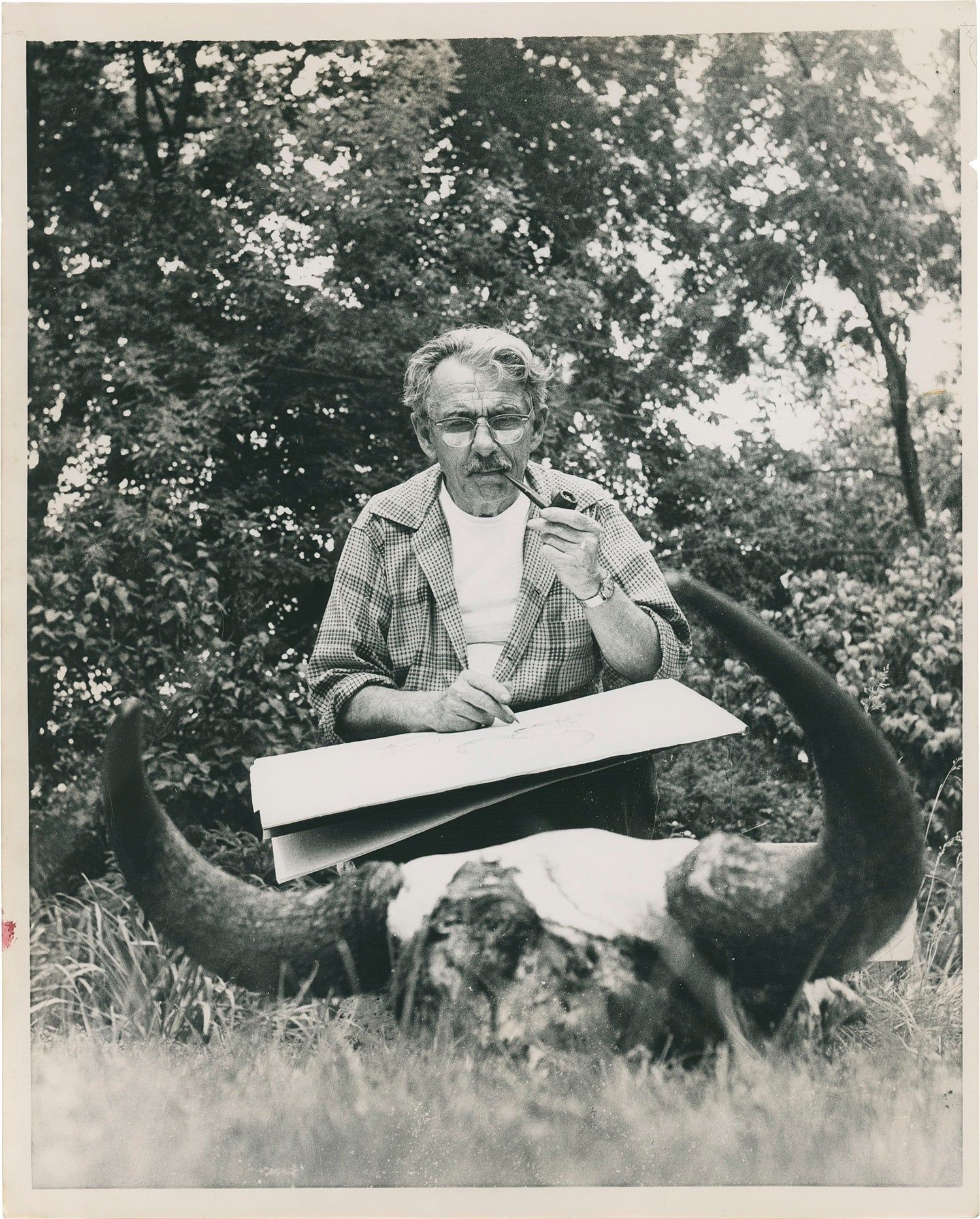 New York: United Press International, 1959. Vintage press photograph of Regionalist painter and muralist Thomas Hart Benton sketching a buffalo skull outdoors in 1959. Printed mimeo snipe and United Press International stamp on the verso.