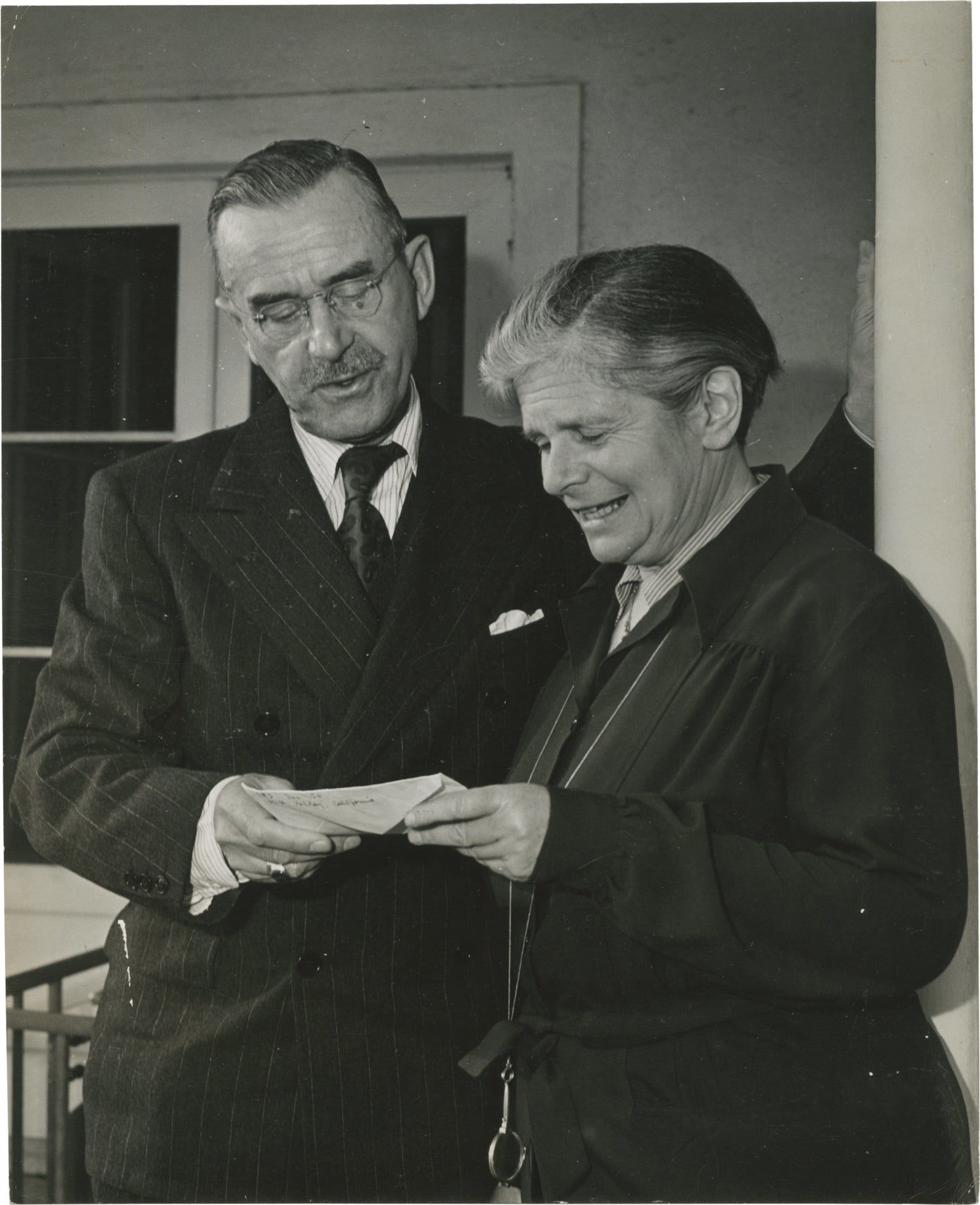 N.p.: N.p., 1954. Vintage press photograph of German writer and social critic Thomas Mann with his wife, Katia Pringsheim, circa 1946. Printed mimeo snipe and PIX agency stamp crediting "Life" magazine photographer Paul Dorsey on the verso.
