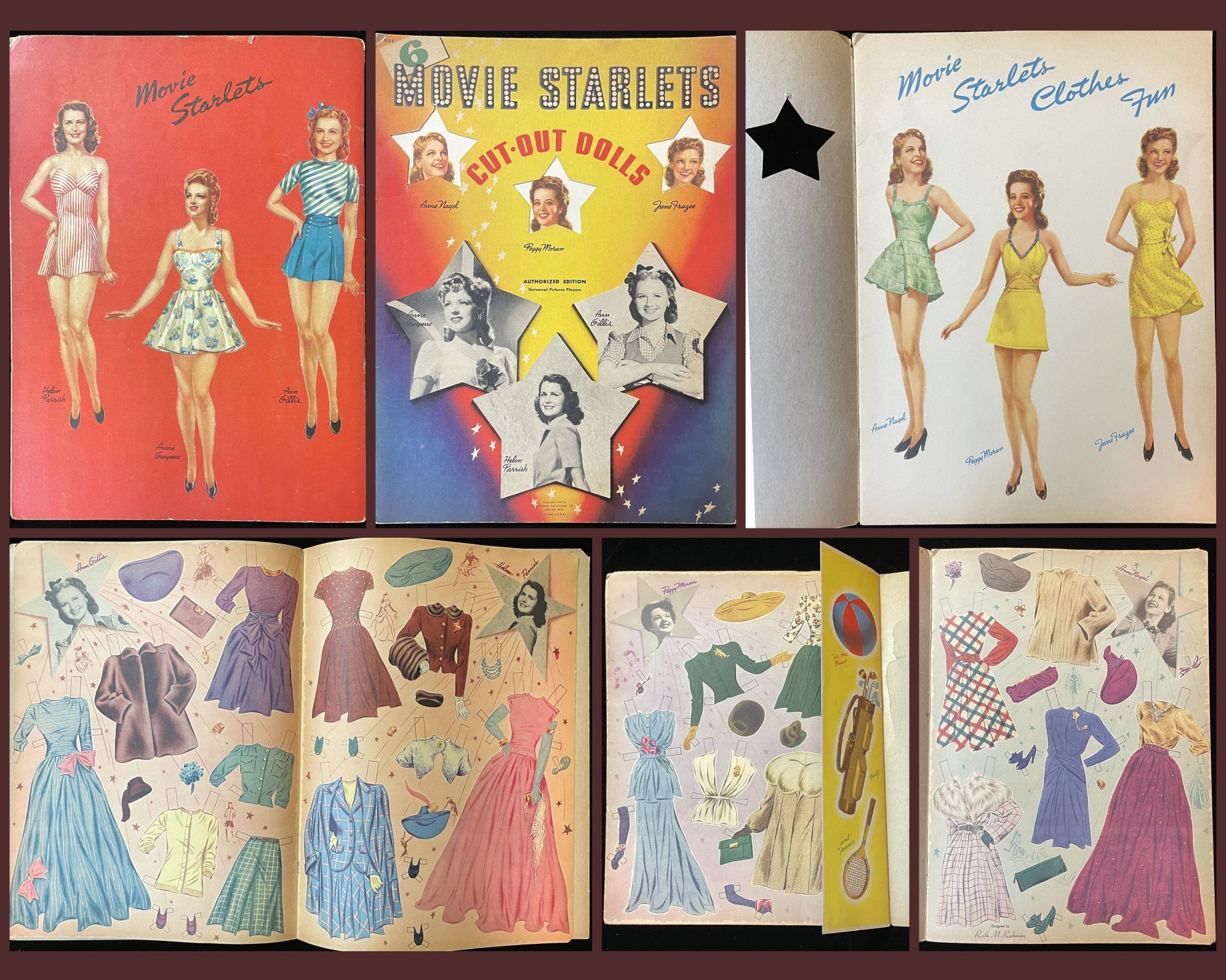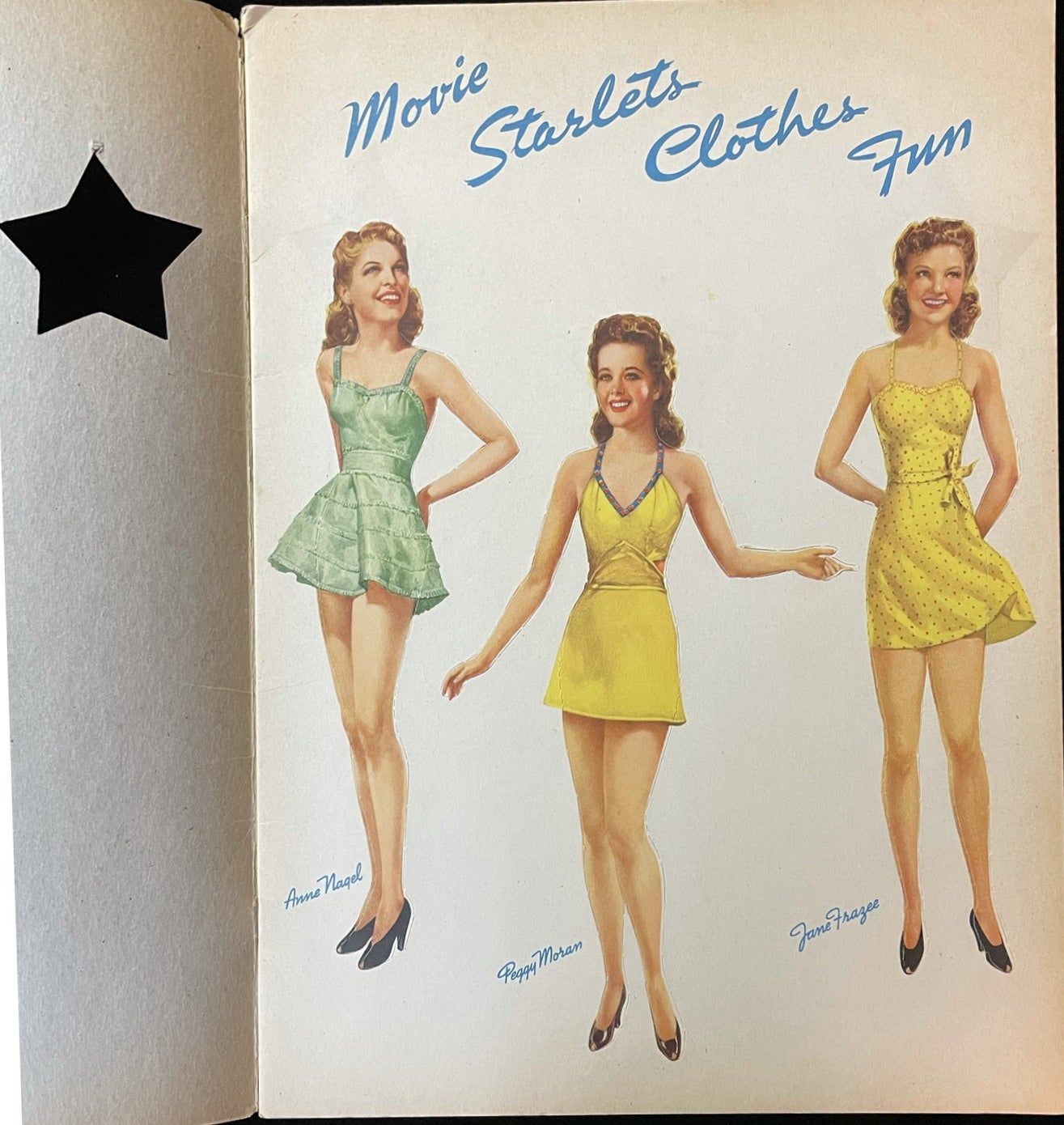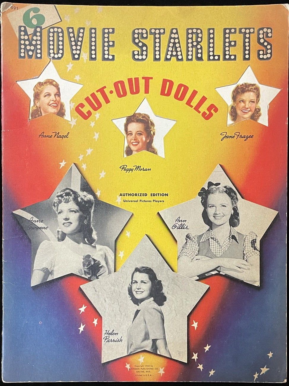 Racine, Wis: Whitman Publ. Co., Authorized Edition. Universal Pictures Players, 1942. Edge wear; small corner chip upper left corner.. A 14 3/4" x 11" with die-cut stars on the cover showing the dolls behind. (Six) 6 punch out dolls - the first three are captioned "Move Starlets Clothes Fun. There are 6 costume pages; one for each starlet including an image from a photo of the star. Consists of movie star finery. The starlets include Anne Nagel, Peggy Moran, Jane Frazer, Anne Gwynne, Helen Parrish and Ann Gillis.