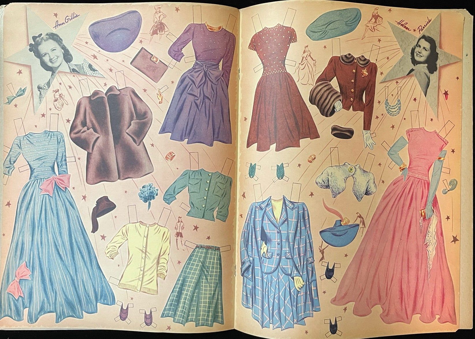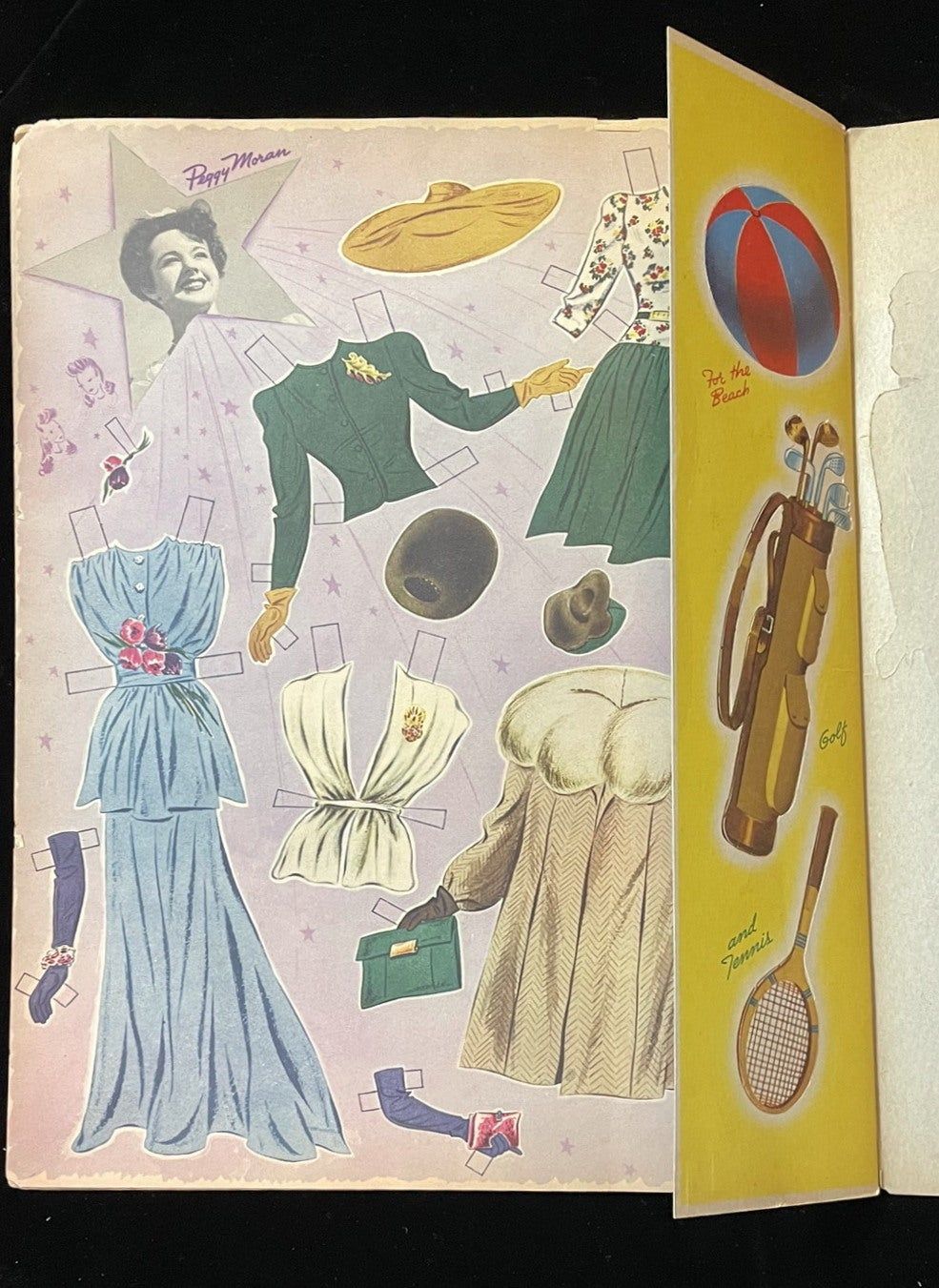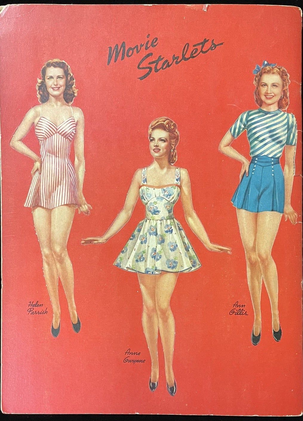 Racine, Wis: Whitman Publ. Co., Authorized Edition. Universal Pictures Players, 1942. Edge wear; small corner chip upper left corner.. A 14 3/4" x 11" with die-cut stars on the cover showing the dolls behind. (Six) 6 punch out dolls - the first three are captioned "Move Starlets Clothes Fun. There are 6 costume pages; one for each starlet including an image from a photo of the star. Consists of movie star finery. The starlets include Anne Nagel, Peggy Moran, Jane Frazer, Anne Gwynne, Helen Parrish and Ann Gillis.