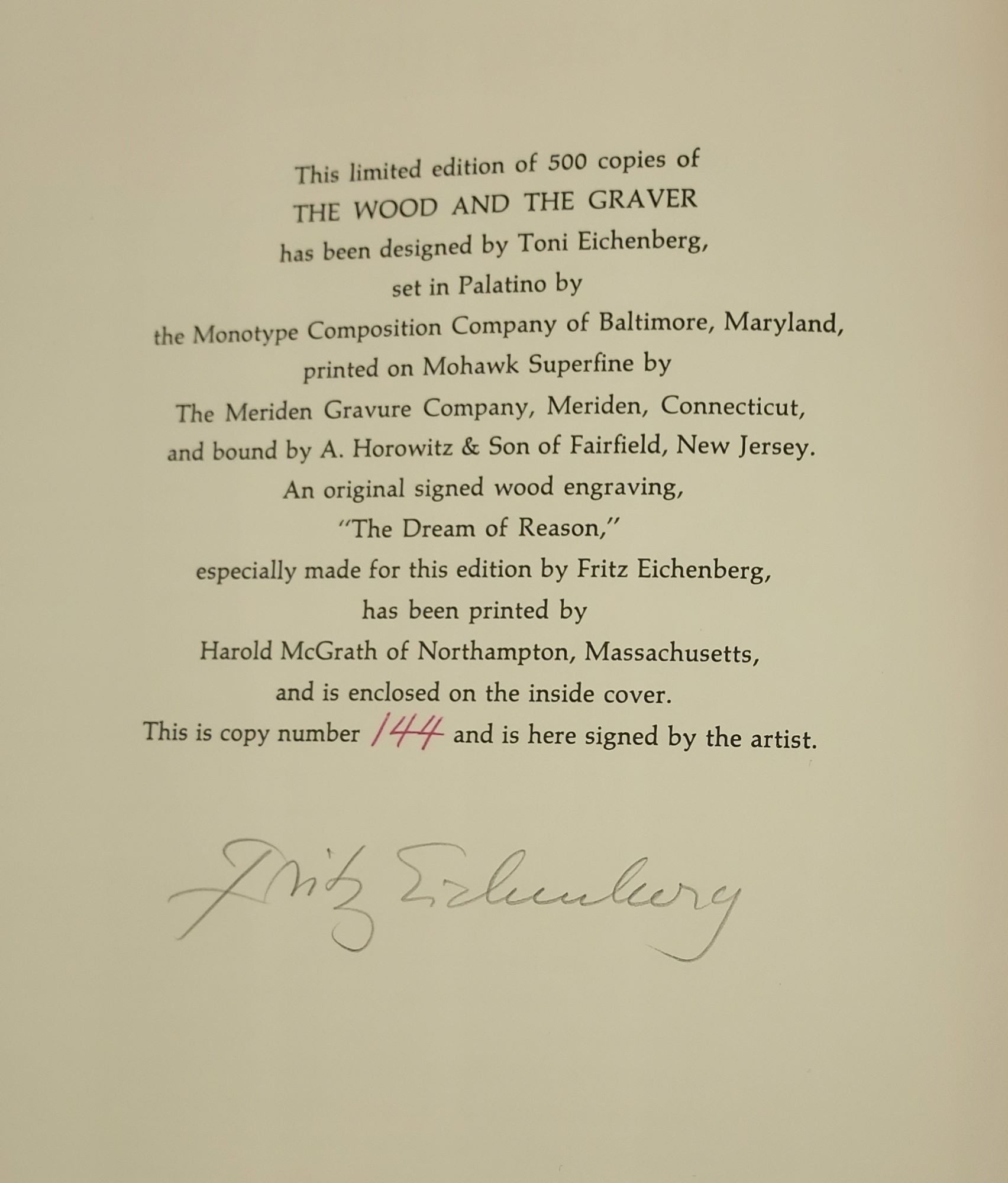 Barre, MA: Imprint Society, 1977. Limited First Edition. Leather bound. SIGNED. 199pp. Quarto [30.5 cm] 1/4 red leather with gray cloth over boards, and housed in a gray board slipcase. Near fine. With a very faint waviness to the top edge of the text block. In a very good slipcase, with light spotting to the spine, bottom edge, and the surrounding areas of the panels. With about a hundred black and white woodblock prints from the renowned artist. Includes a signed print, "The Dream of Reason," laid in at the rear. Number 144 in an edition limited to 500, designed by Toni Eichenberg, and printed on Mohawk Superfine by The Meriden, Connecticut, and bound by A. Horowitz & Son of Fairfield, New Jersey. Signed by Fritz Eichenberg on the limitation page.