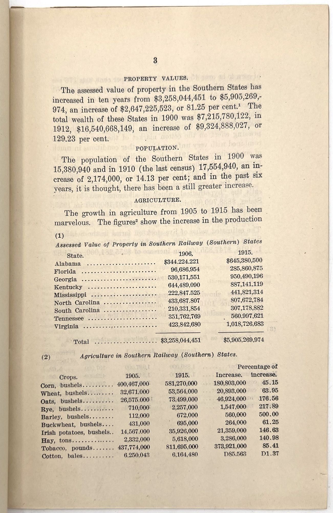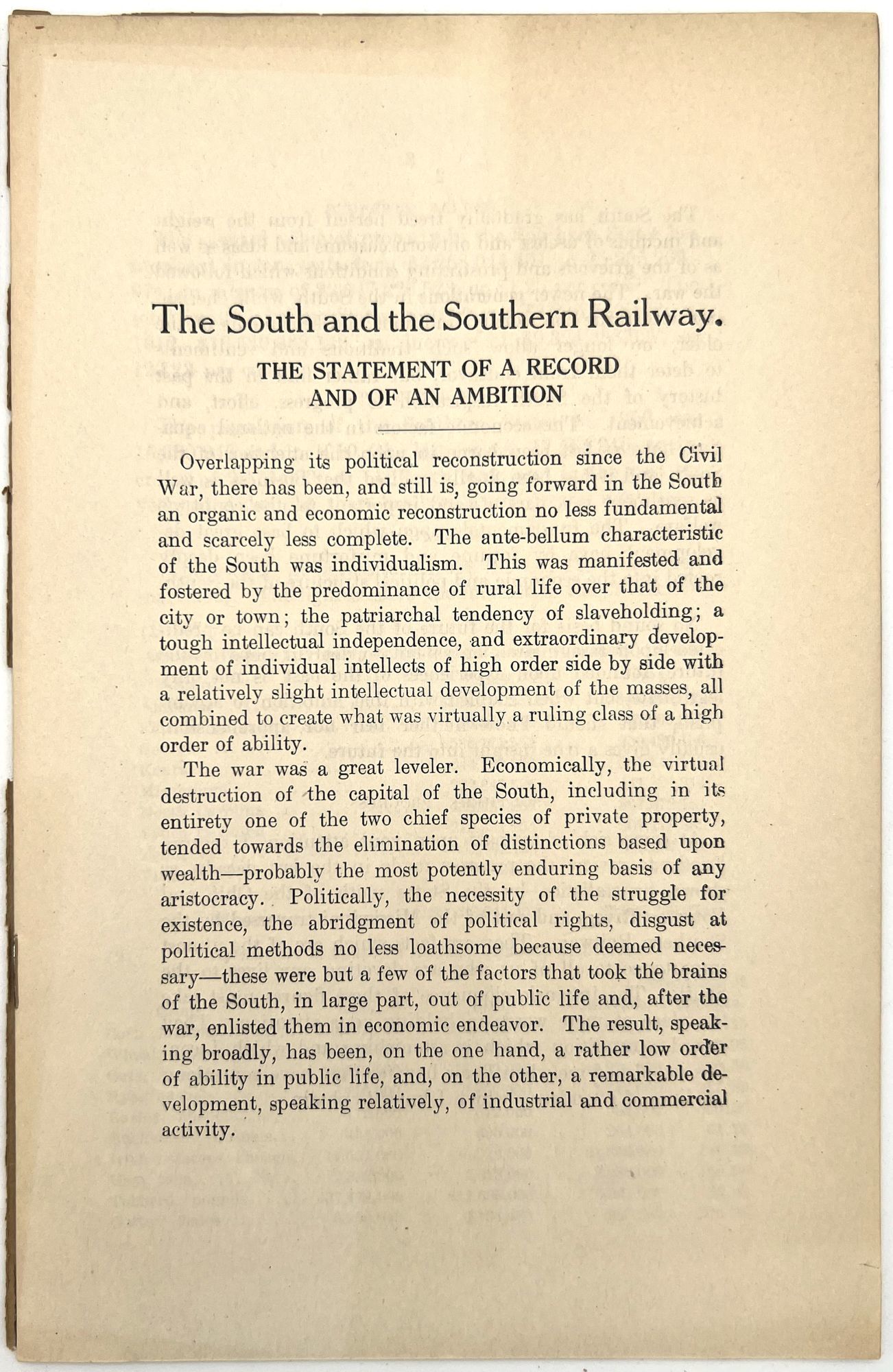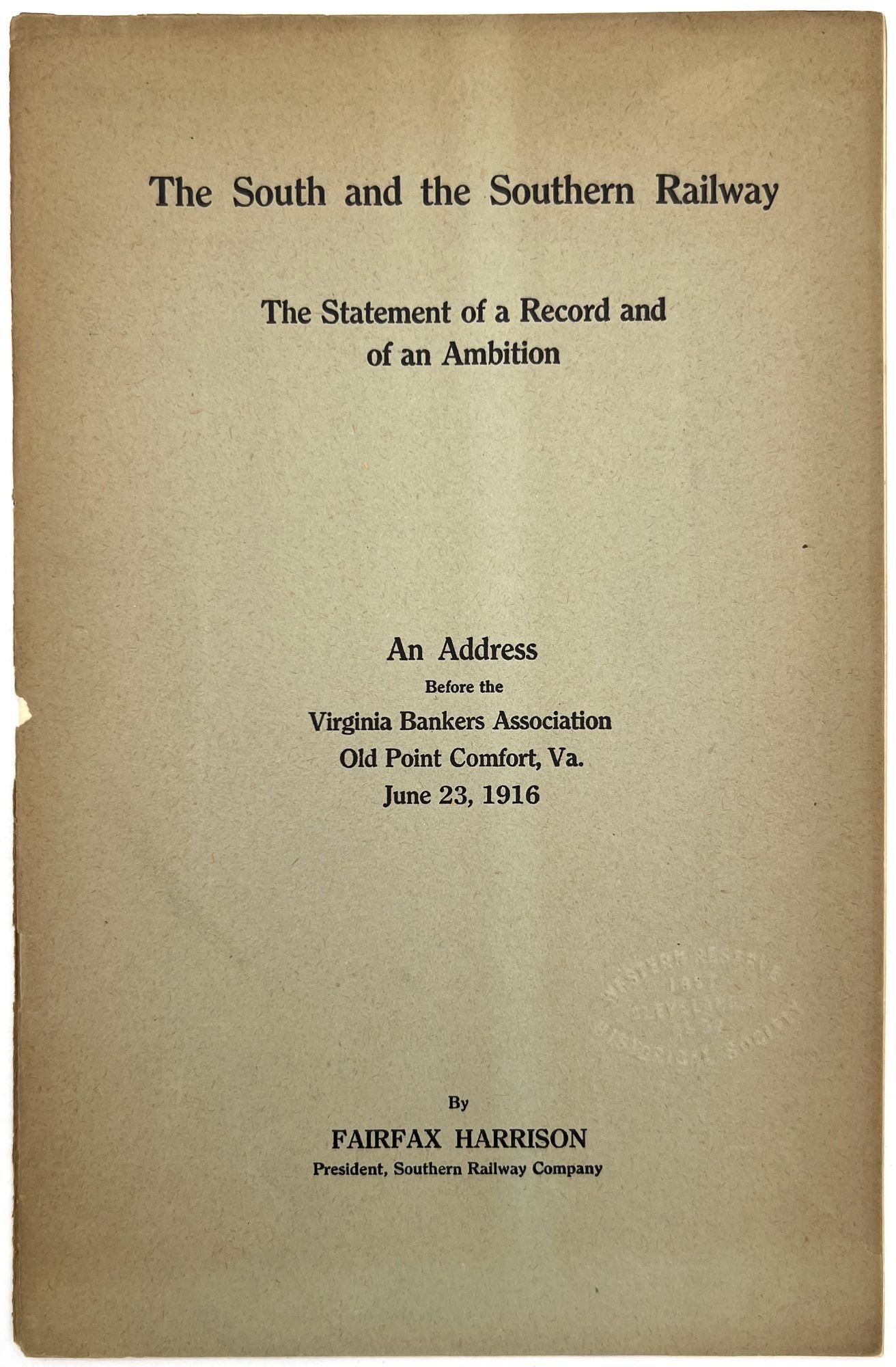N.pl: N.p., 1916. Fair. Toned with short tears/damage to spine, wrappers detached.. A 1916 address given to the Virginia Bankers Association by Fairfax Harrison (1869-1938), an American businessman and lawyer for the Southern Railway Company. Advocating for developing railways in the South, Harrison begins his speech by rooting his aims in Reconstruction: "Overlapping its political reconstruction since the Civil War, there has been, and still is, going forward in the South an organic and economic reconstruction no less fundamental and scarcely less complete. The ante-bellum characteristic of the South was individualism. This was manifested and fostered by the predominance of rural life ... the patriarchal tendency of slave holding ... the war was a great leveler" (p. [1]). Includes tables of economic and agricultural data showing growth and the need for railroads. Single vol. (9" by 6"), pp. 16, in original printed wrps. Blind stamp of Western Reserve Historical Society to upper wrapper with discharge ink stamp to verso. Fairfax Harrison (1869-1938) was an American businessman and lawyer for the Southern Railway Company beginning in 1896.