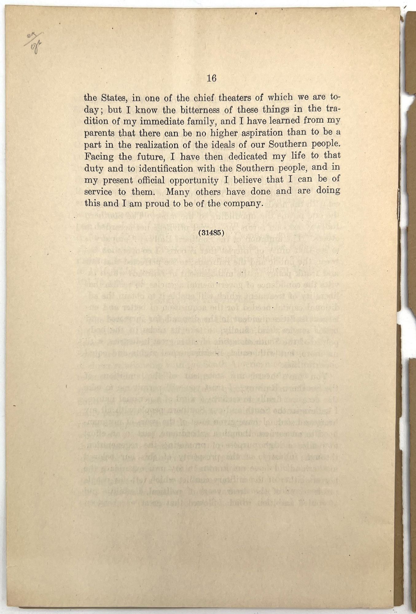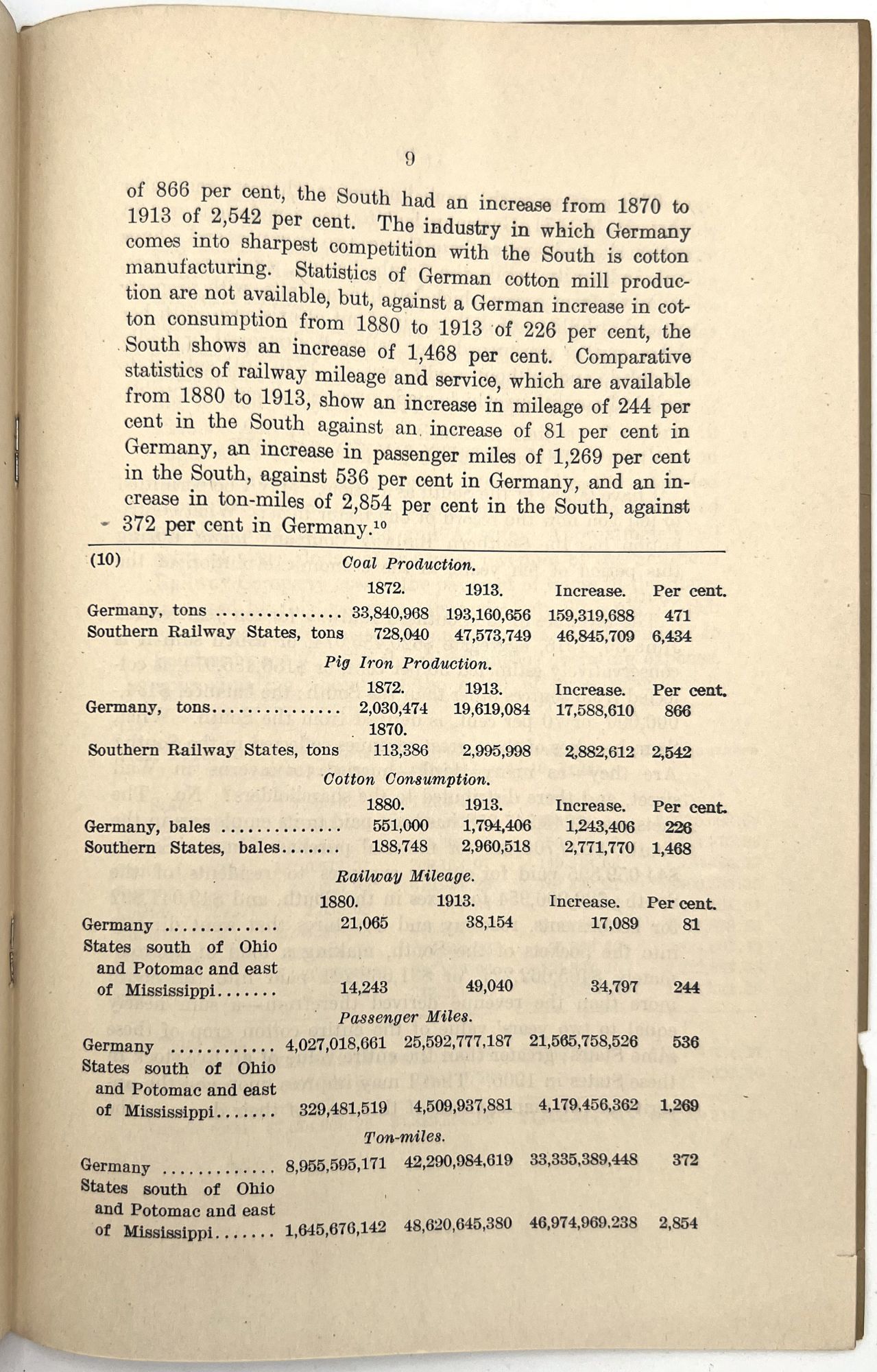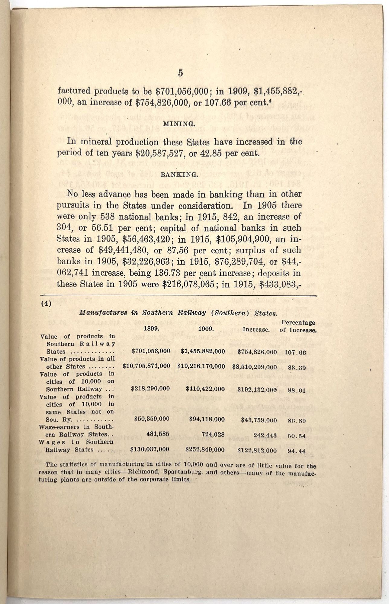 N.pl: N.p., 1916. Fair. Toned with short tears/damage to spine, wrappers detached.. A 1916 address given to the Virginia Bankers Association by Fairfax Harrison (1869-1938), an American businessman and lawyer for the Southern Railway Company. Advocating for developing railways in the South, Harrison begins his speech by rooting his aims in Reconstruction: "Overlapping its political reconstruction since the Civil War, there has been, and still is, going forward in the South an organic and economic reconstruction no less fundamental and scarcely less complete. The ante-bellum characteristic of the South was individualism. This was manifested and fostered by the predominance of rural life ... the patriarchal tendency of slave holding ... the war was a great leveler" (p. [1]). Includes tables of economic and agricultural data showing growth and the need for railroads. Single vol. (9" by 6"), pp. 16, in original printed wrps. Blind stamp of Western Reserve Historical Society to upper wrapper with discharge ink stamp to verso. Fairfax Harrison (1869-1938) was an American businessman and lawyer for the Southern Railway Company beginning in 1896.